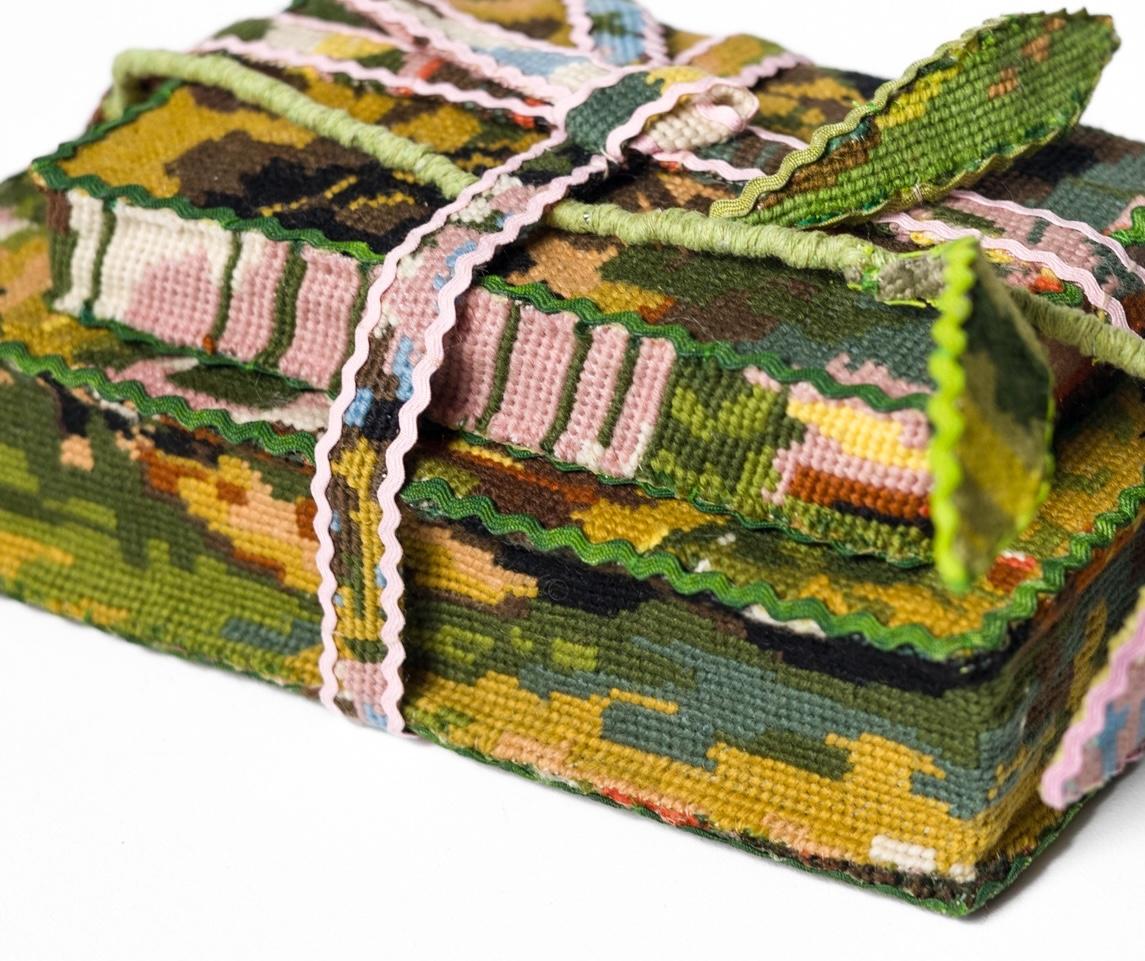 "Present" is an original piece by Ulla-Stina Wikander that can be wall-mounted or be free standing. This piece is made from sourcing vintage needlepoint embroidery and expertly hand-sewing and wrapping it into the shape a flower, ribbon, and covering books. This piece measures approx. 6"h x 10"w x 7"d and ships with a gallery-issued Certificate of Authenticity.
