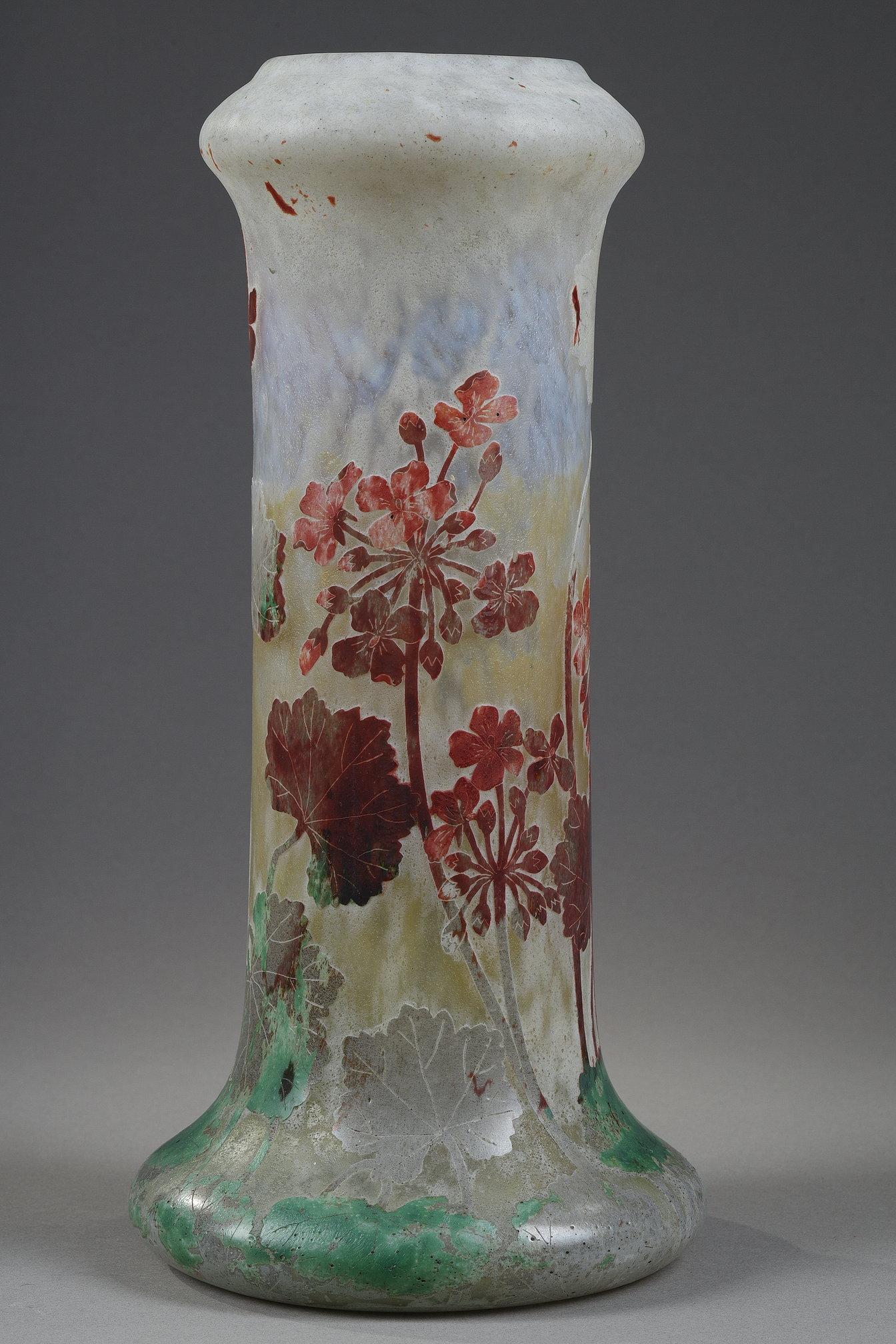 In 1878, lawyer Jean Daum took over the ownership of a glassworks as payment for a debt and installed his sons as proprietors. Initially, Daum made glass for everyday purposes such as windows, watches and tableware, but the success that Gallé enjoyed at the 1889 Universal Exposition in Paris — the international showcase for which the Eiffel Tower was built — inspired the Daum brothers to begin making art-glass pieces. They produced popular works of cameo glass, a decorative technique in which an outer layer of glass is acid-etched or carved off to reveal the layer below, but Daum became best known for vessels and sculptures in pâte de verre — a painstaking method in which finely ground colored glass is mixed with a binder, placed in a mold and then fired in a kiln.