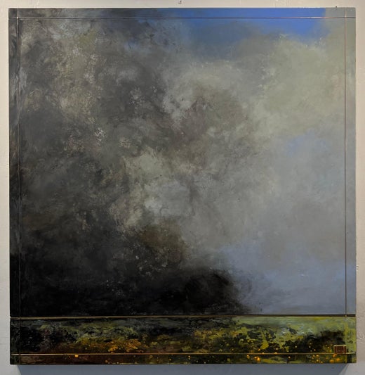 After a forty-year career painting in an industrial loft in Chicago, Wrona relocated to Ojai, California in 2015 where the open horizon of Ojai’s natural beauty expanded her vision from roof-top viewed swatches of blue to vast horizons that glow with emotional intensity. As a child Wrona often stared out her bedroom window and studied the movement of clouds to escape from family drama. The changing panorama suggested the possibility of change from negativity to positivity. The sky’s mutability still provides a personal source of serenity that infuses her work. To create her translucent veils of colors, she stopped using brushes and manipulates her pigments directly with her hands. She grinds pigments - both dry and liquid - into her wooden panels to create the feathery wisps that dominate even the dark stormy reflections. Critics have referred to these glazes and scumbles as Turner-like gauzes of light and color. Her current work at bG Gallery has a sensual depth that encompasses how humans interact with the sights, sounds and scents of nature. Even her small panels evoke the majesty of cosmic visions. Her art goes beyond traditional representation of meteorological effects to introduce an emotional depth that resonates a strong experience of nature recreated in an interior environment, both physical and reflective. Her grandest painting, A Summer’s Day fills a large wood panel with bright shining light across expanses of clouds down to a low horizon meadow of orange and yellow poppies. Energy and movement in brilliant turquoise, azure to deep dark shades of indigo comprise the scene in Azure Moment. Tempest Sky, although the smallest of her paintings at 10 x 12 inches, still draws the viewer into her richly encompassing atmospheric realms. Subtle intrusions of geometric lines and interior borders throughout her works reconnect us to the relationship between the human or man-made and natural worlds, the encroachment of anthropogenic elements into nature, and the search for balance between the two.