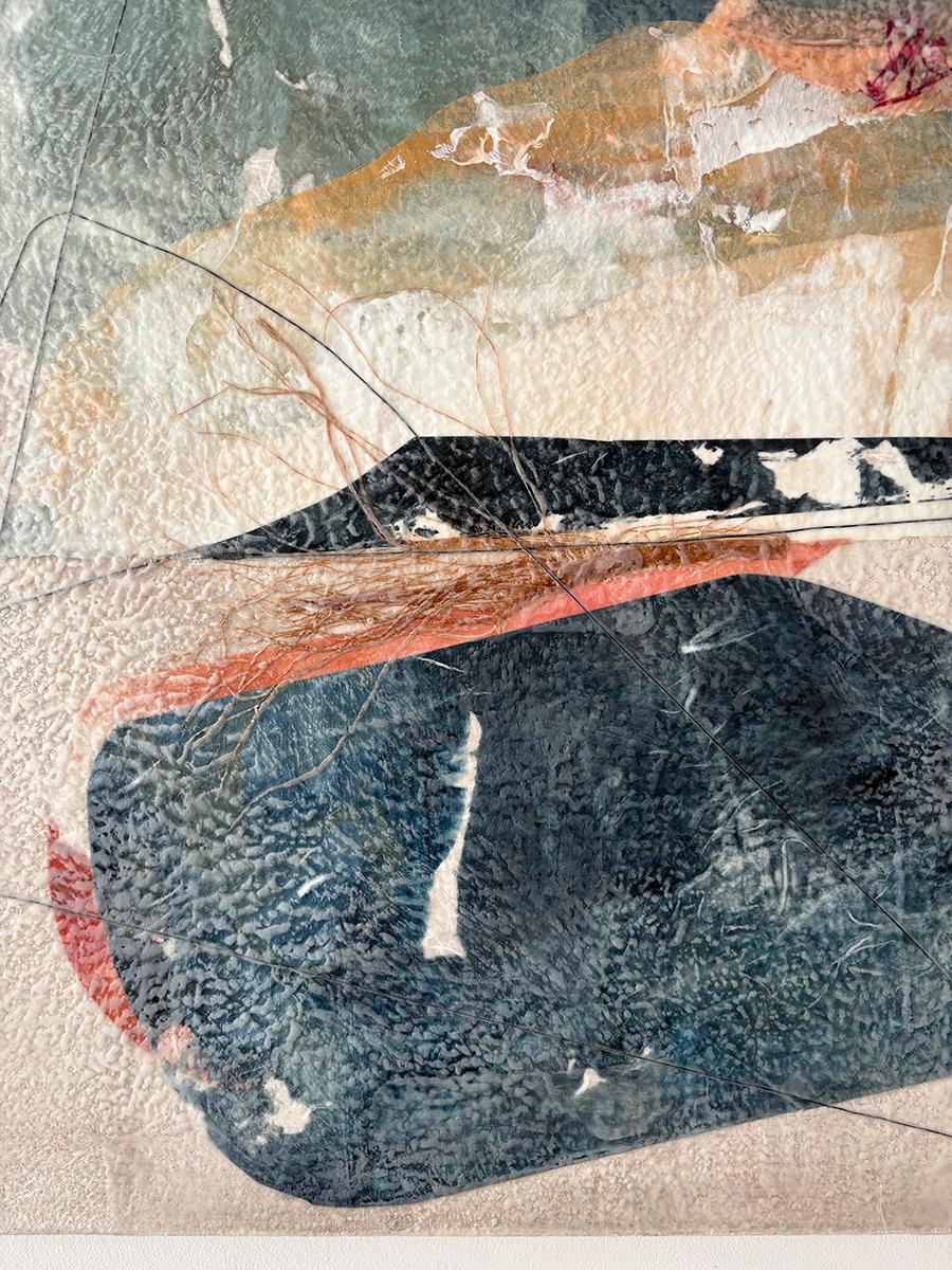 Abstract encaustic painting with dyed teal, indigo, white and beige fabrics