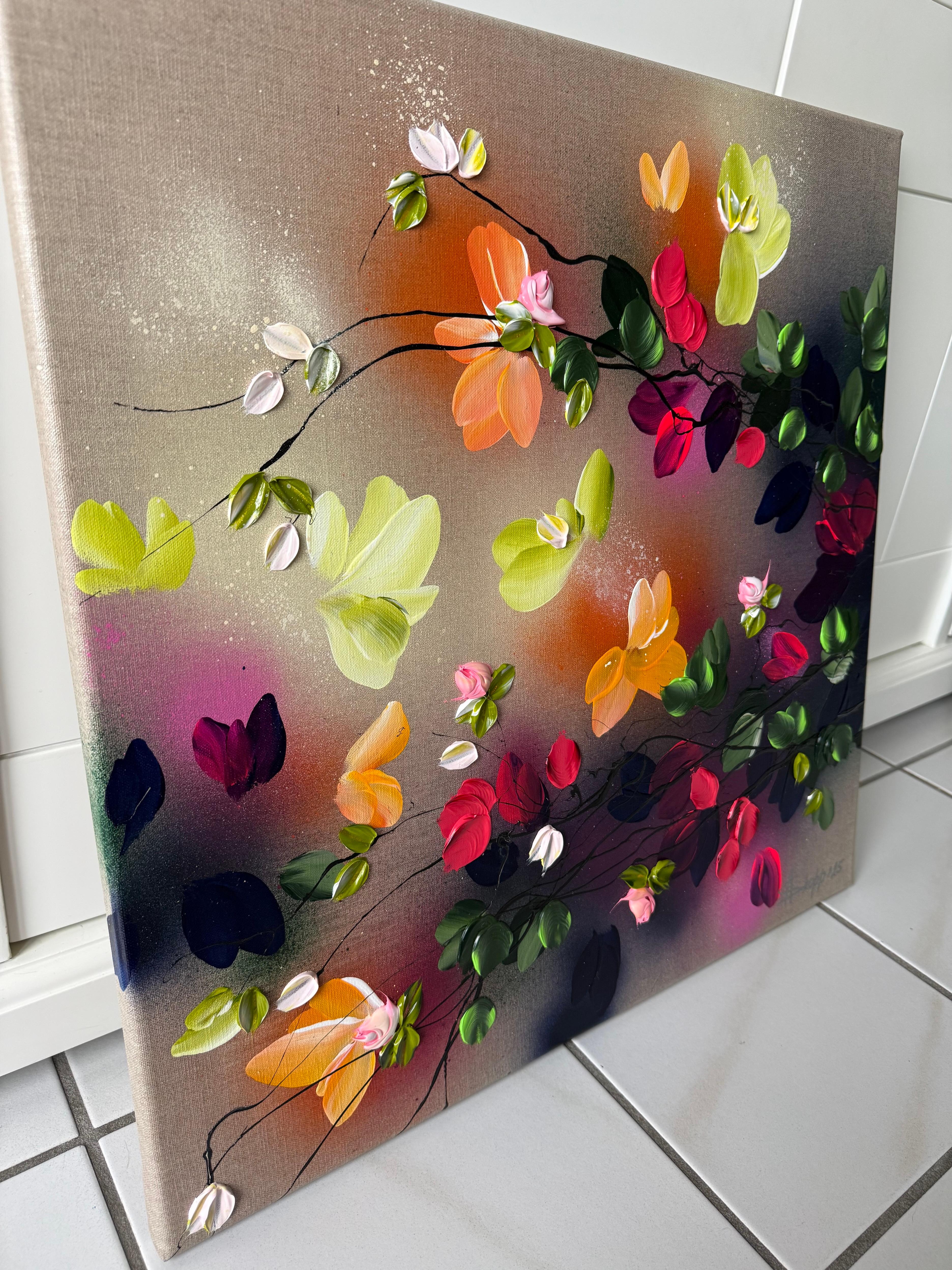 Satori Blooms IV - impressionistic painting on linen canvas with 3d roses