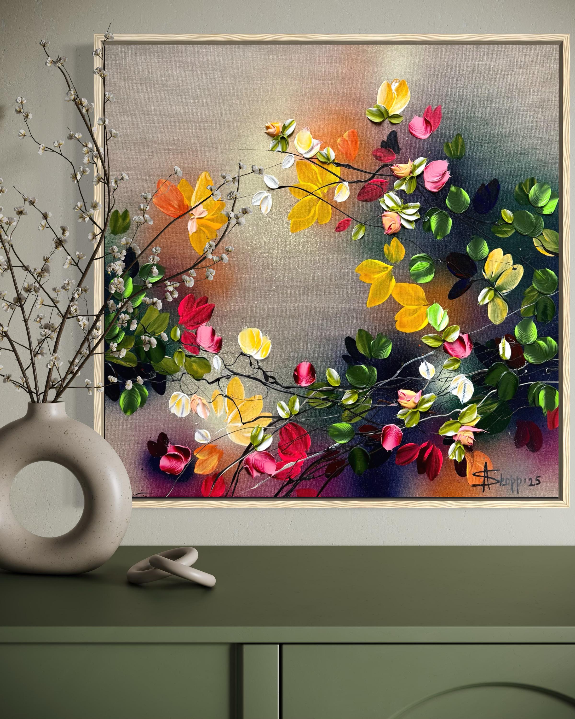 Satori Blooms IV - impressionistic painting on linen canvas with 3d roses