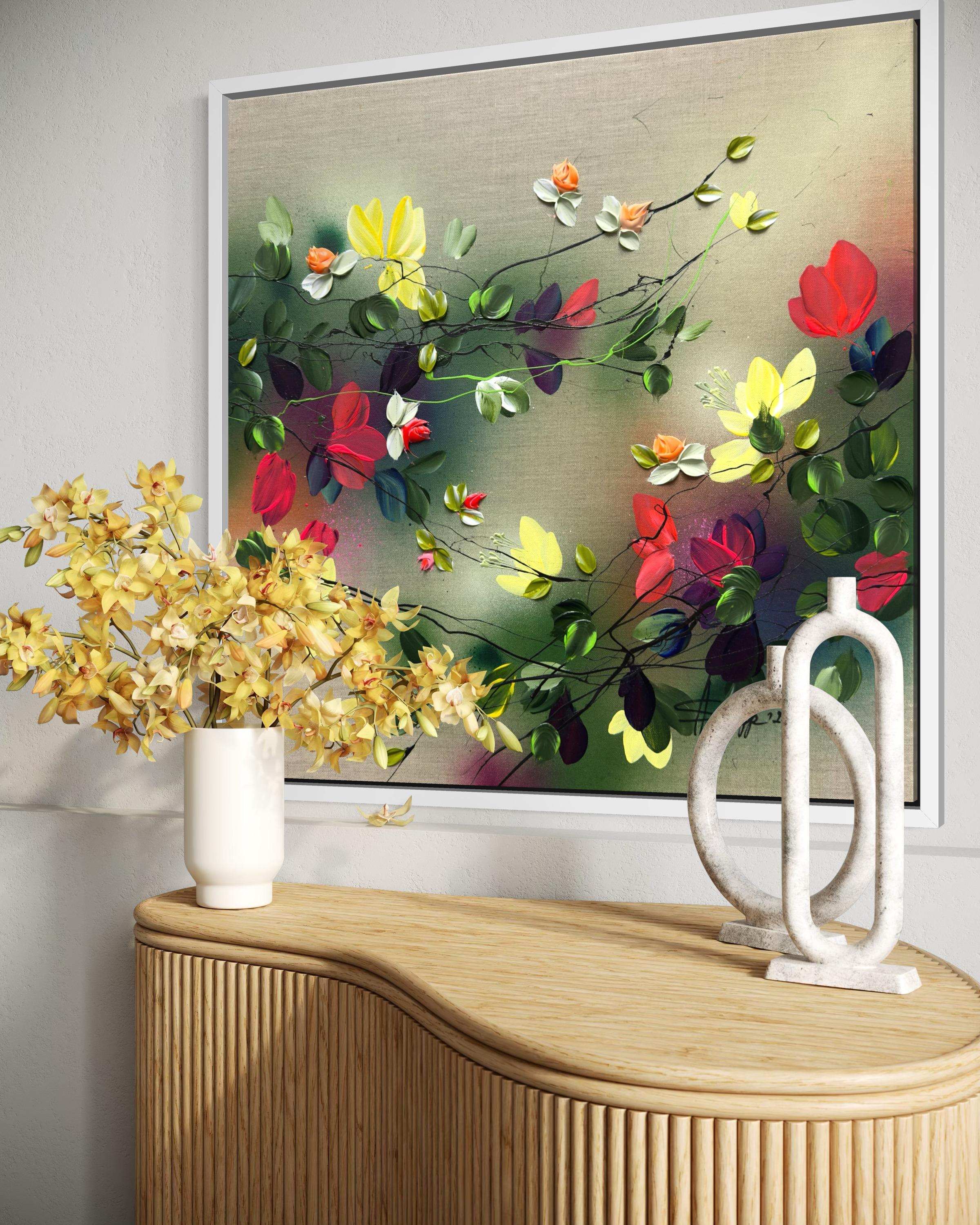 Satori Blooms IV - impressionistic painting on linen canvas with 3d roses