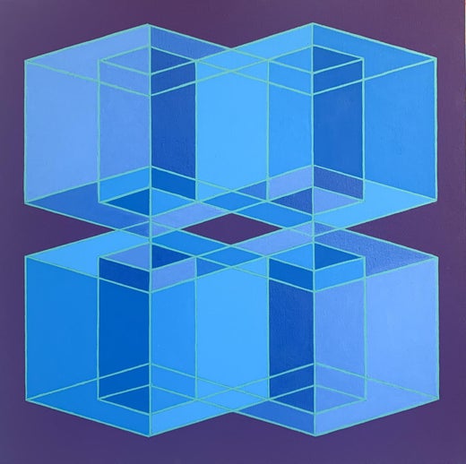 Intersecting Cubes #8: geometric abstract Op Art painting, blue squares w/ red