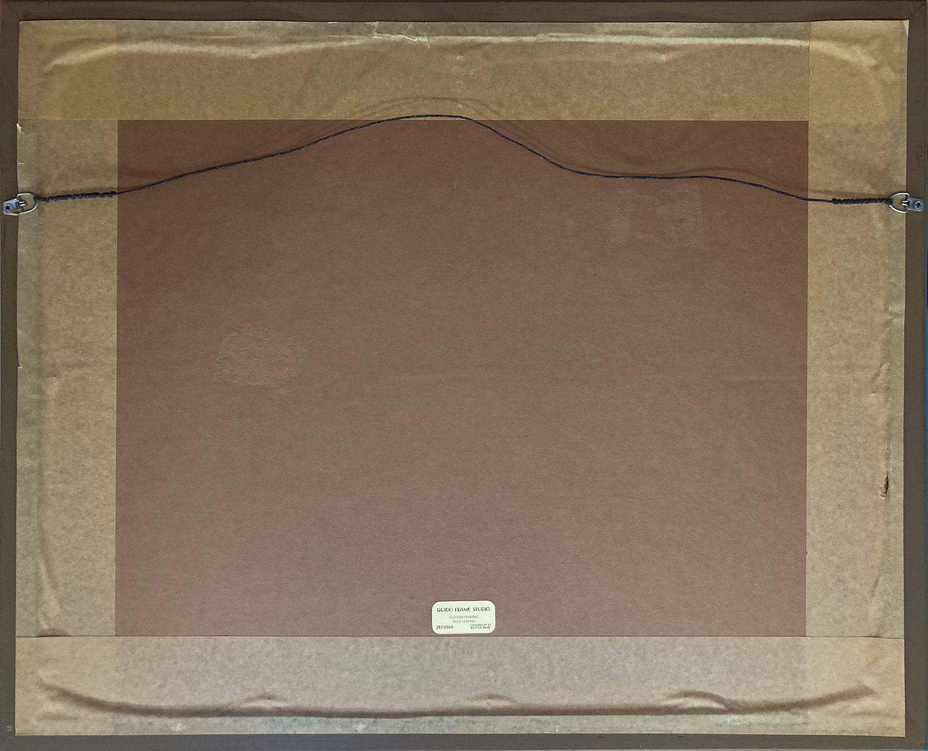This piece is an abstract composition done with mixed media, oil and acrylic paints on paper. The artist explores an incredible world filled with color and expressive brushstrokes. The lines and texture create a mature abstract composition as Suki Maguire has been painting in this field since the 1970s. Her joy is the expression and we can find these notes displayed vividly in this piece. This piece comes displayed in a modern light wood floating frame under glass and is signed lower right.