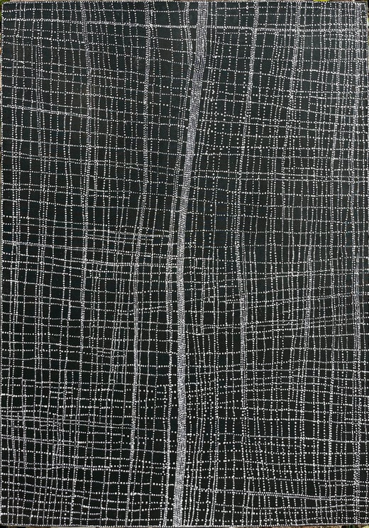 Little wonder then, that the surfaces of Dorothy’s canvases become dense rhythms of grids, as she mapped the paths of these dancing women. In 2001 Dorothy Napangardi was the recipient of the 18th National Aboriginal and Torres Strait Islander Art Award and in the following year a solo exhibition of her work was curated for the Museum of Contemporary Art in Sydney.