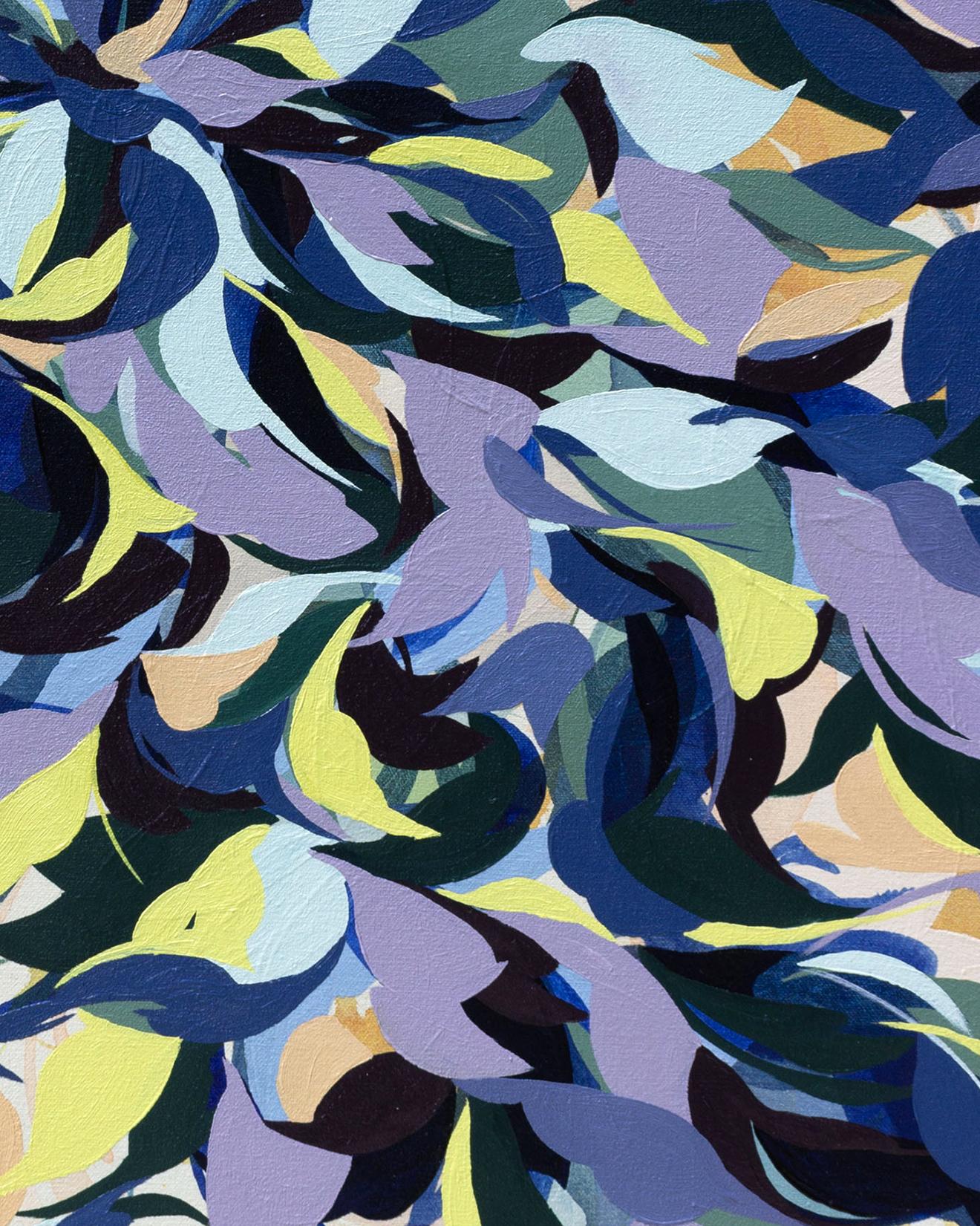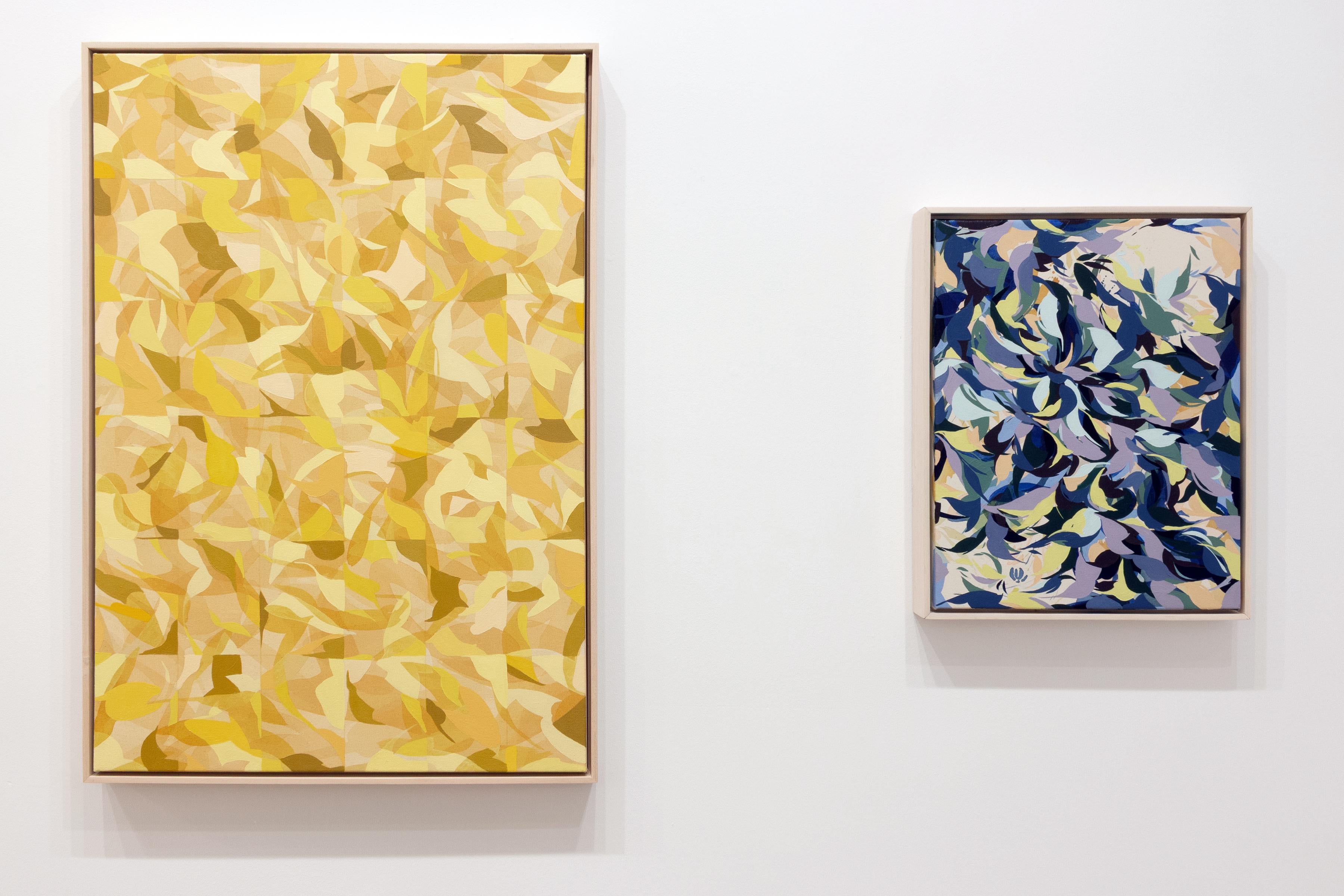 The paintings in this show evoke a sense of constant transformation mimicking light falling across water, rocks on a river bed, garden blooms, or the canopy of a forest composed of forms that are similar but never exactly the same. Many of the works were created utilizing canvases that had been left in various states of completion over the years. Past iterations became the conceptual foundation and physical substrate for the new; further embodying the practice of recollection and reimagination as facets of growth and modes of evolution.