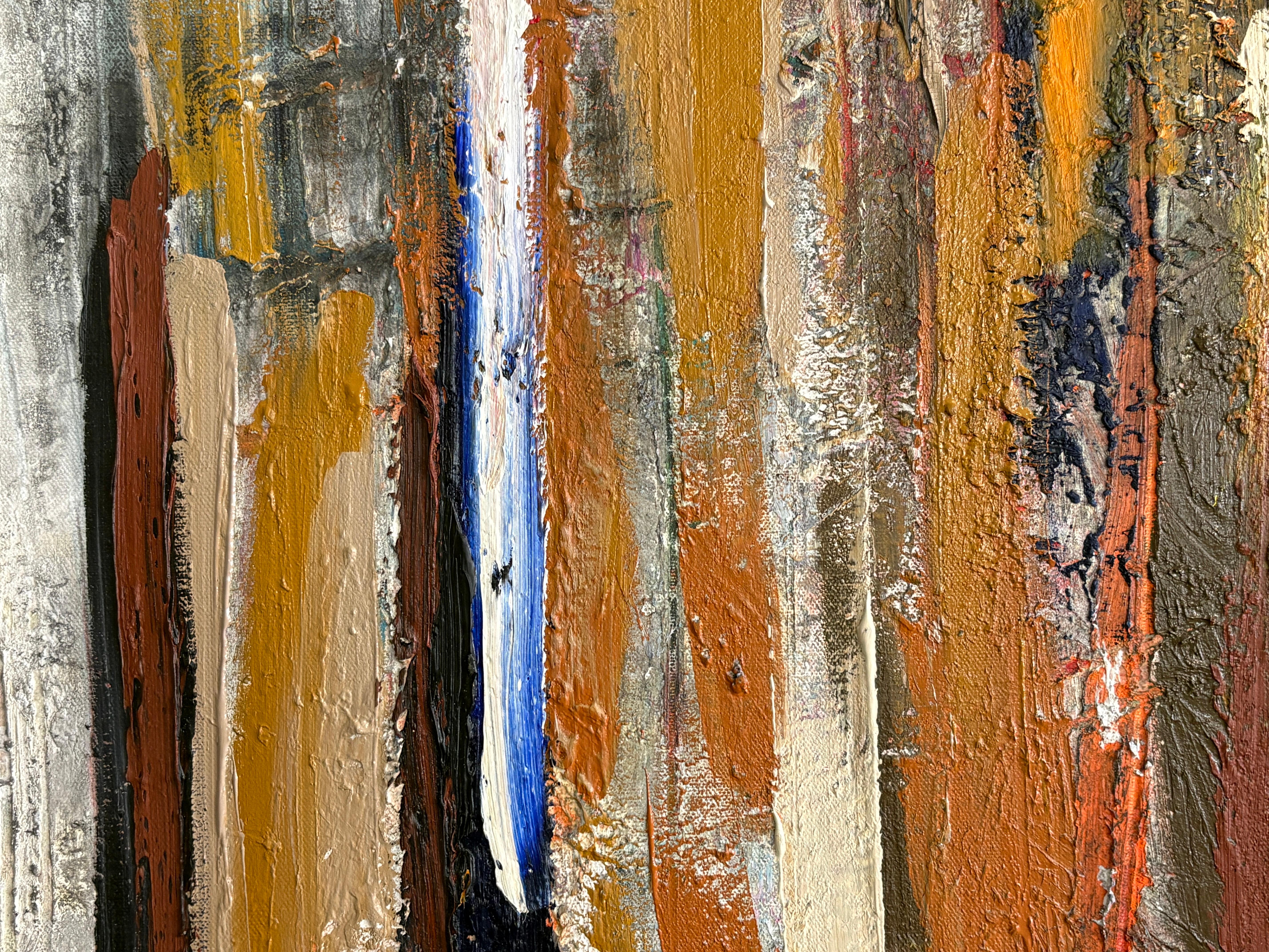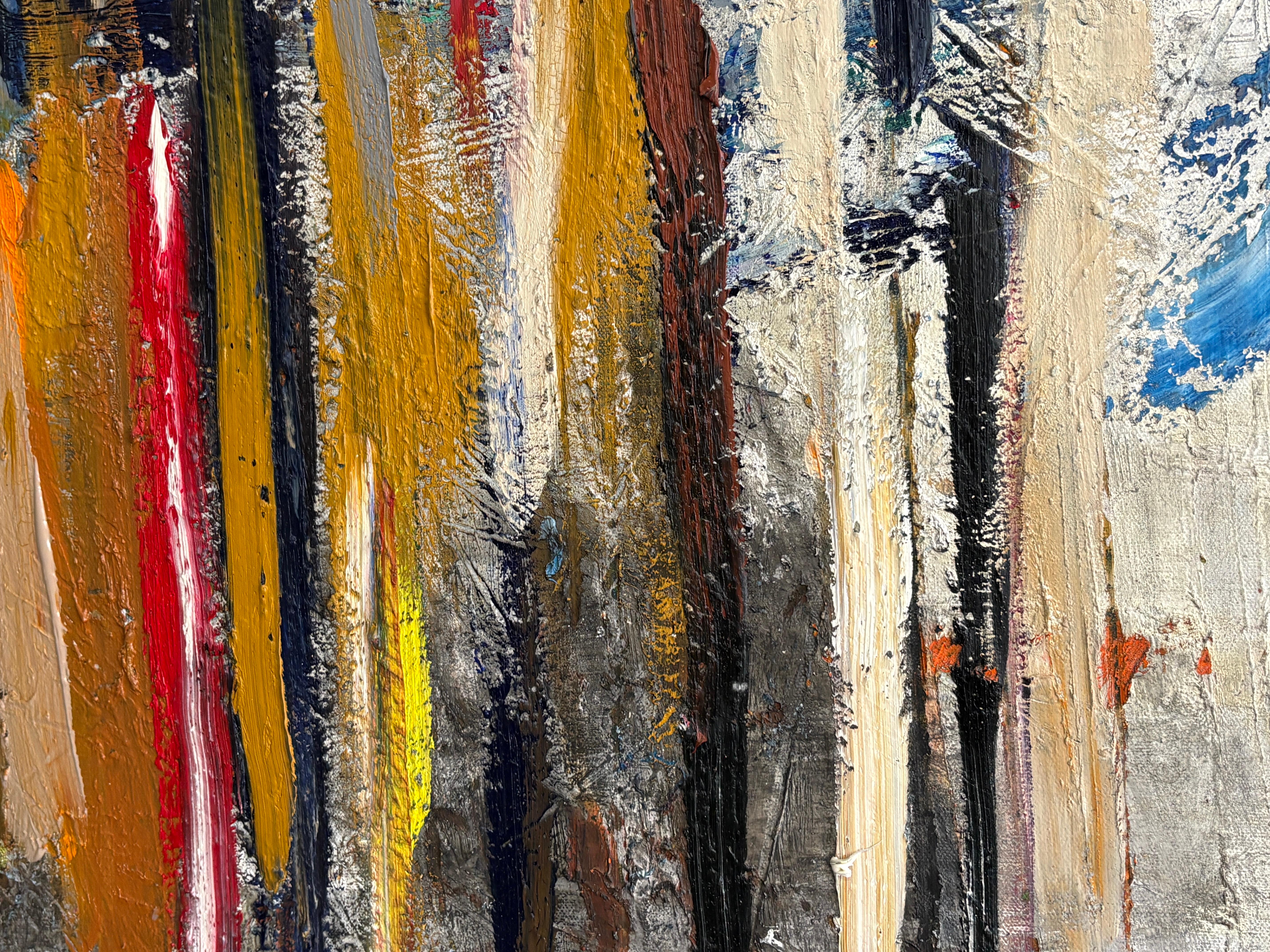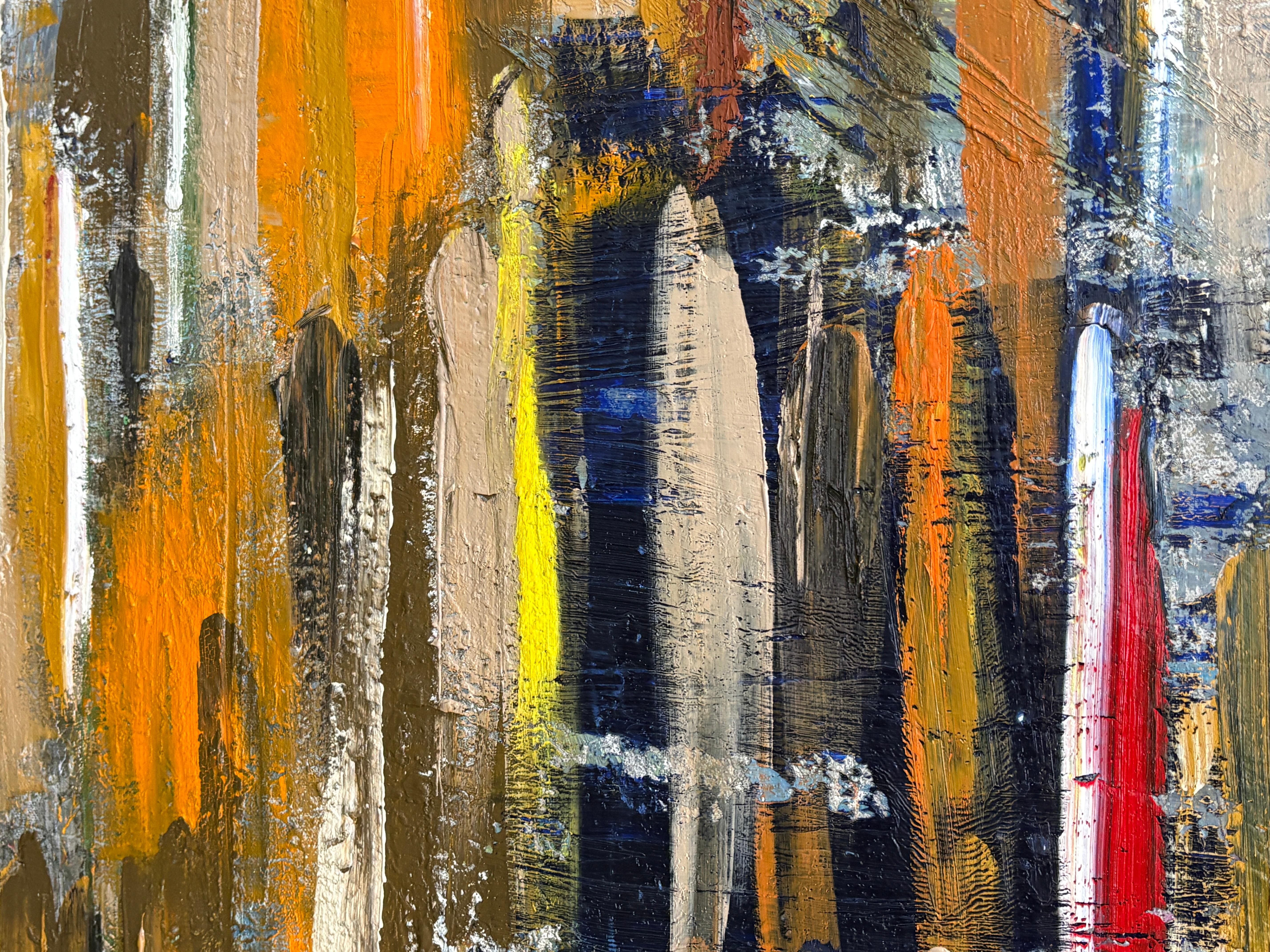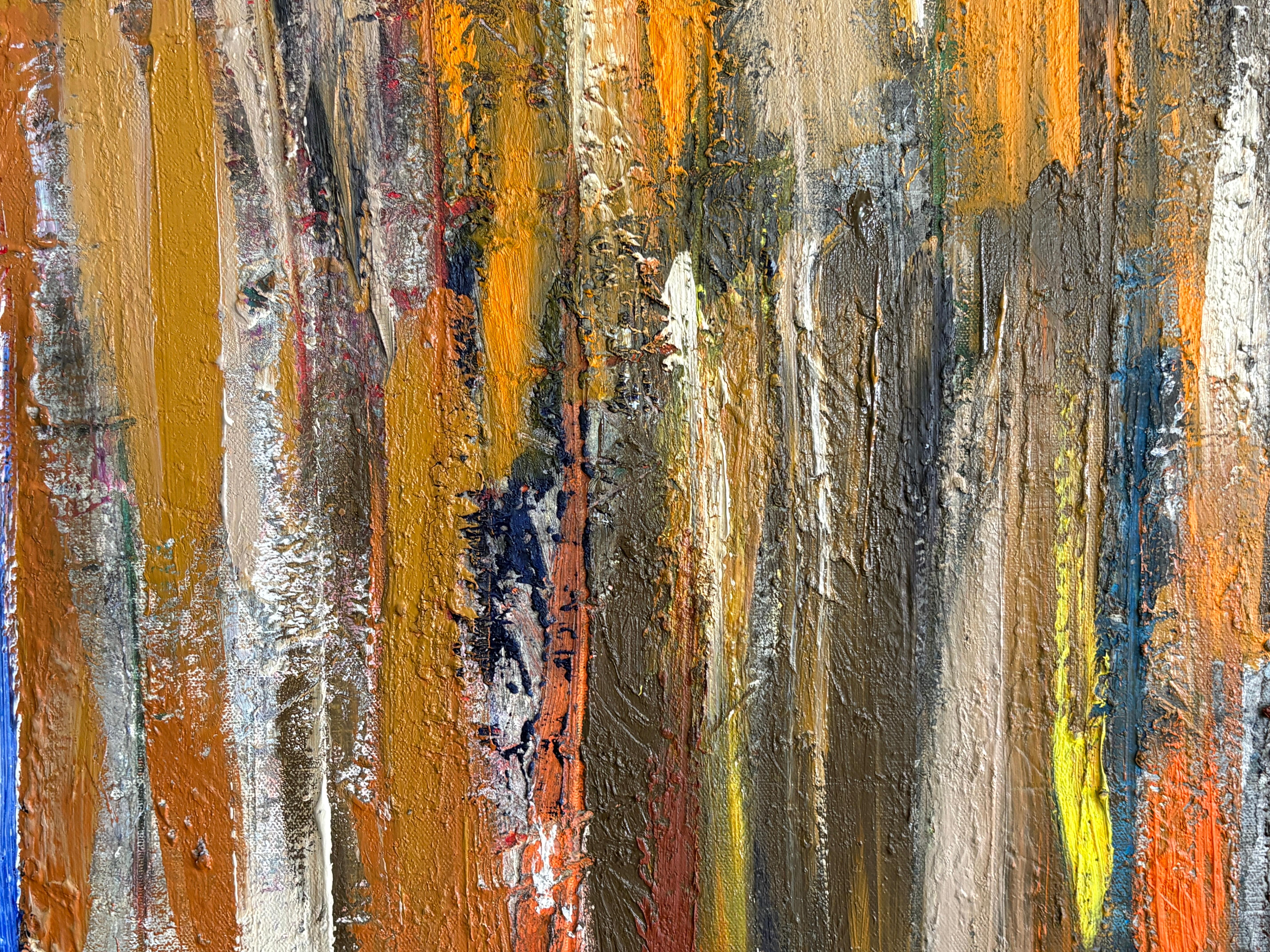 "Rollie with the Angels" exemplifies abstract expressionism with its bold and emotive brushwork. The artist's use of a warm, earthy palette interlaced with splashes of vibrant color evokes a sense of both the ethereal and the grounded, as if capturing the essence of celestial beings in a moment of dynamic movement. The vertical strokes and varied textures create an illusion of ascension, drawing the viewer's eye upward and inward, offering an introspective experience akin to conversing with the divine.