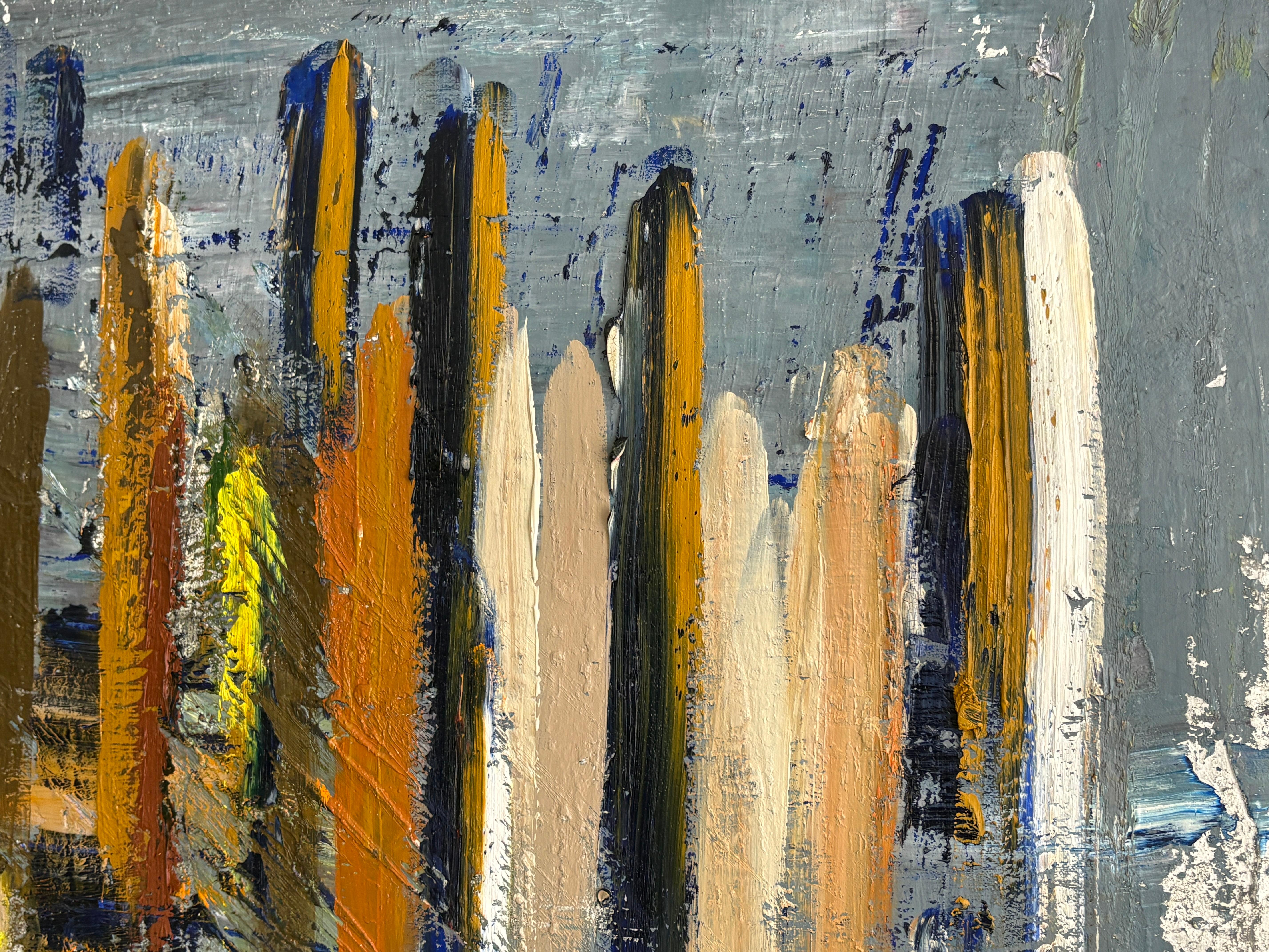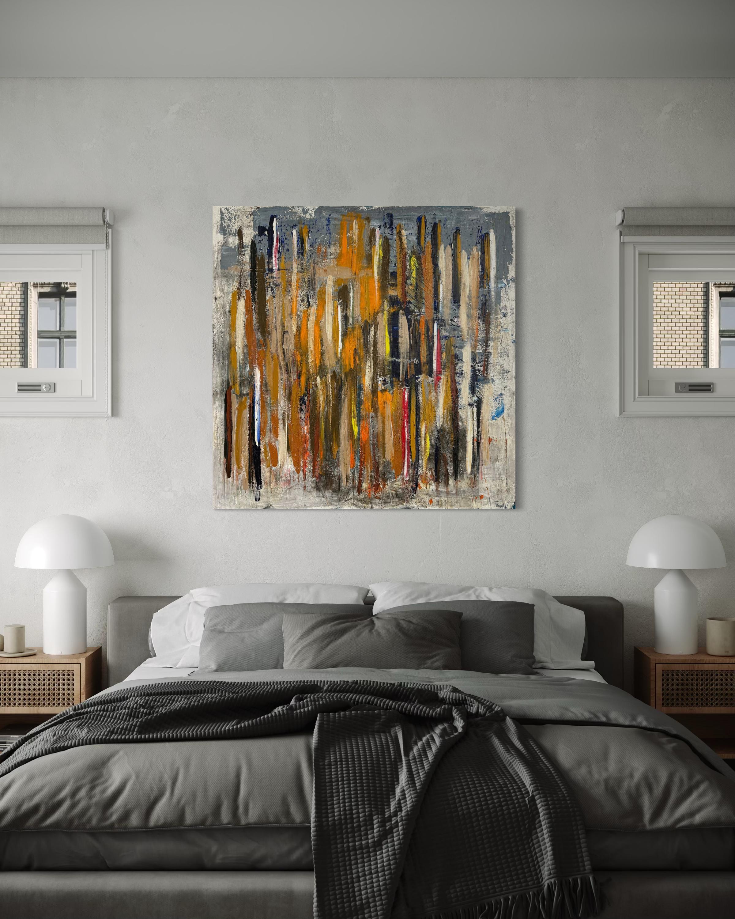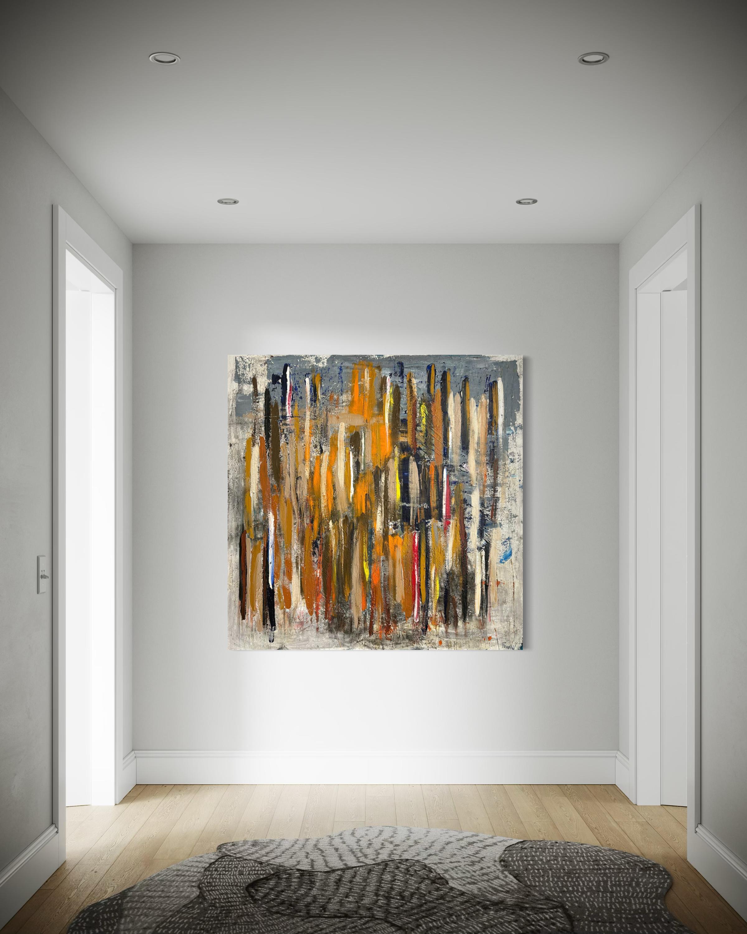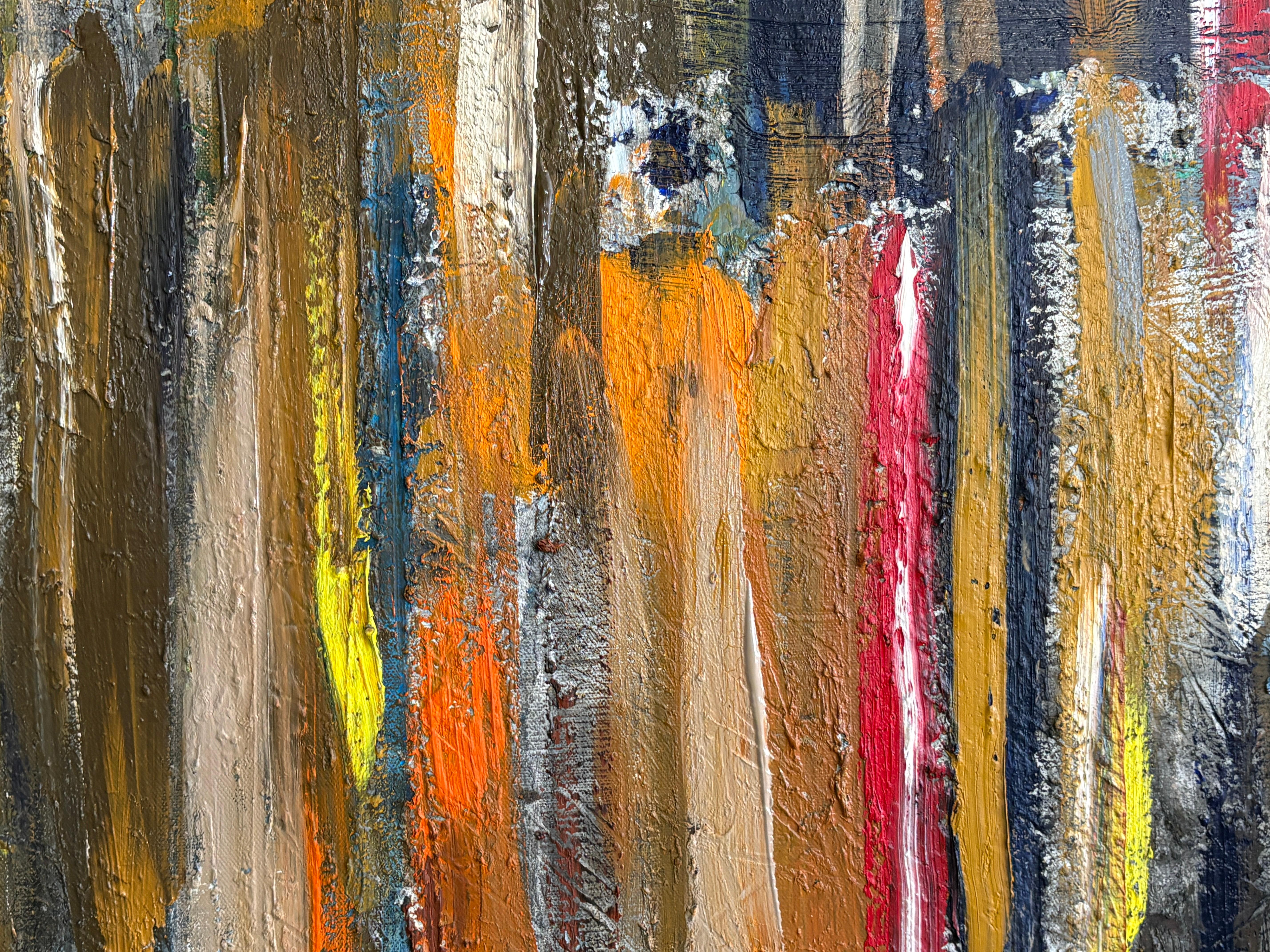 "Rollie with the Angels" exemplifies abstract expressionism with its bold and emotive brushwork. The artist's use of a warm, earthy palette interlaced with splashes of vibrant color evokes a sense of both the ethereal and the grounded, as if capturing the essence of celestial beings in a moment of dynamic movement. The vertical strokes and varied textures create an illusion of ascension, drawing the viewer's eye upward and inward, offering an introspective experience akin to conversing with the divine.