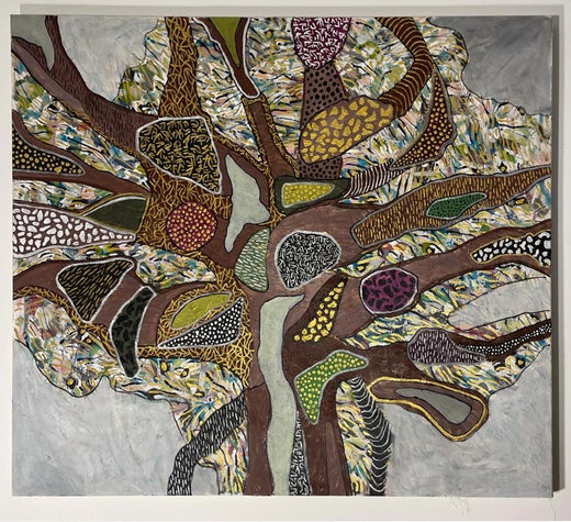 Through painting and sculpture, Gregory Robin conveys the feeling of being present in a living, biodiverse ecosystem. He uses colors, anthropomorphic forms and the inner workings of living species. Robins' land art practice encompasses the exploration of ancient earthworks, ecosystems, biodiversity, microclimates, biology, permanent agriculture (also known as permaculture), geology and its intrinsic value to the species that inhabit it. The artist's goal is to create a living installation, establishing a connection with the natural world.
