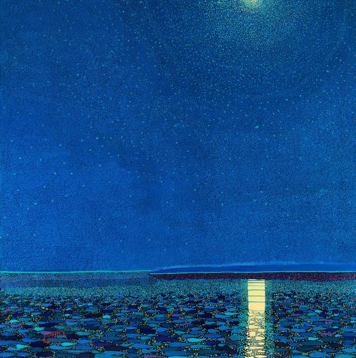 Landscape painting "Calm Ocean Night" 28x42 by artist H.M. Saffer II. Painted in the style of pointillism, a series of tiny painted brushstrokes, this colorful oil painting depicts ...