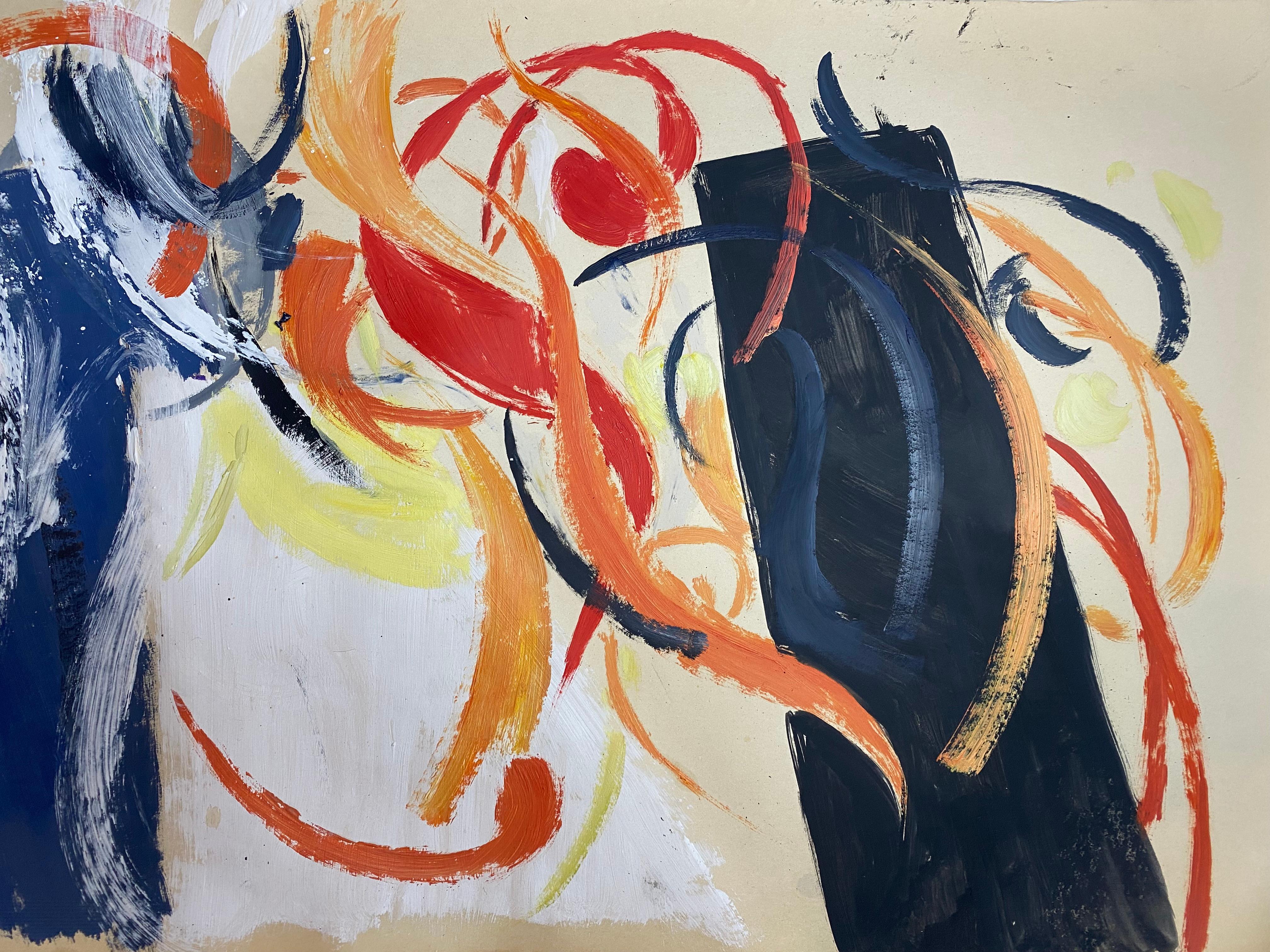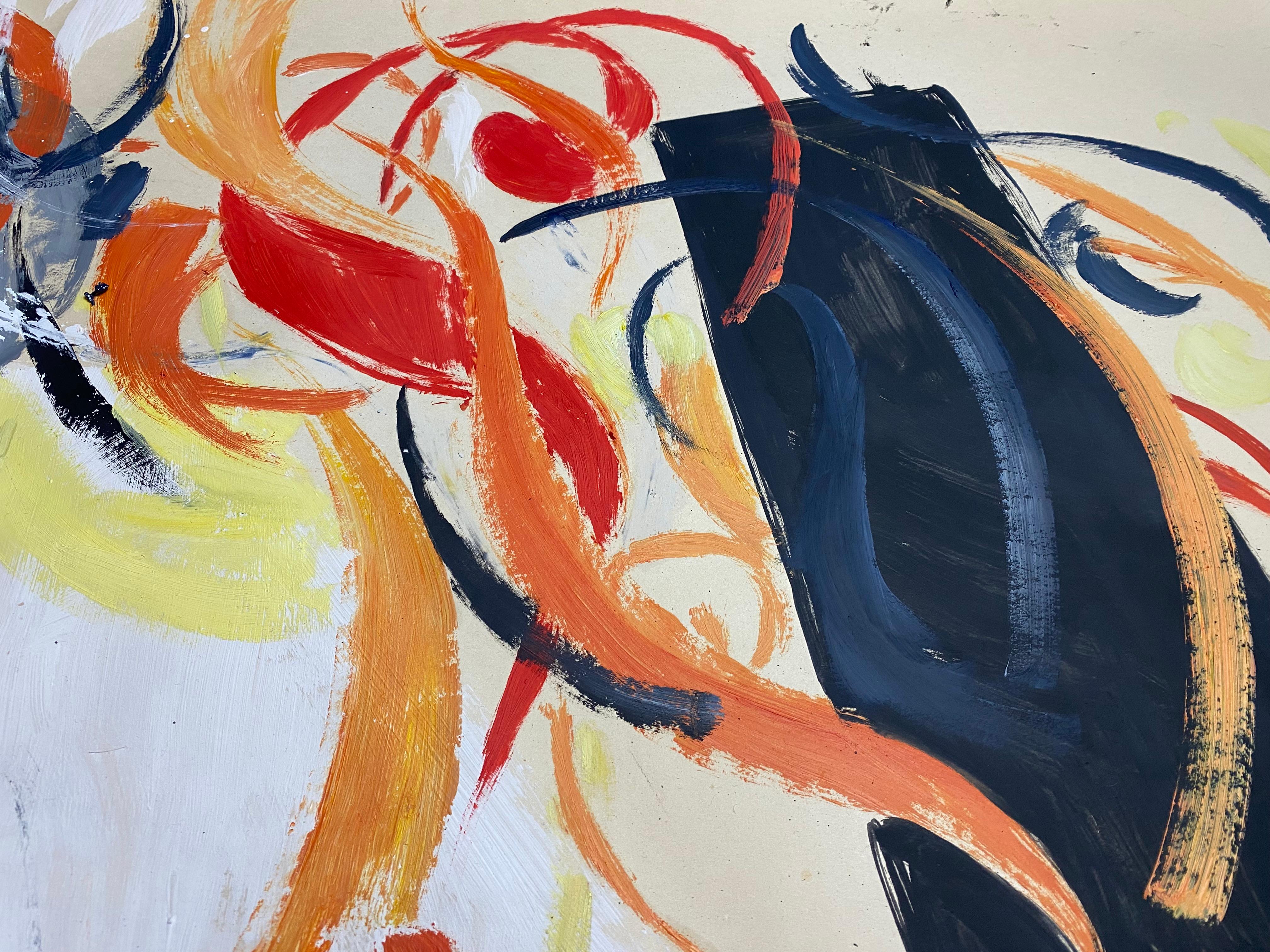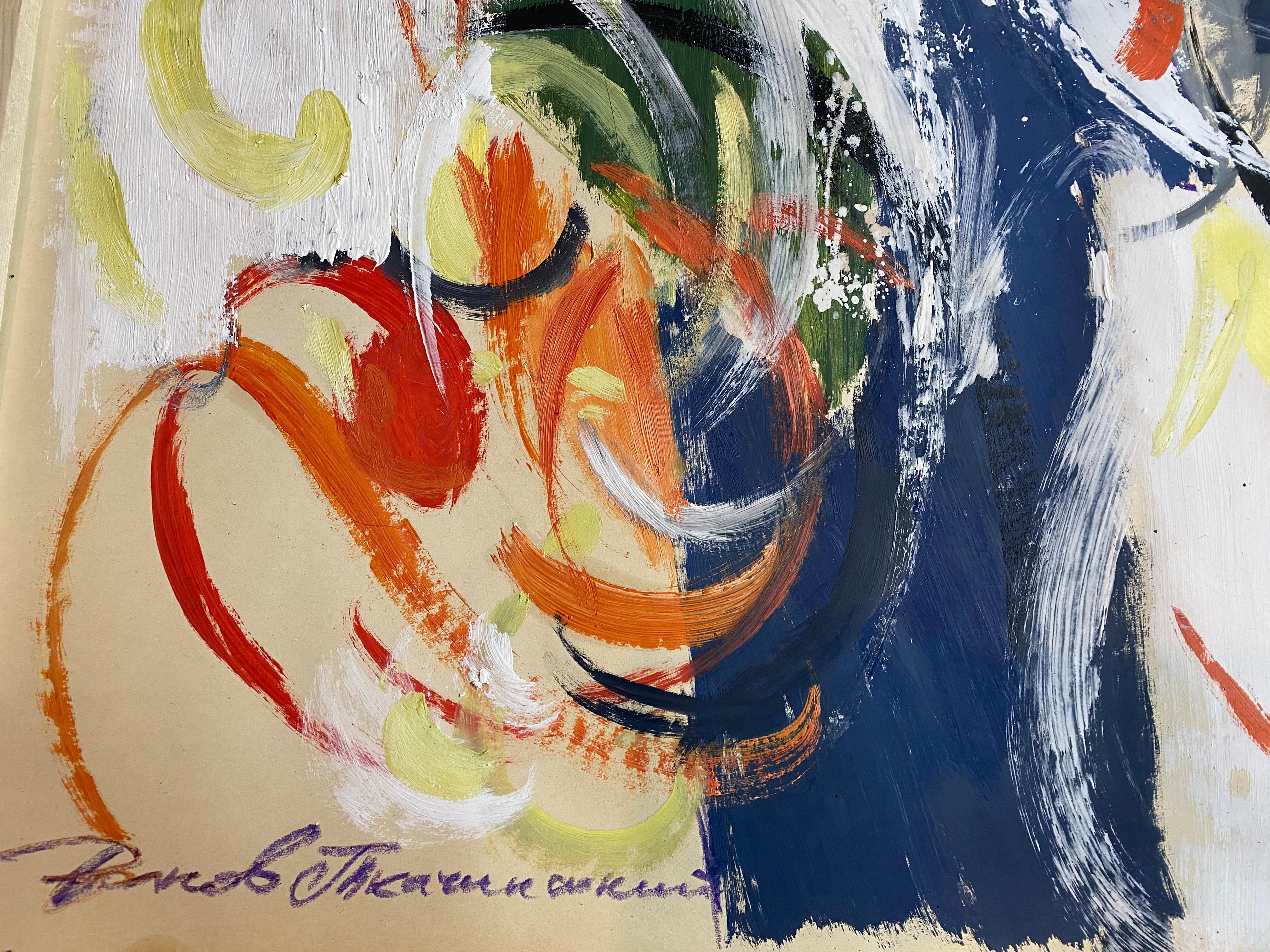 Through abstraction, the artist channels these opposing forces into a visual language of movement and structure — a dialogue between chaos and harmony. The geometric and dynamic composition, executed in oil on paper, becomes a symbol of transformation: the act of turning struggle into light, and conflict into art.
