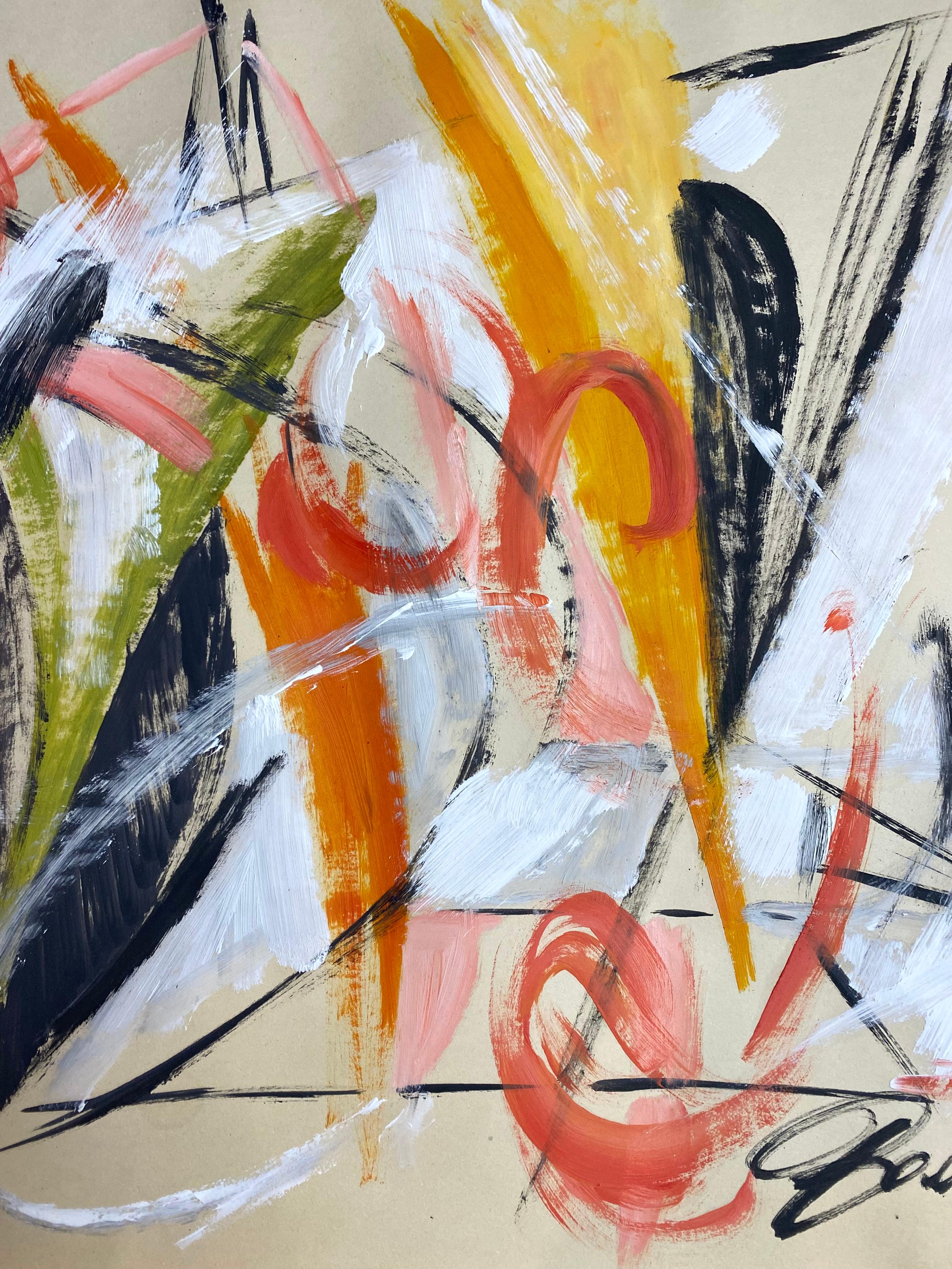This is an abstract expressing energy. Bold and gestural, it is painted with limited graphic palette and some gold brush stokes. It is dynamic and dec...
