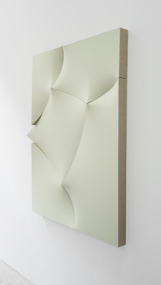 Based on the premise formulated by De Stijl cofounder (and fellow Dutchman) Theo van Doesburg that a work of art refers only to itself, Jan Maarten Voskuil’s abstract, wonkily geometric paintings-cum-sculptures are full of rigor and humor. His works are oriented on the circle and the rectangle, whose forms he alters and distorts using mathematical principles. These calculations guide the shape of his wooden frames, across which he stretches monochromatic canvases, presented singly or combined into multipart works that may be found hanging on or propped against walls, installed in the middle of a room, or even attached to the ceiling. At once austerely minimal and exuberant, Voskuil’s compositions often appear to be in the process of shape-shifting—peeling off of the wall, stretching, or collapsing in on themselves—as if imbued with minds of their own.