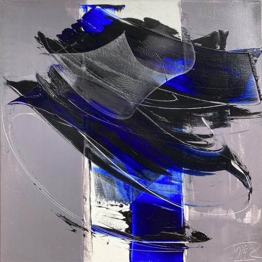 The painting reveals Soyer's technical mastery through its textural complexity, achieved with his signature approach of using large brushes and combs to create substantial relief effects. While Soyer acknowledges Nicolas de Staël's influence in his broader body of work, this particular piece seems to draw more heavily from the gestural spontaneity of Georges Mathieu and the dynamic calligraphic elements found in Fabienne Verdier's work. The forceful movements and controlled chaos also suggest connections to Pierre Soulages' intense explorations of black and Franz Kline's bold structural contrasts.