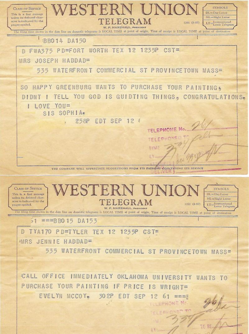 She exhibited across the country including at the National Columbia Painting Biennial in 1957; received the Houston Museum Award in 1957; exhibited at the Delgado Museum in 1959; the 65th Annual for Western Art in Denver, CO in 1959; and at the Denver Museum Invitational in 1969; and at the Dallas County Show at the Dallas Museum of Fine Arts in 1958. Jennie Haddad passed away in 1996.