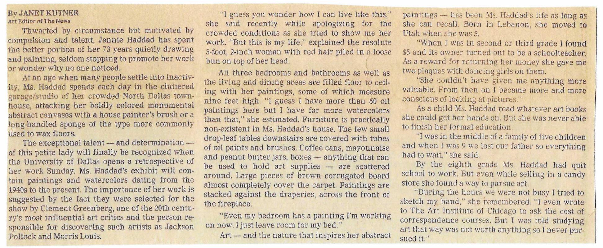 Dallas abstract expressionist painter, Jennie Haddad was born in 1906 in Lebanon and moved to the United States in 1912. Haddad first received formal art training for two years under William C. Palmer (Munson-Williams-Proctor Institute School of Art, Utica, New York). Mr. Palmer was stationed in Tyler, Texas during World War II.