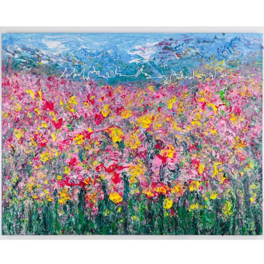Kwon’s approach to painting is deeply intuitive, translating the resonance of music and emotion into textured landscapes of color. In Humming Letter #64, vibrant red florals emerge dynamically from a layered background of blues, purples, and greens, creating a sense of movement that recalls the fleeting, rhythmic nature of a hum. The absence of traditional brushwork allows for a deeply tactile surface, making each mark feel spontaneous and immersive. The textured application of paint reflects light differently at every angle, enhancing its depth and vibrancy.