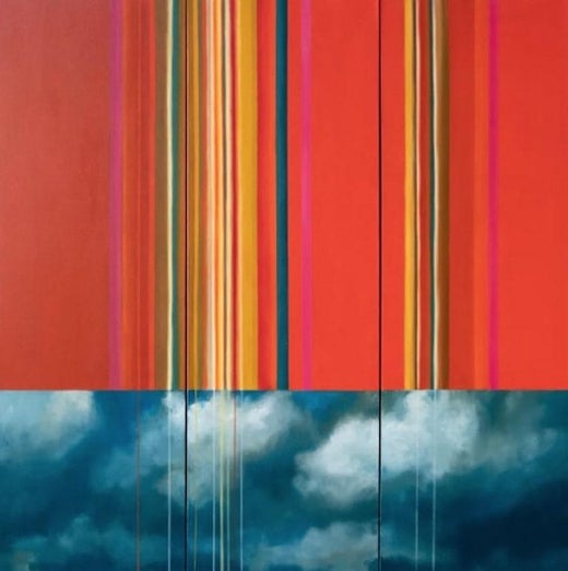 This is a surrealist abstract painting in which the artist has created stripes of colors such as pink and orange underneath a depiction of a clouded sky.