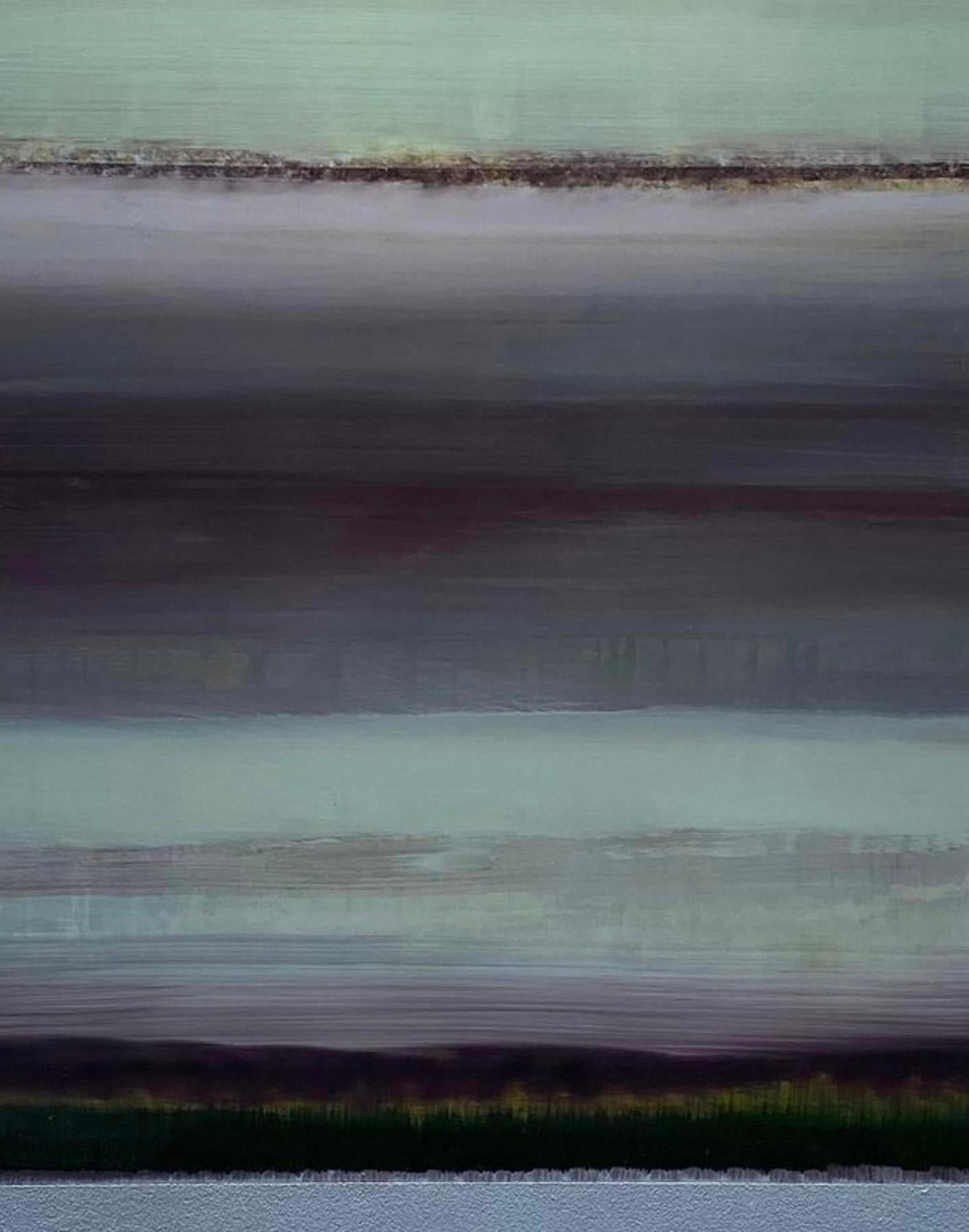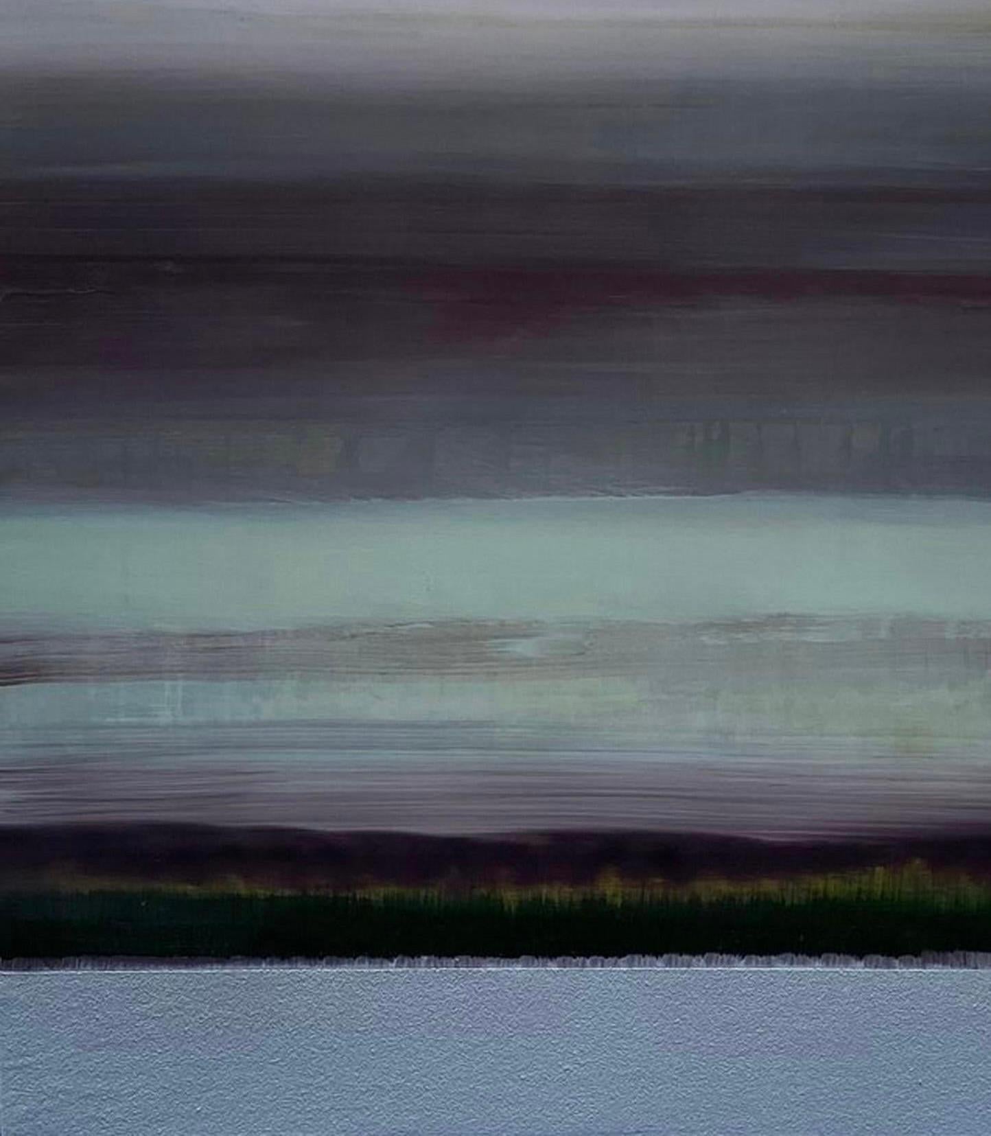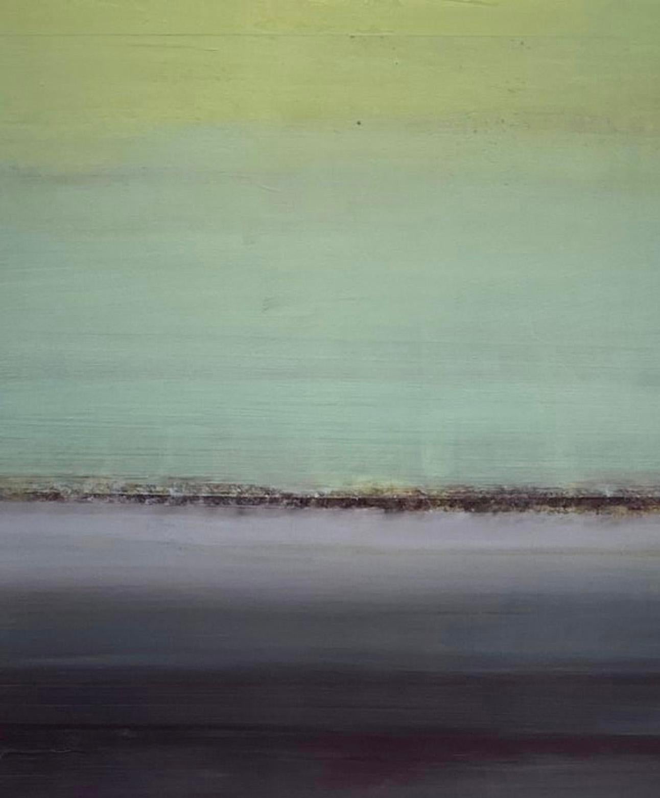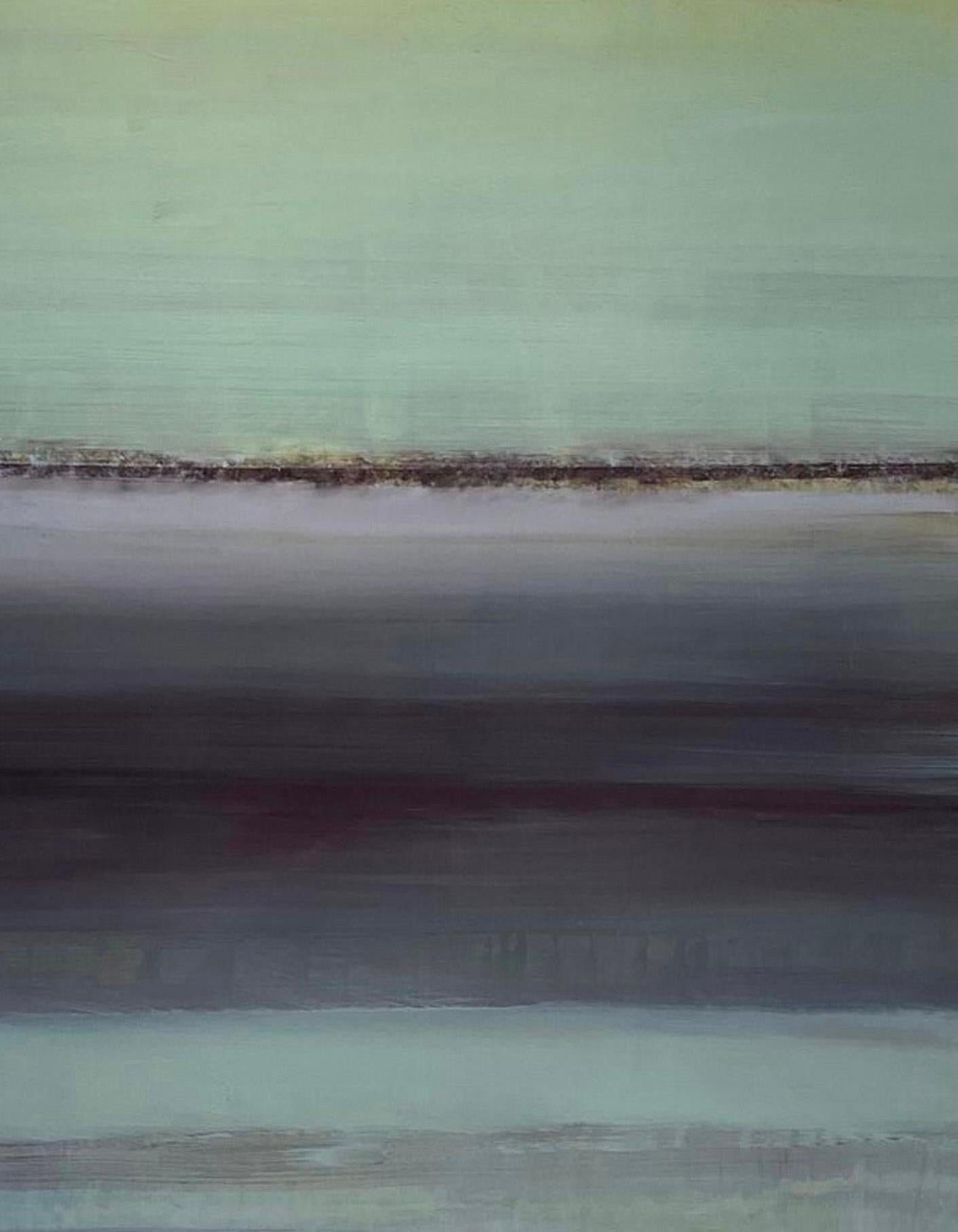 "Distance" evokes the serene expanses of earth and sky through delicate tonal shifts and softly blurred horizons. Layers of translucent greens, violets, and greys dissolve into one another, suggesting land, water, and atmosphere merging in stillness. With her refined control of color and subtle abstraction, Holt transforms landscape into meditation—an exploration of perception, time, and emotional space.