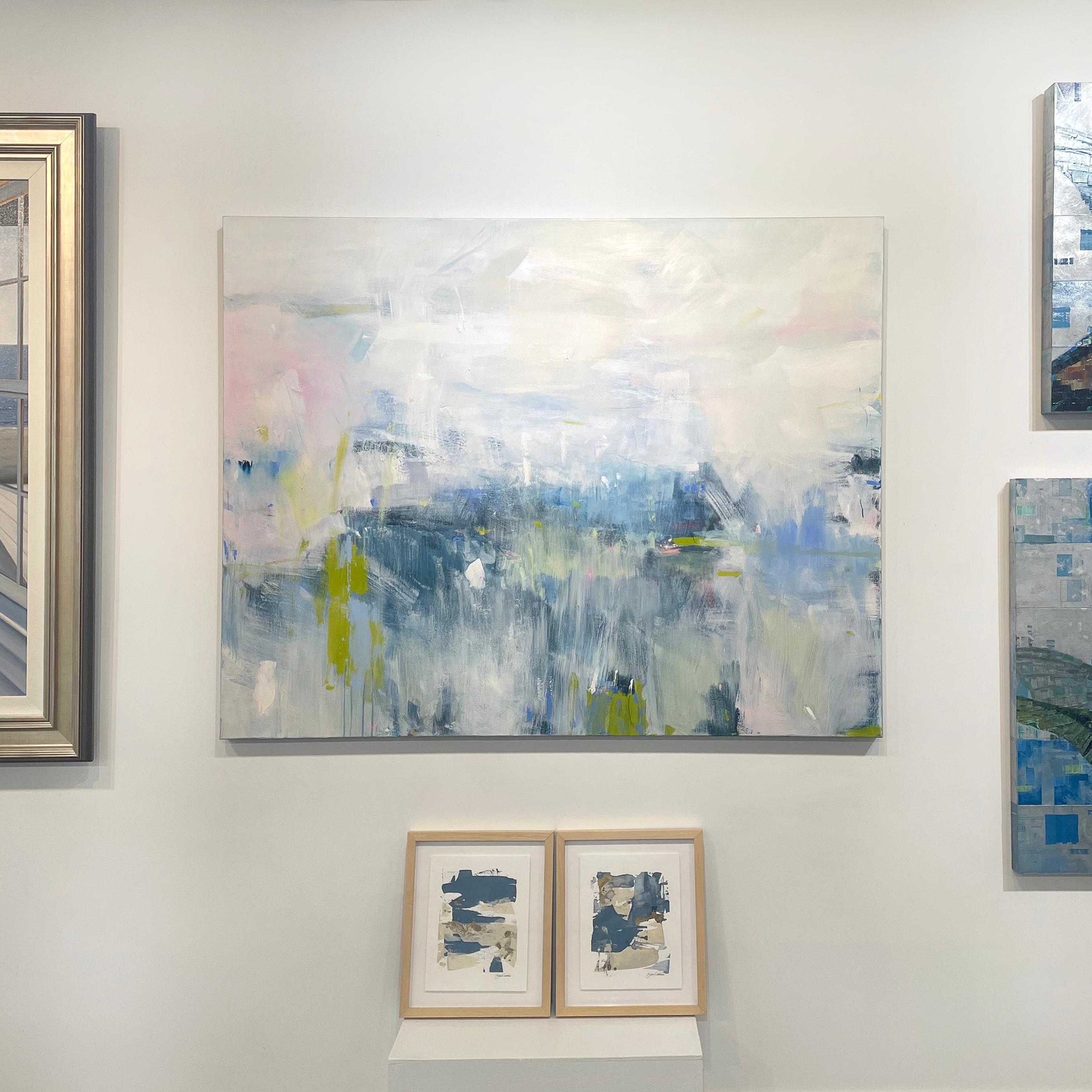 This abstract painting by Julia Contacessi features a light, coastal palette, with washes of varying blue tones on the bottom of the composition and light blush and white tones at th...