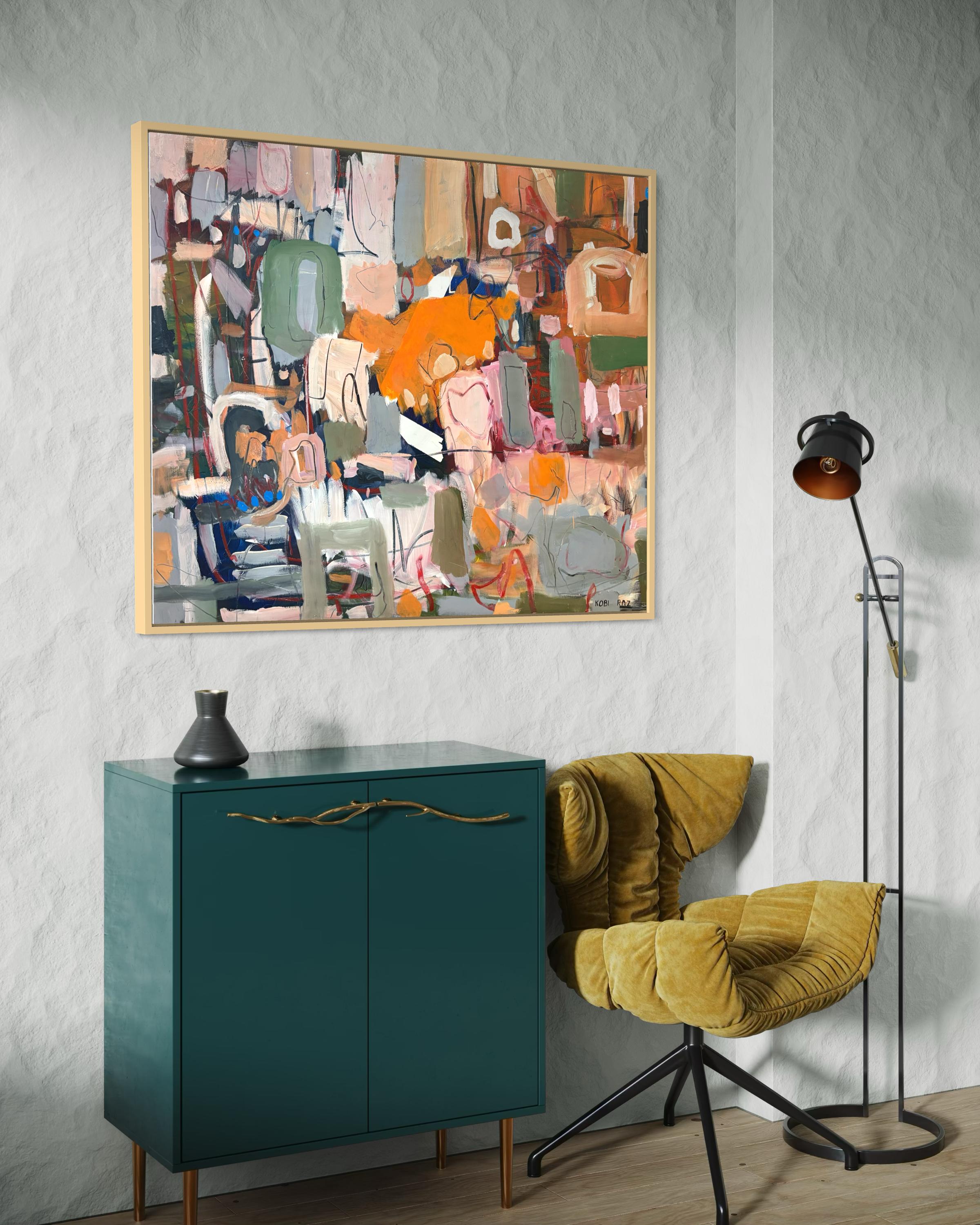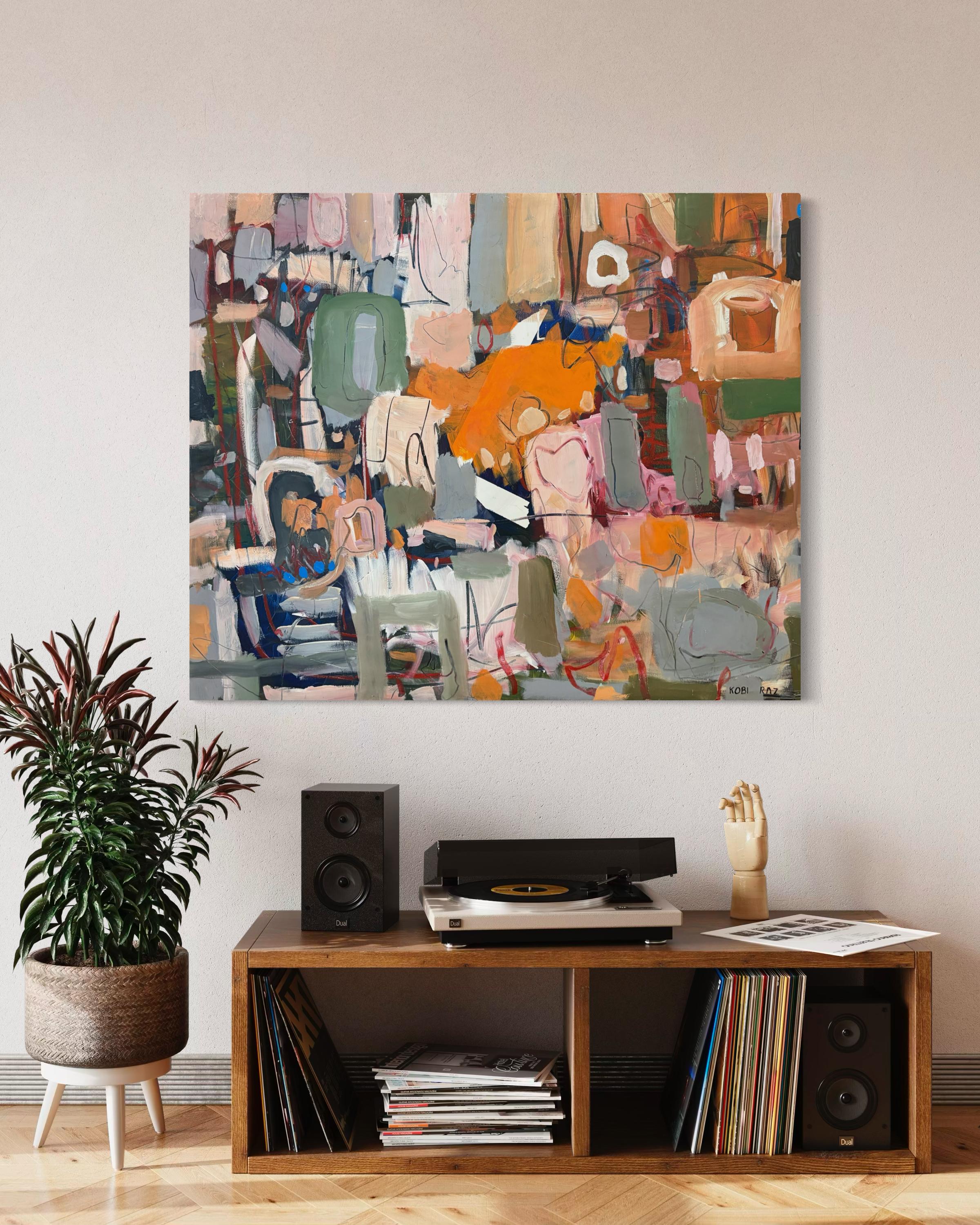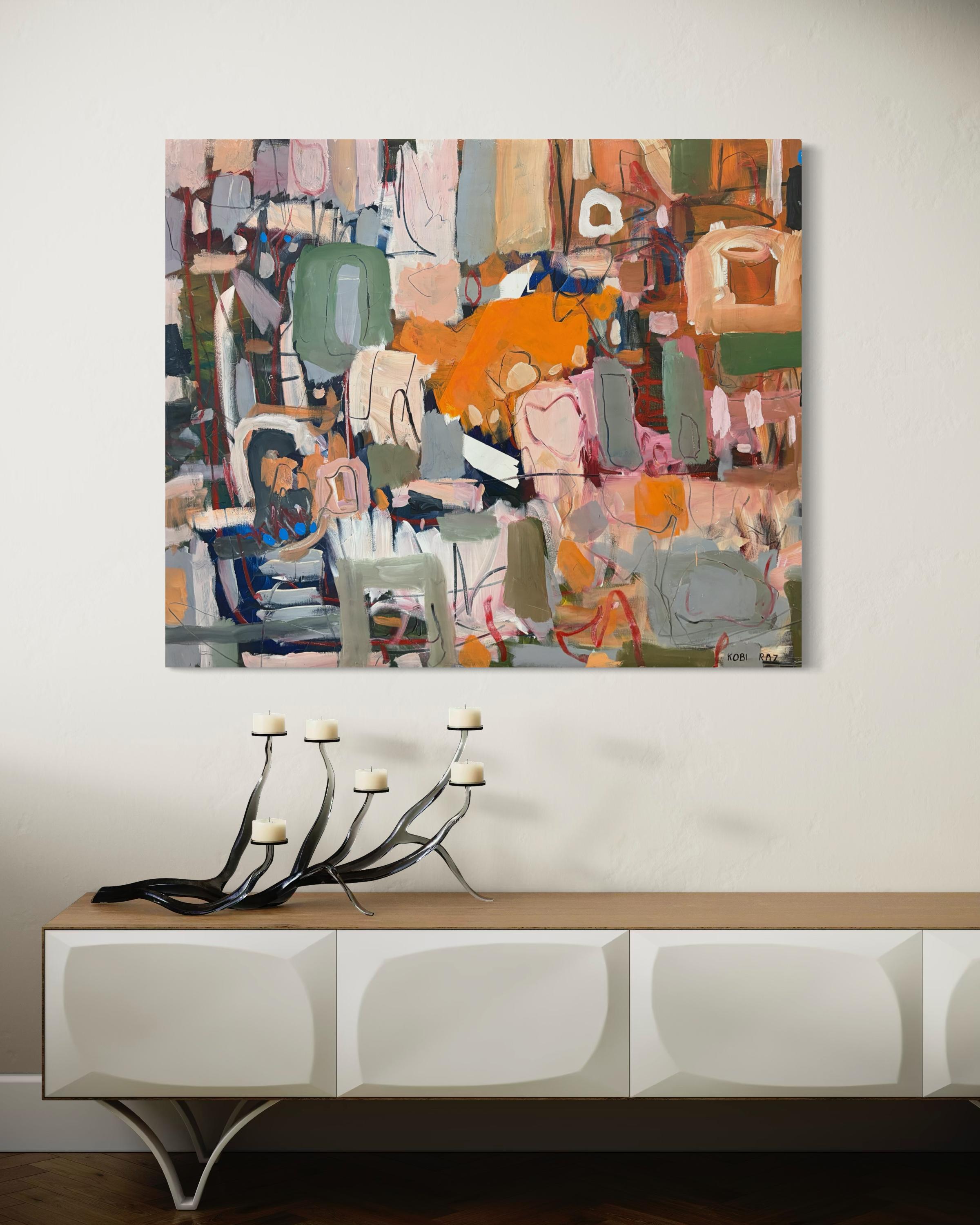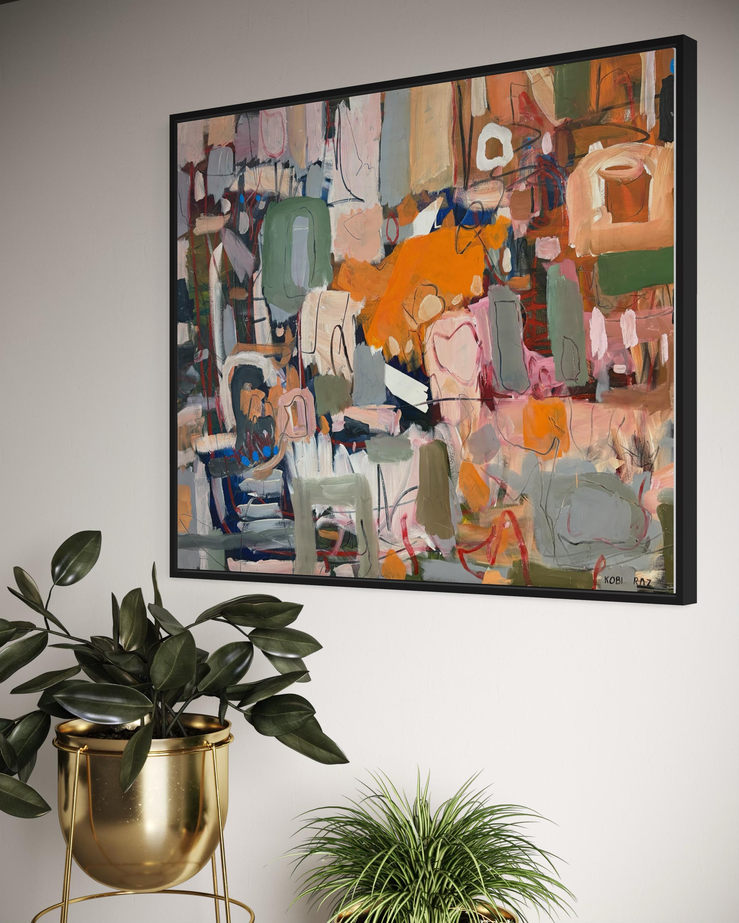 “Autumn Rhythm,” by contemporary artist Kobi Raz, captures the poetic energy of seasonal change through a vibrant, layered abstract composition. Warm tones of ochre, blush, and terracotta mingle with soft neutrals, sage greens, and touches of blue to create a visual symphony that feels alive with rhythm and emotion.