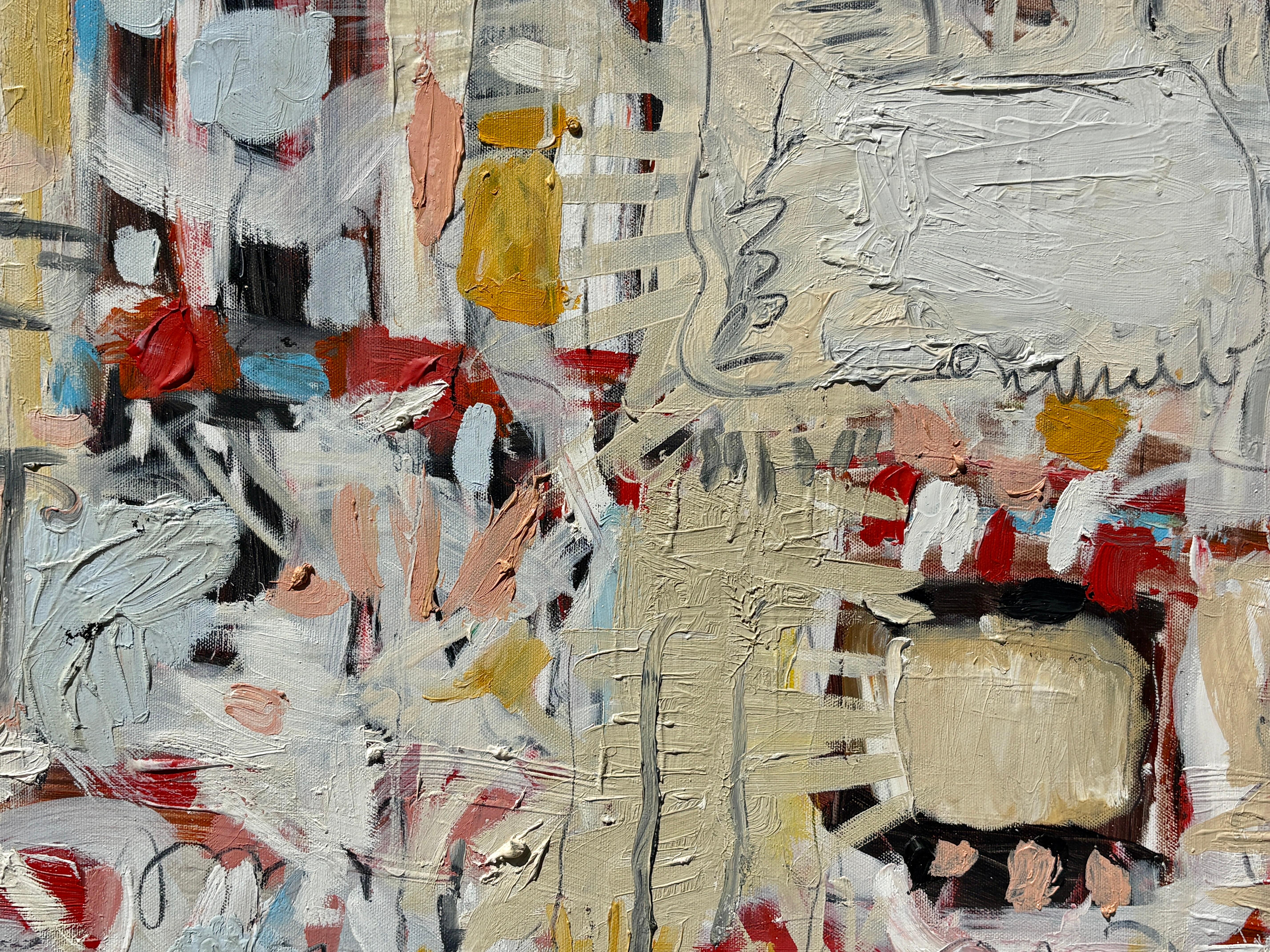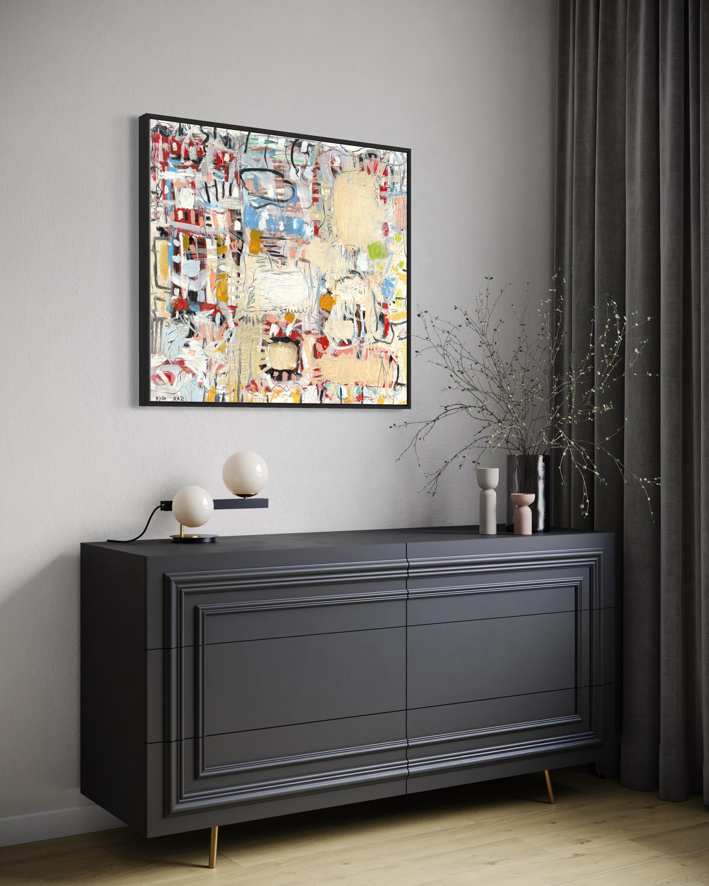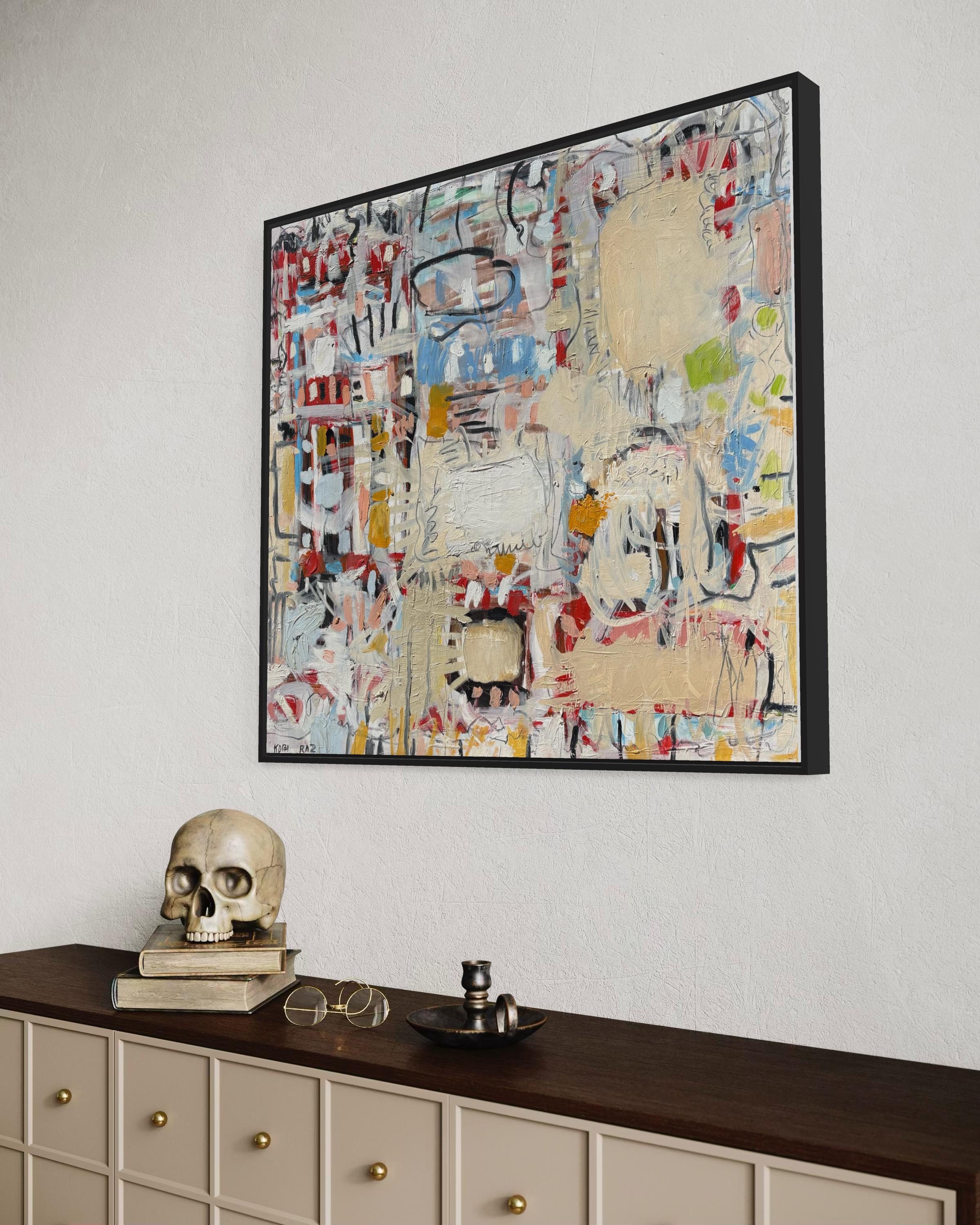 This original abstract painting by Kobi Raz evokes the layered beauty and mystery of a desert landscape. Through a masterful interplay of texture, gesture, and color, Raz builds a visual language that feels both spontaneous and deeply rooted in place. Earthy tones of sand, clay, and sunbaked ochre mingle with touches of red, black, and soft blue, like remnants of wind, stone, and distant horizons. The surface is richly worked, its layered brushstrokes and scrawled lines suggesting weathered textures, shifting light, and the quiet rhythm of nature meeting human expression.