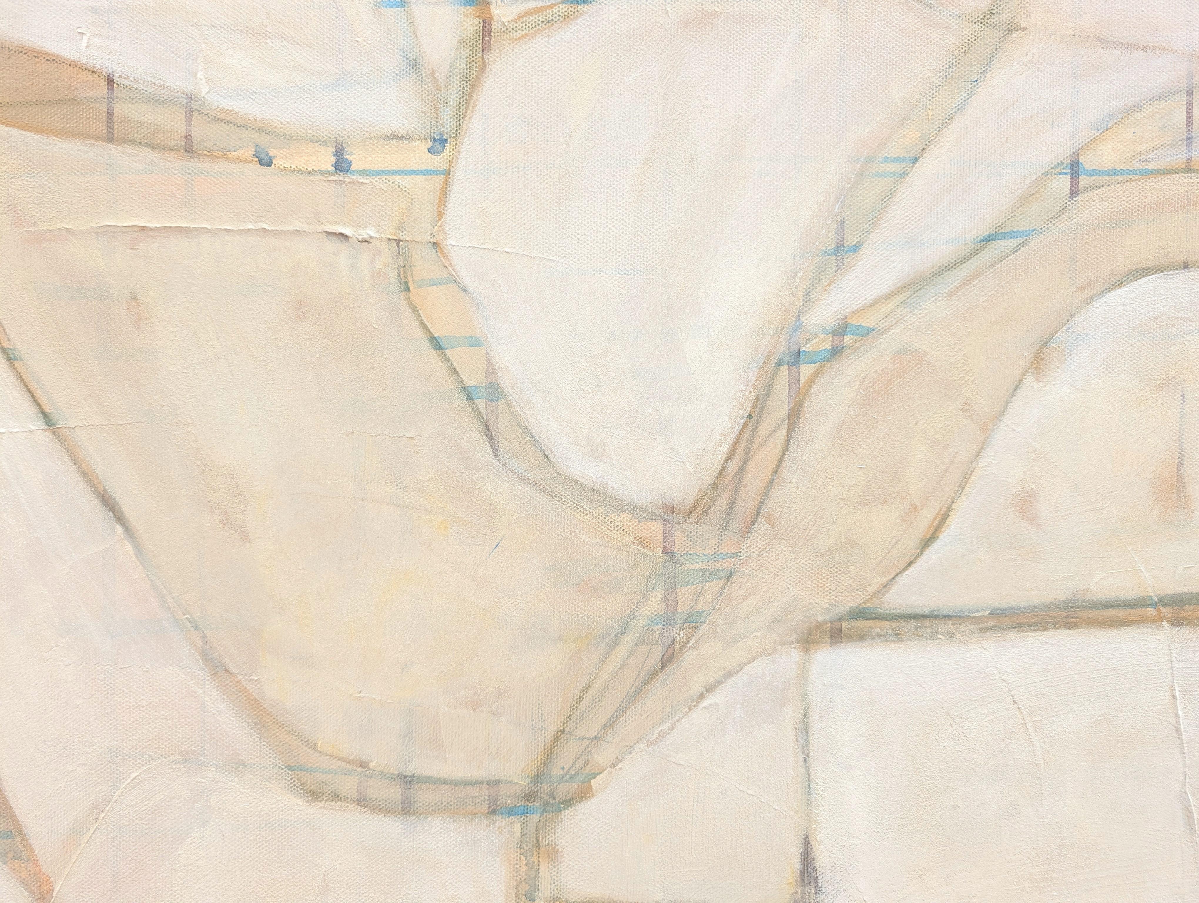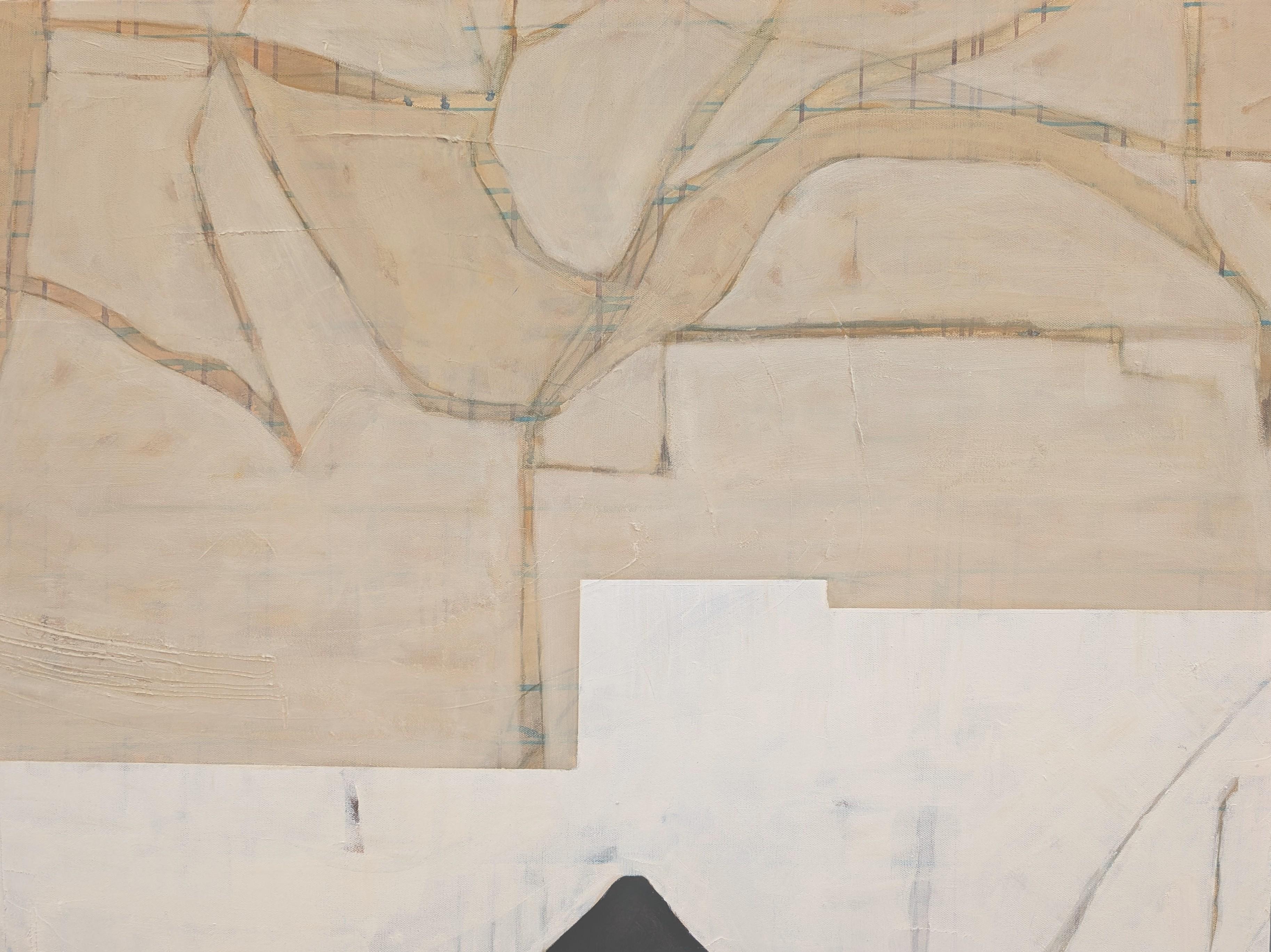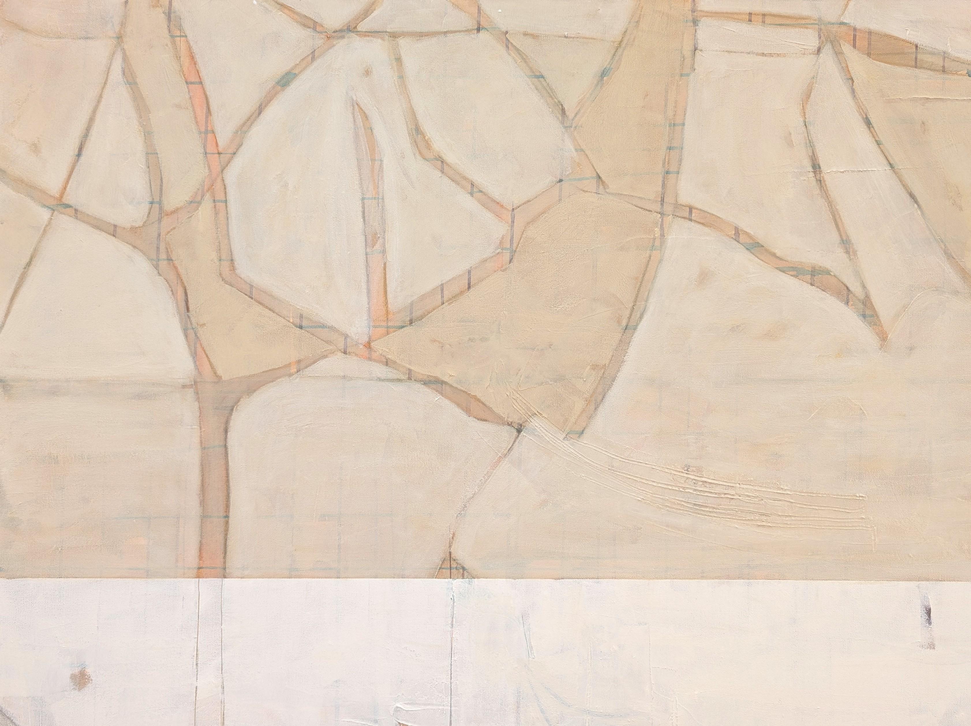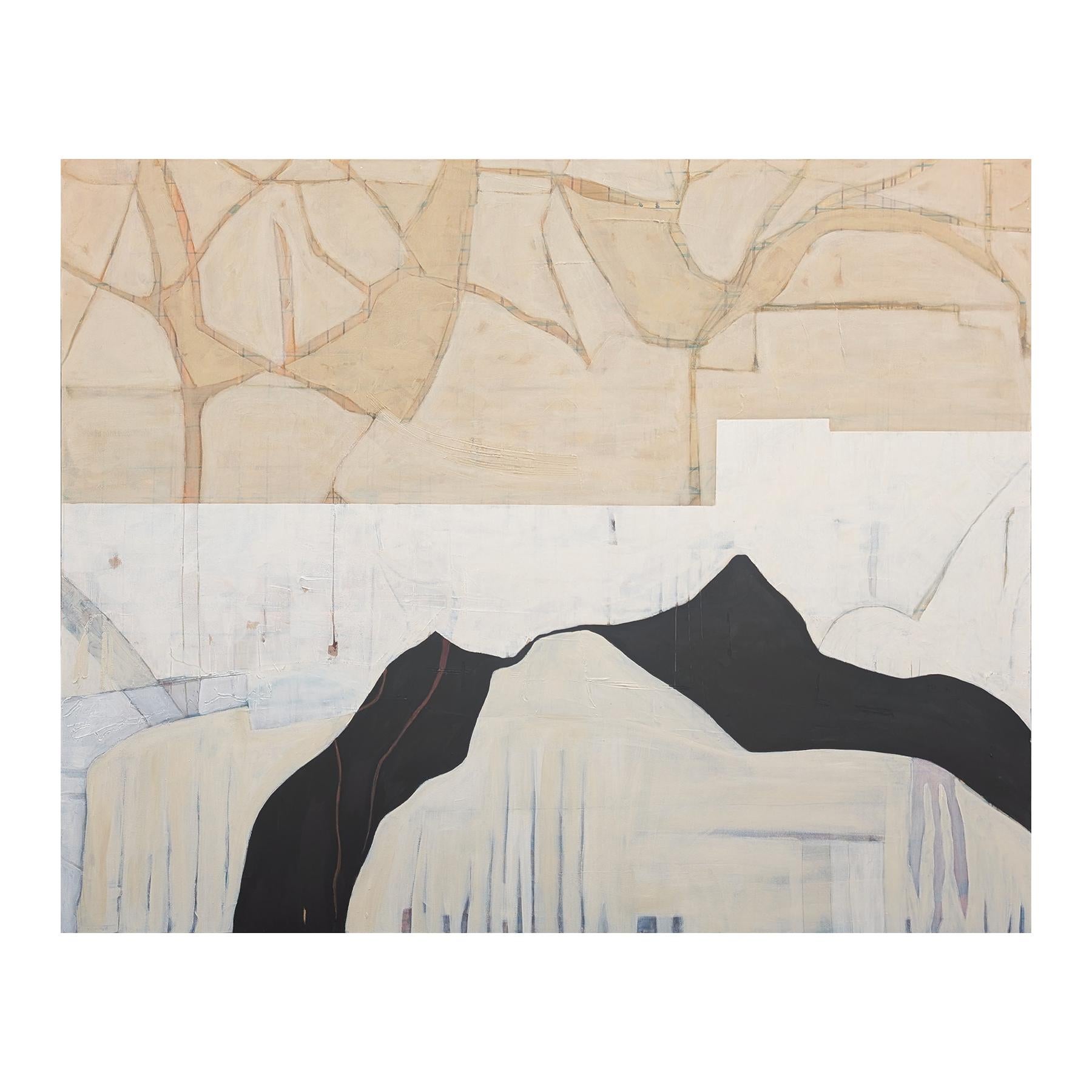 Contemporary neutral toned abstract landscape painting by Houston-based artist Kristen Anton. The work features tan and white planes of color accented with hints of tree branches and roots. Signed, titled, and dated on the reverse. Currently unframed, but options are available.
