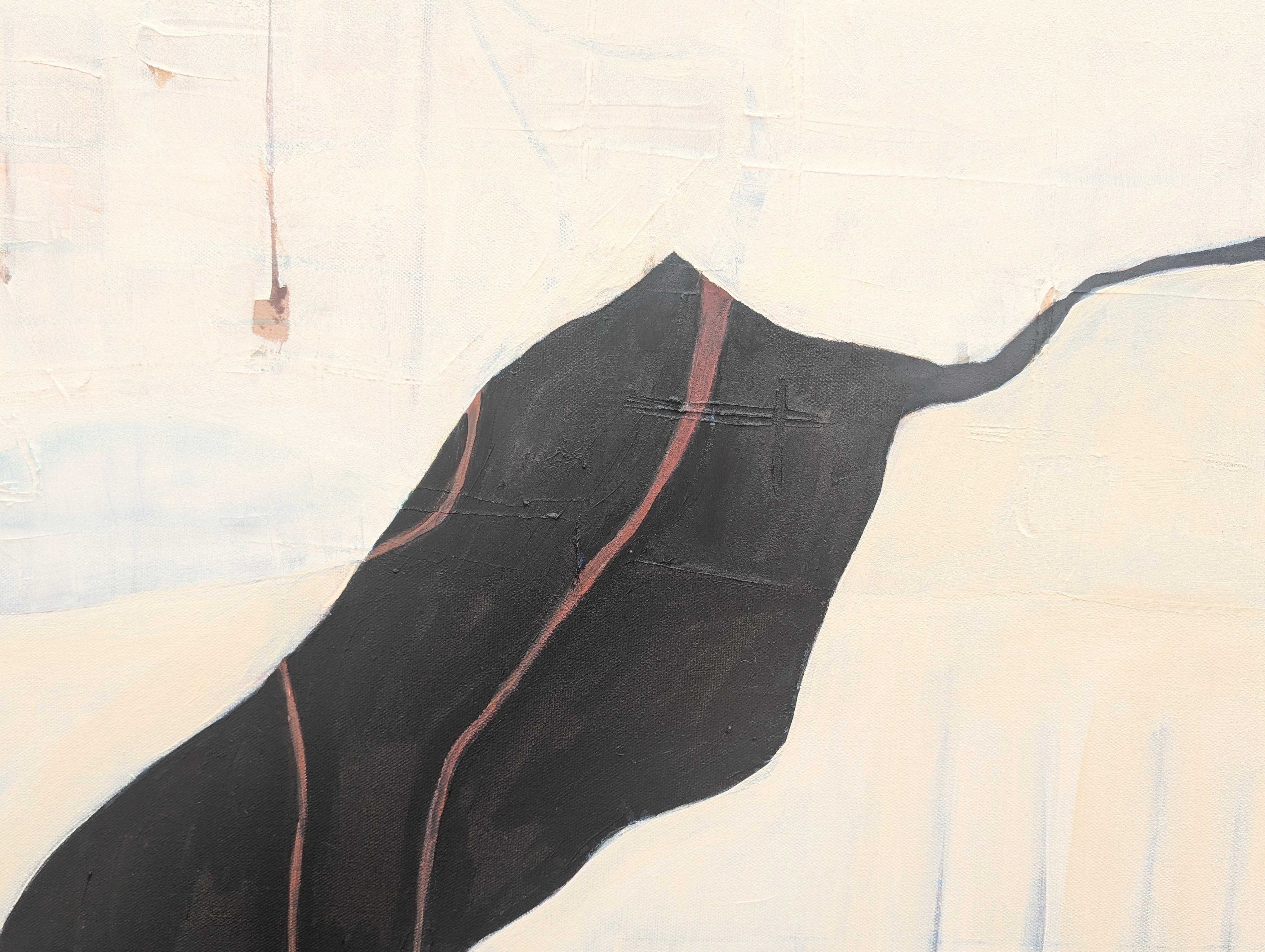 Contemporary neutral toned abstract painting by Houston-based artist Kristen Anton. The work features abstract black and blue shapes floating against an off-white field of color. Sig...