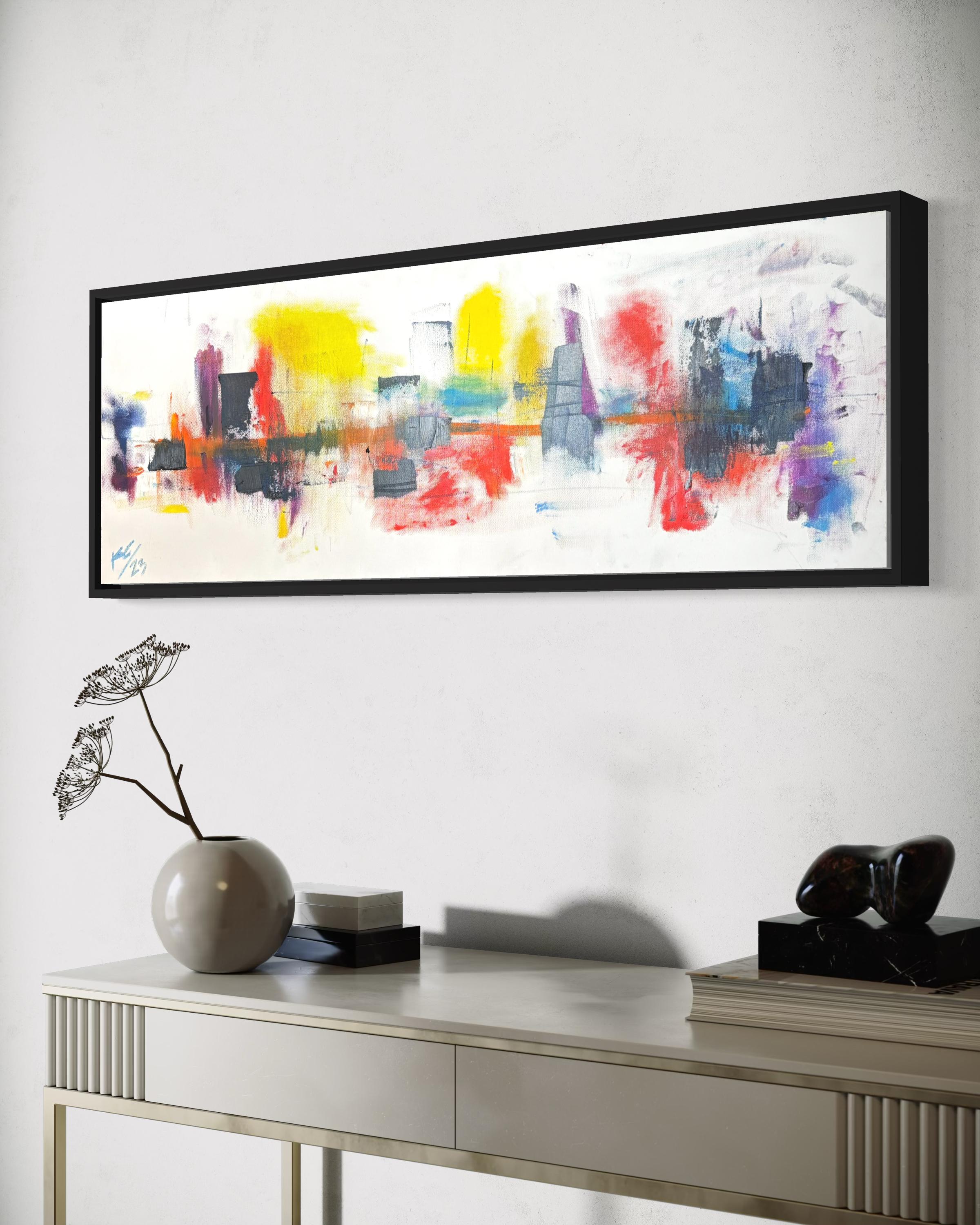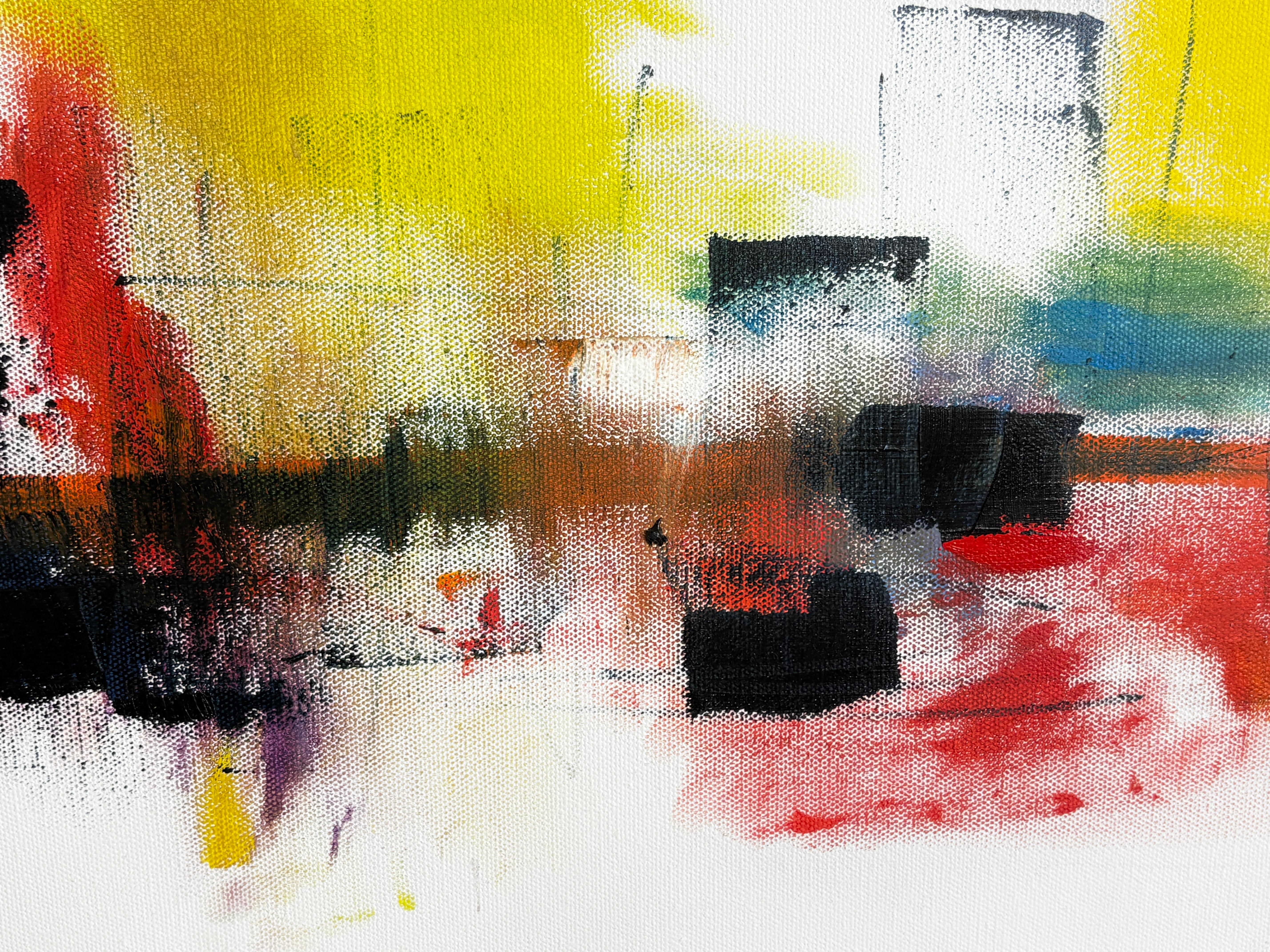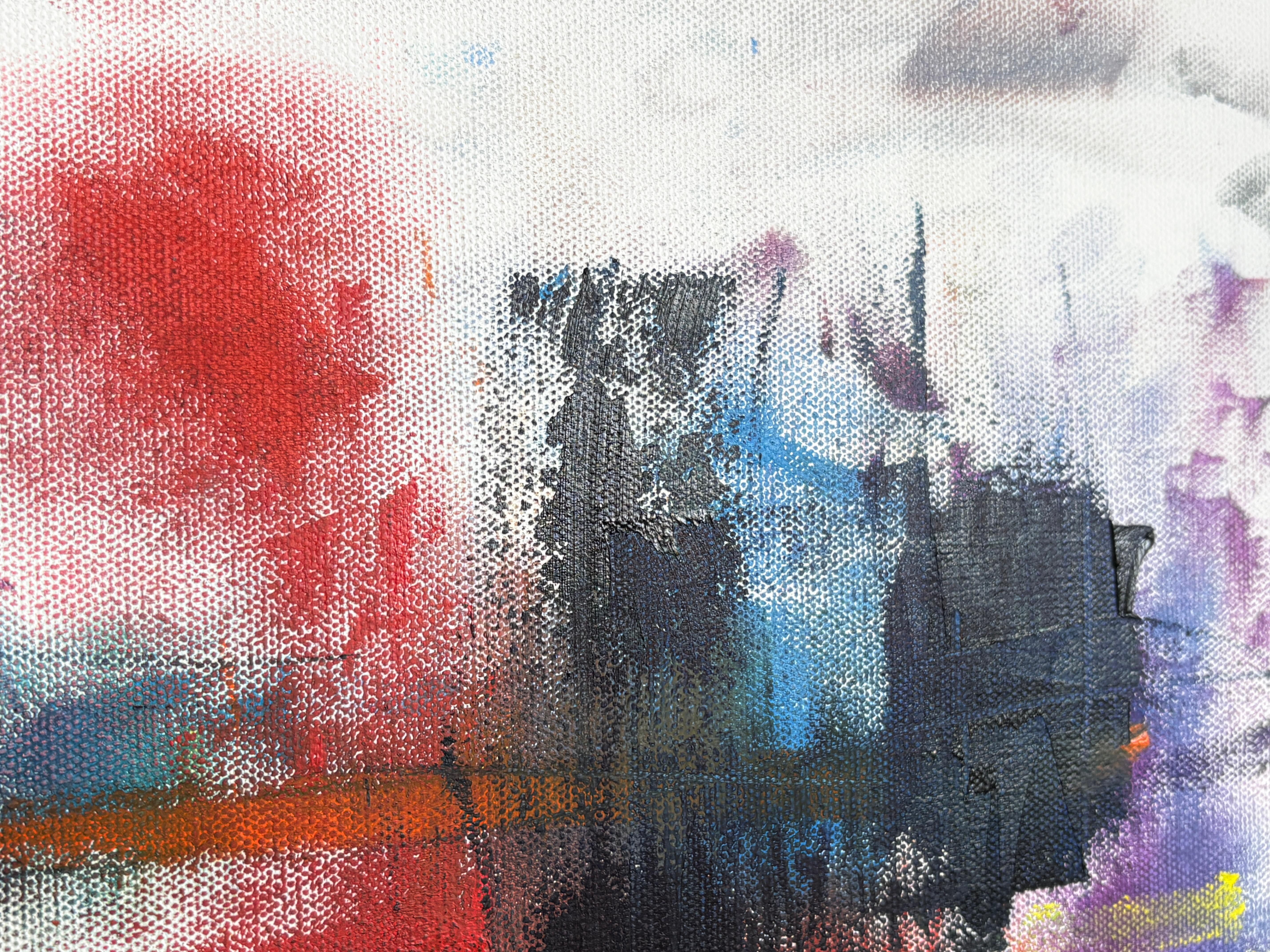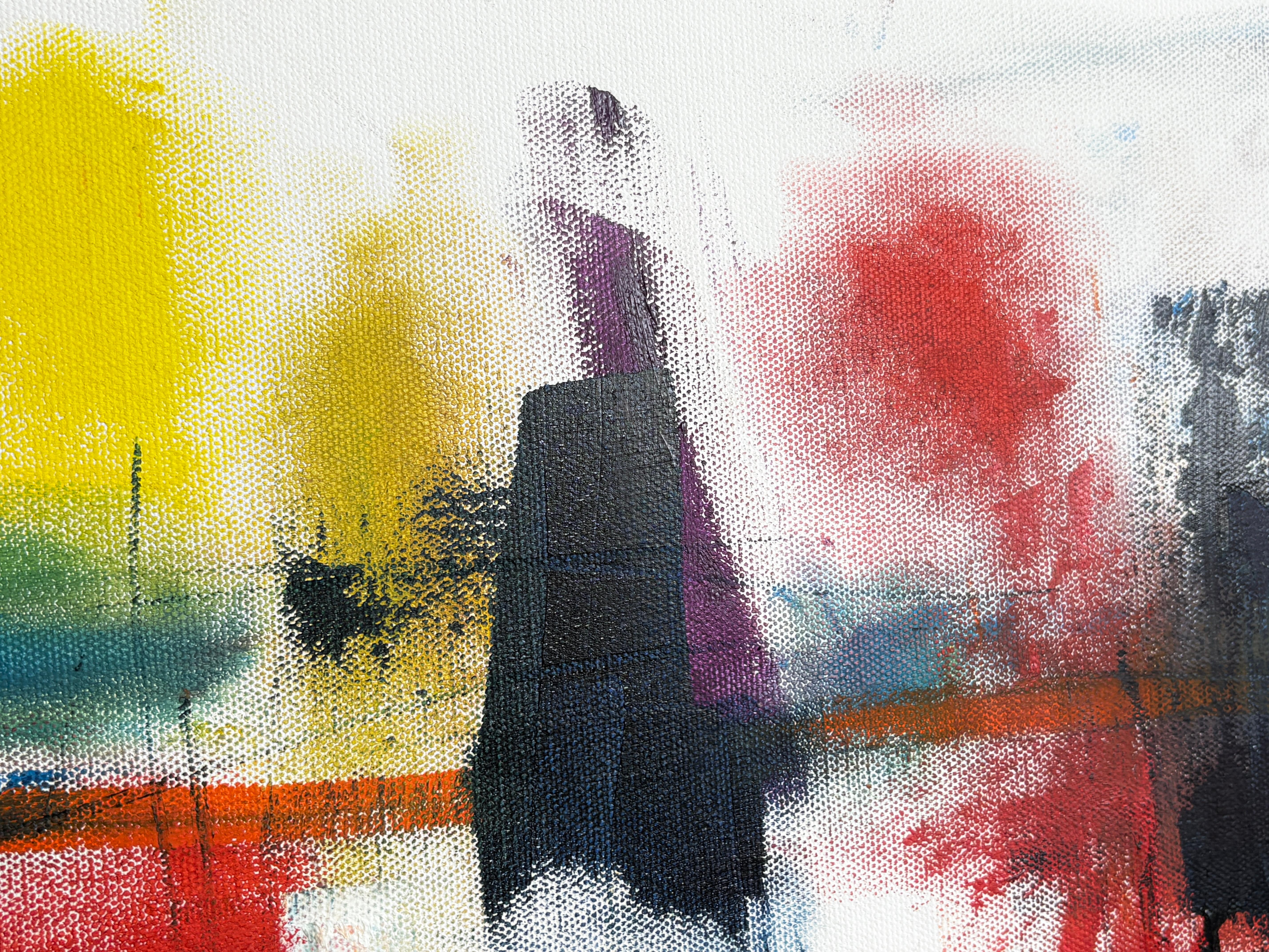 "Downtown" captures the pulse of city life through an expressive interplay of color, texture, and abstraction. Kristy Chettle layers bold hues of yellow, red, and violet with grounded tones of gray and black, evoking the vertical rhythm and reflective surfaces of an urban skyline. The painting’s composition suggests motion and energy, vibrant color blocks dissolve into atmospheric light, hinting at skyscrapers, streets, and shifting reflections. Chettle’s confident brushwork and balanced use of negative space bring both structure and spontaneity to the piece.