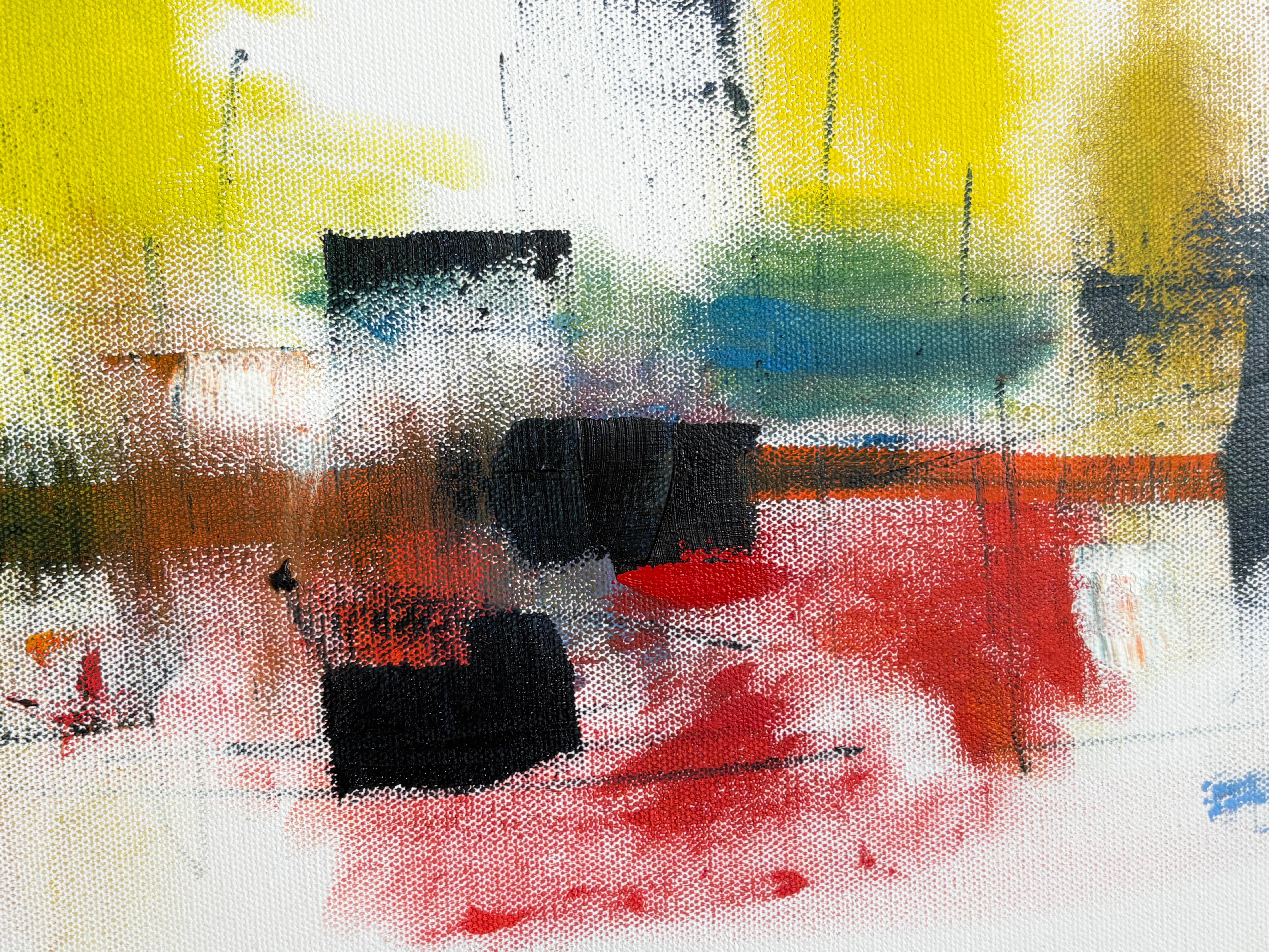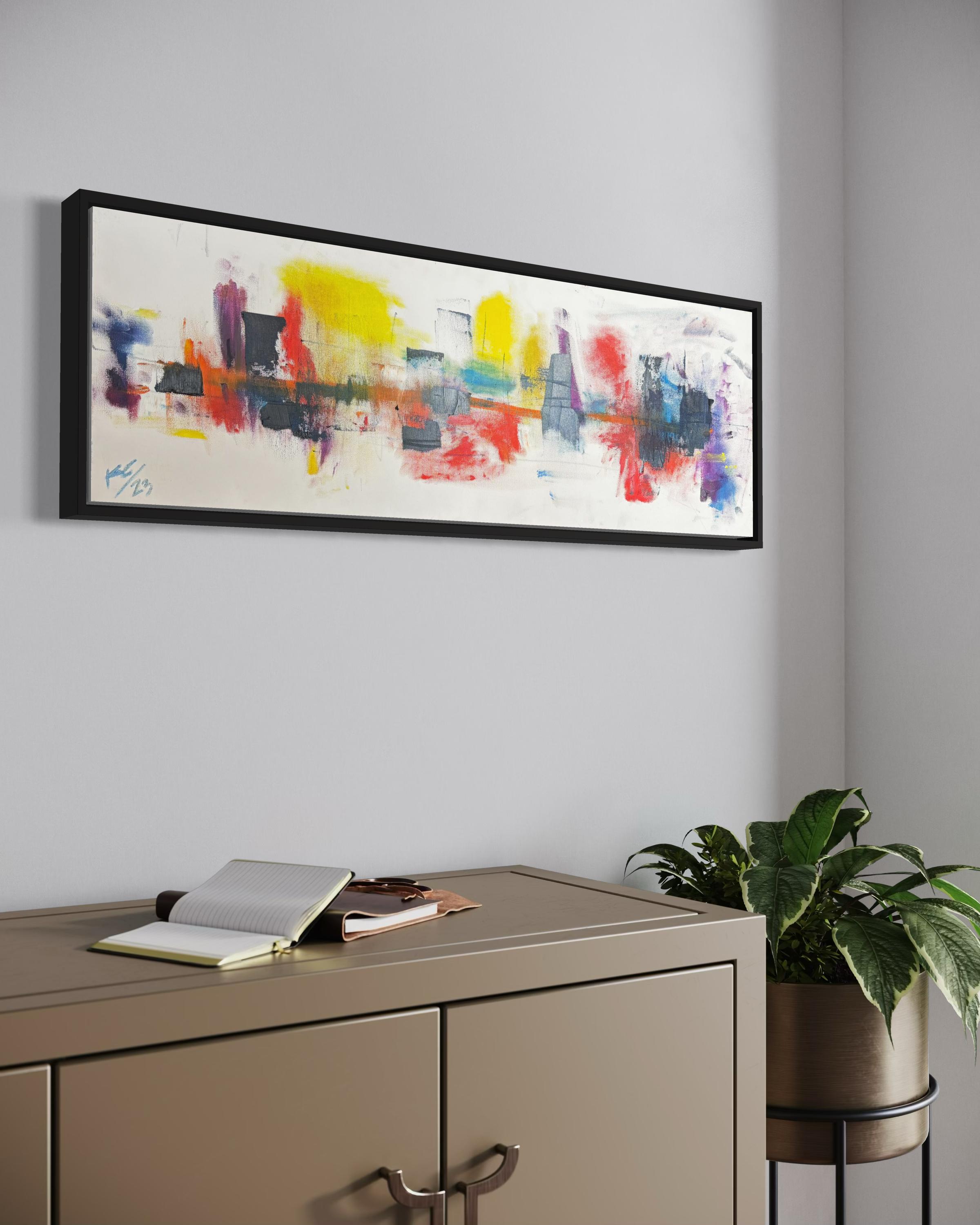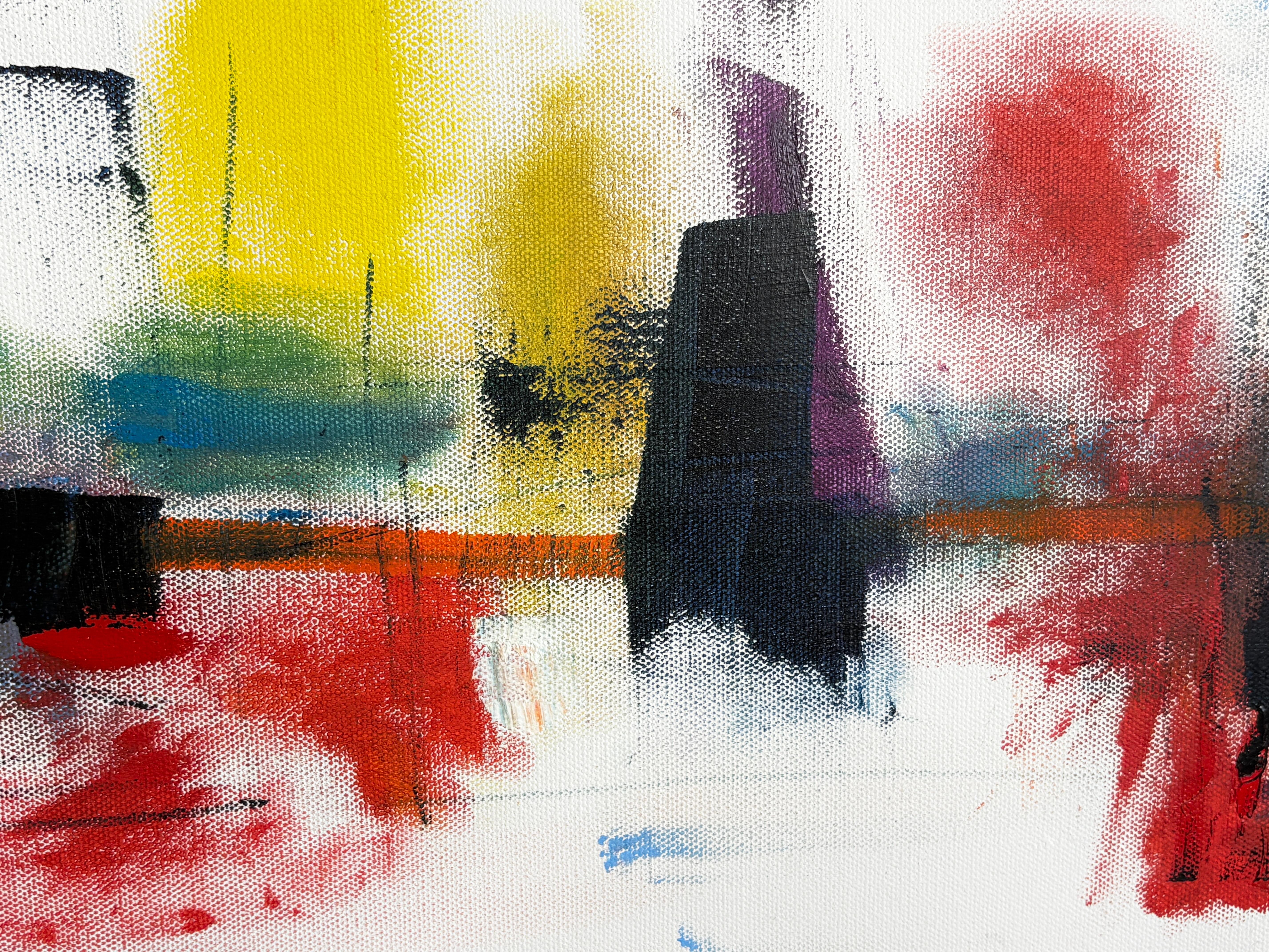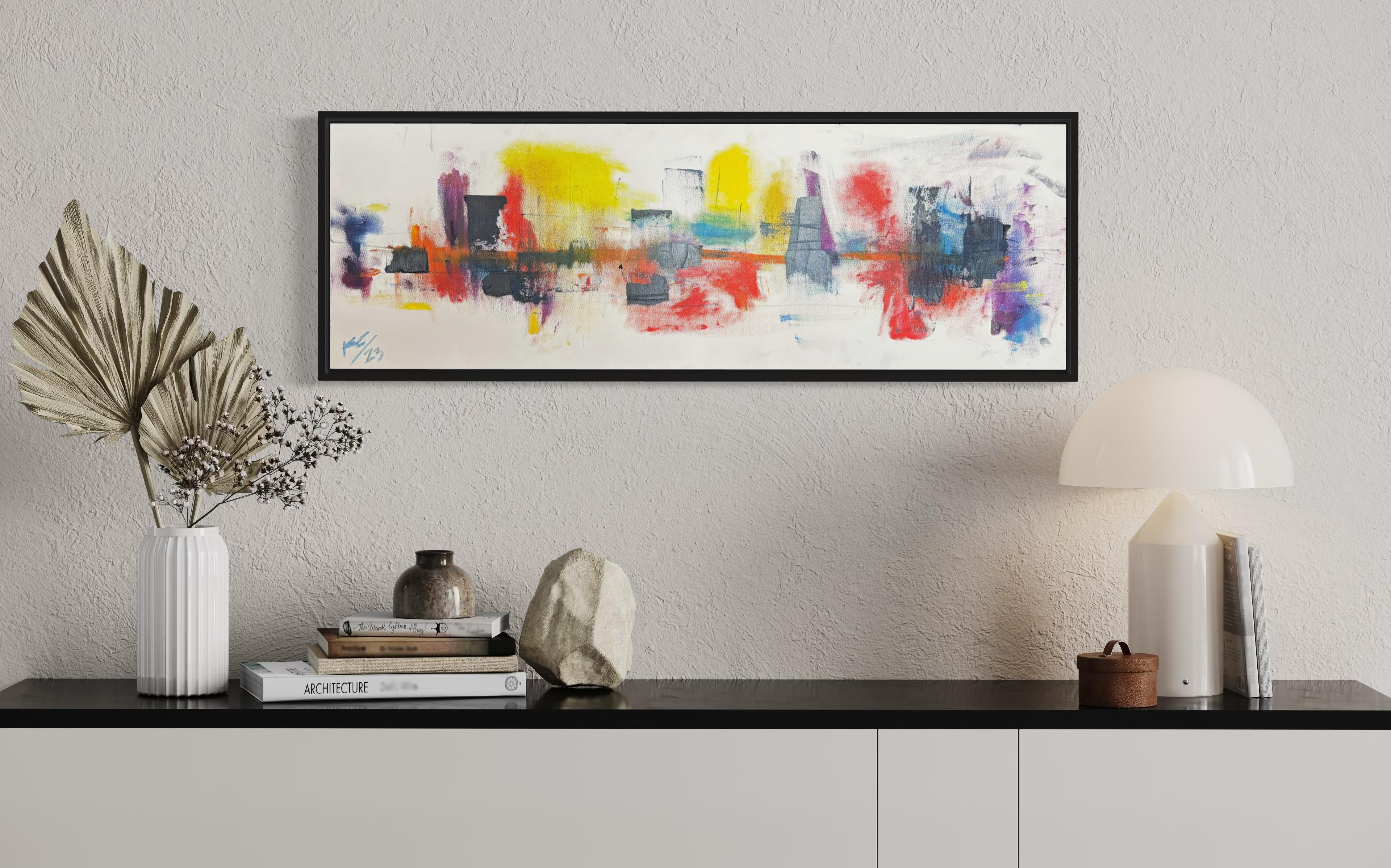 "Downtown" captures the pulse of city life through an expressive interplay of color, texture, and abstraction. Kristy Chettle layers bold hues of yellow, red, and violet with grounded tones of gray and black, evoking the vertical rhythm and reflective surfaces of an urban skyline. The painting’s composition suggests motion and energy, vibrant color blocks dissolve into atmospheric light, hinting at skyscrapers, streets, and shifting reflections. Chettle’s confident brushwork and balanced use of negative space bring both structure and spontaneity to the piece.