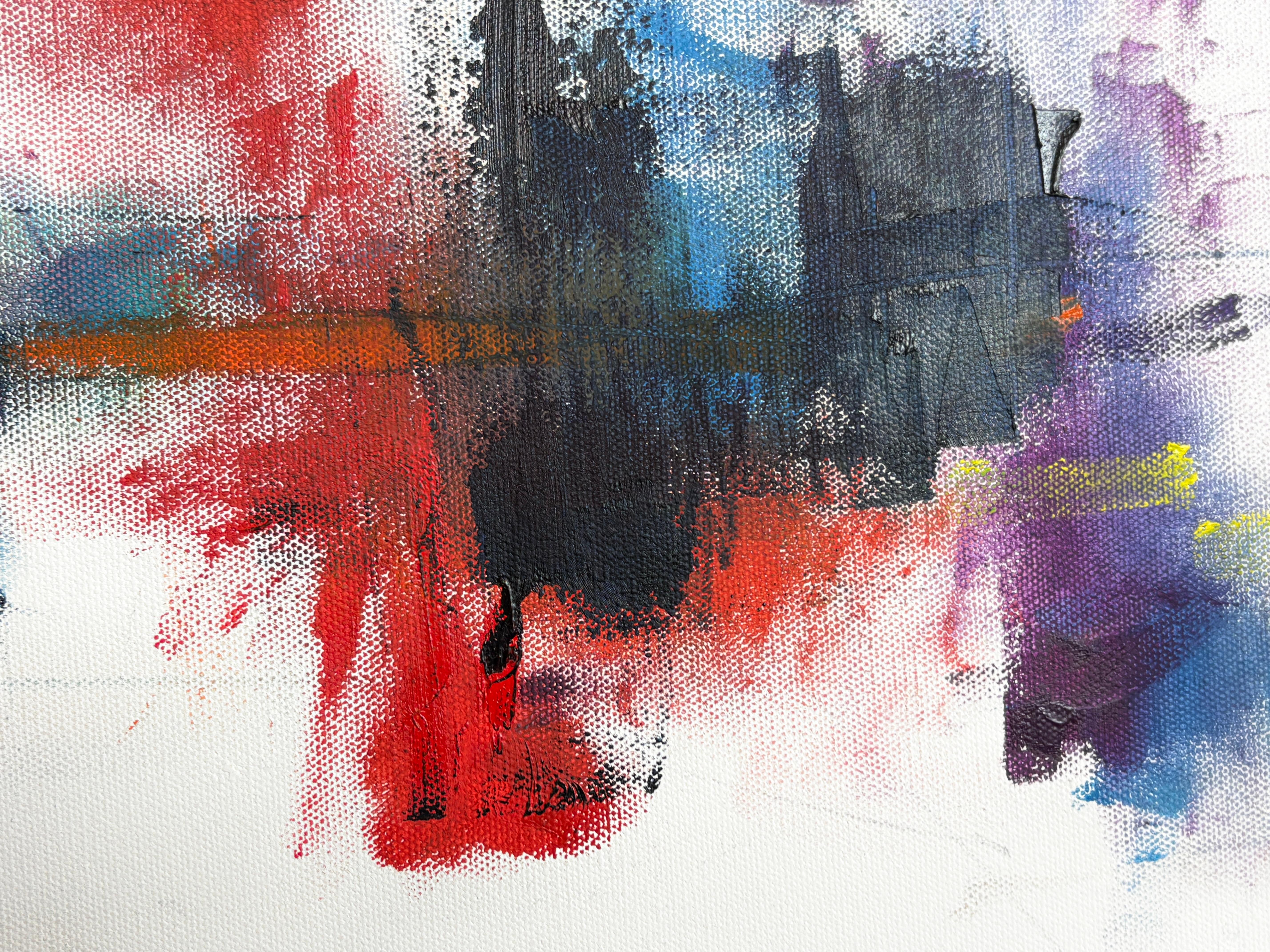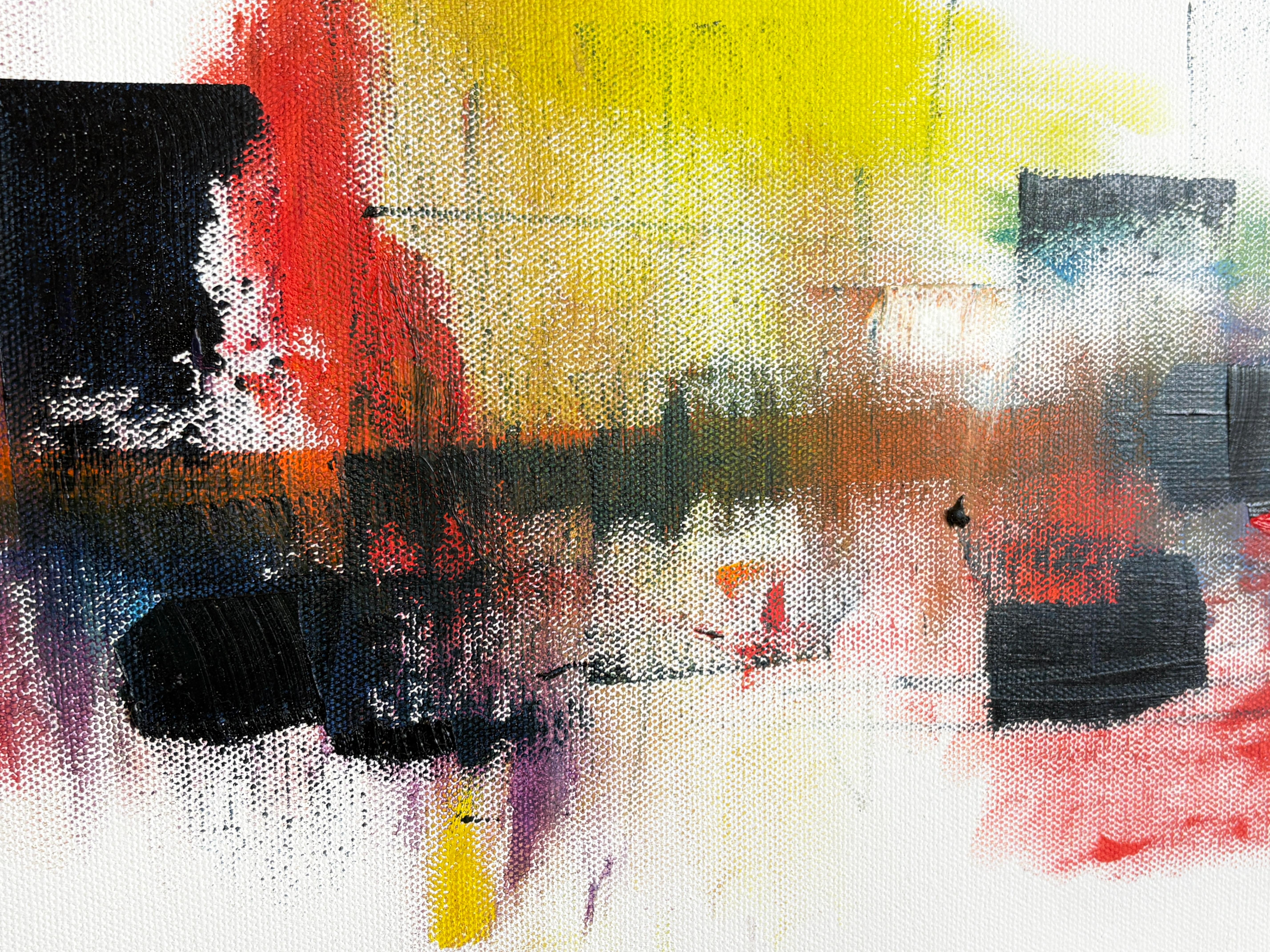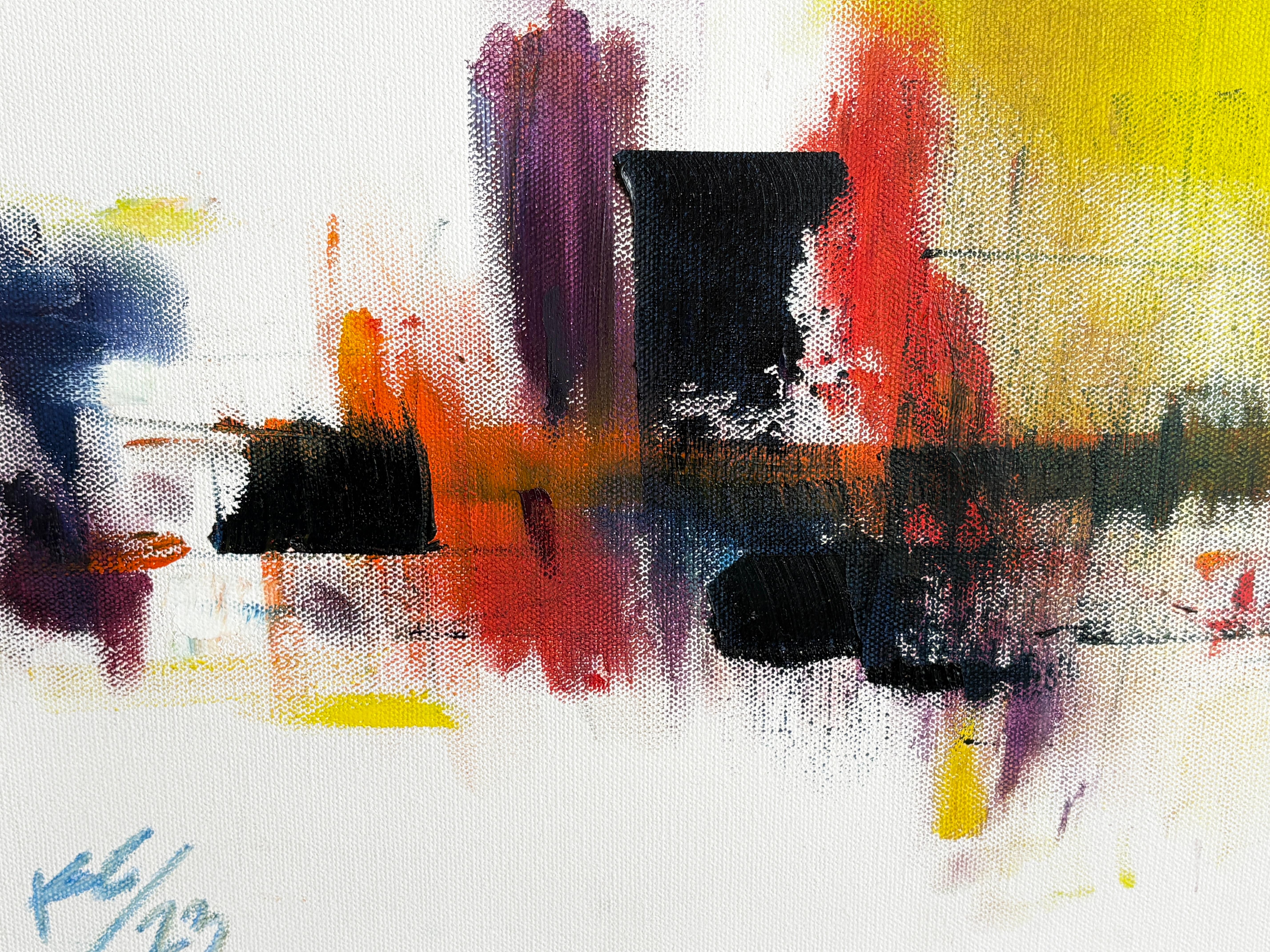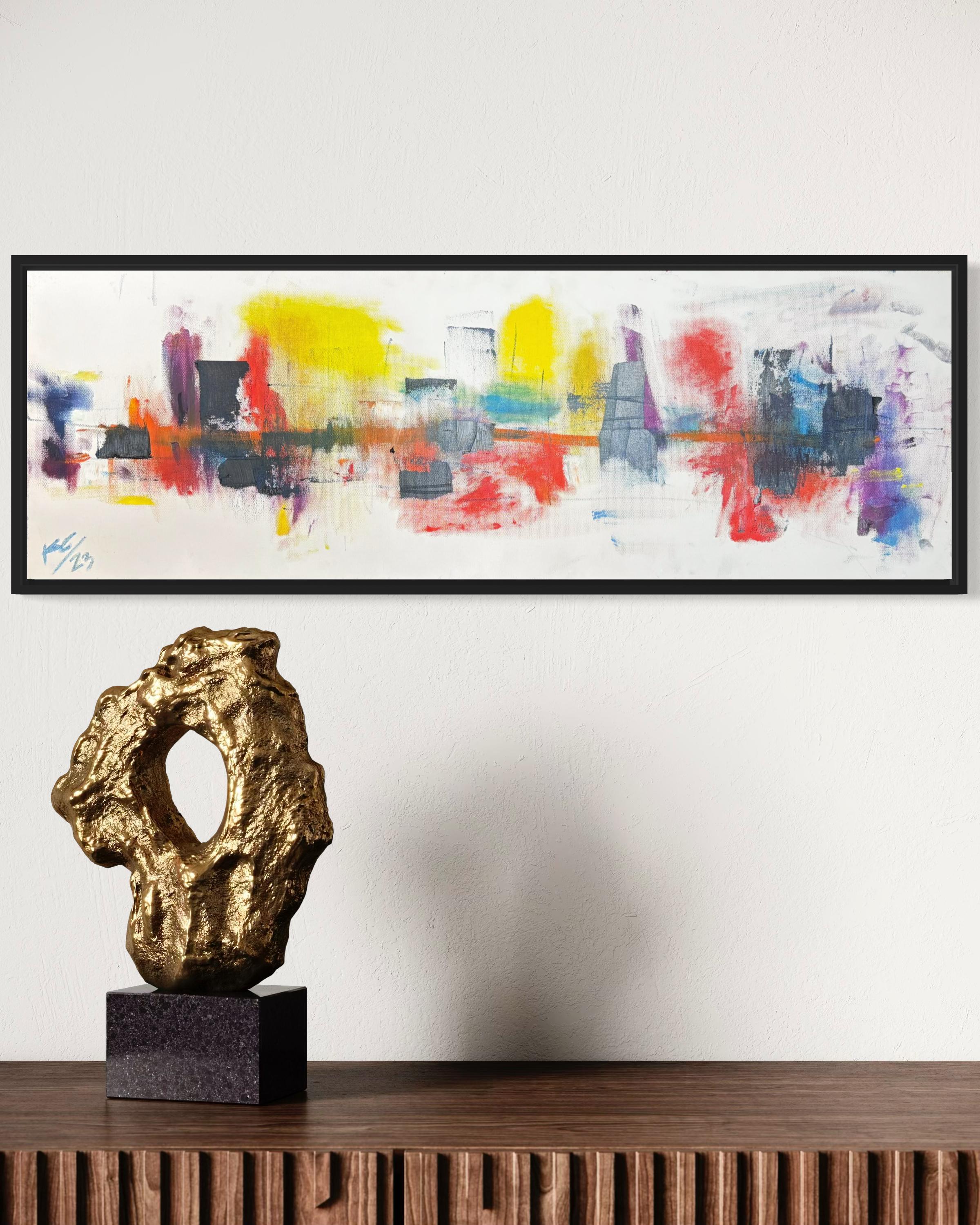 "Downtown" captures the pulse of city life through an expressive interplay of color, texture, and abstraction. Kristy Chettle layers bold hues of yellow, red, and violet with grounded tones of gray and black, evoking the vertical rhythm and reflective surfaces of an urban skyline. The painting’s composition suggests motion and energy, vibrant color blocks dissolve into atmospheric light, hinting at skyscrapers, streets, and shifting reflections. Chettle’s confident brushwork and balanced use of negative space bring both structure and spontaneity to the piece.