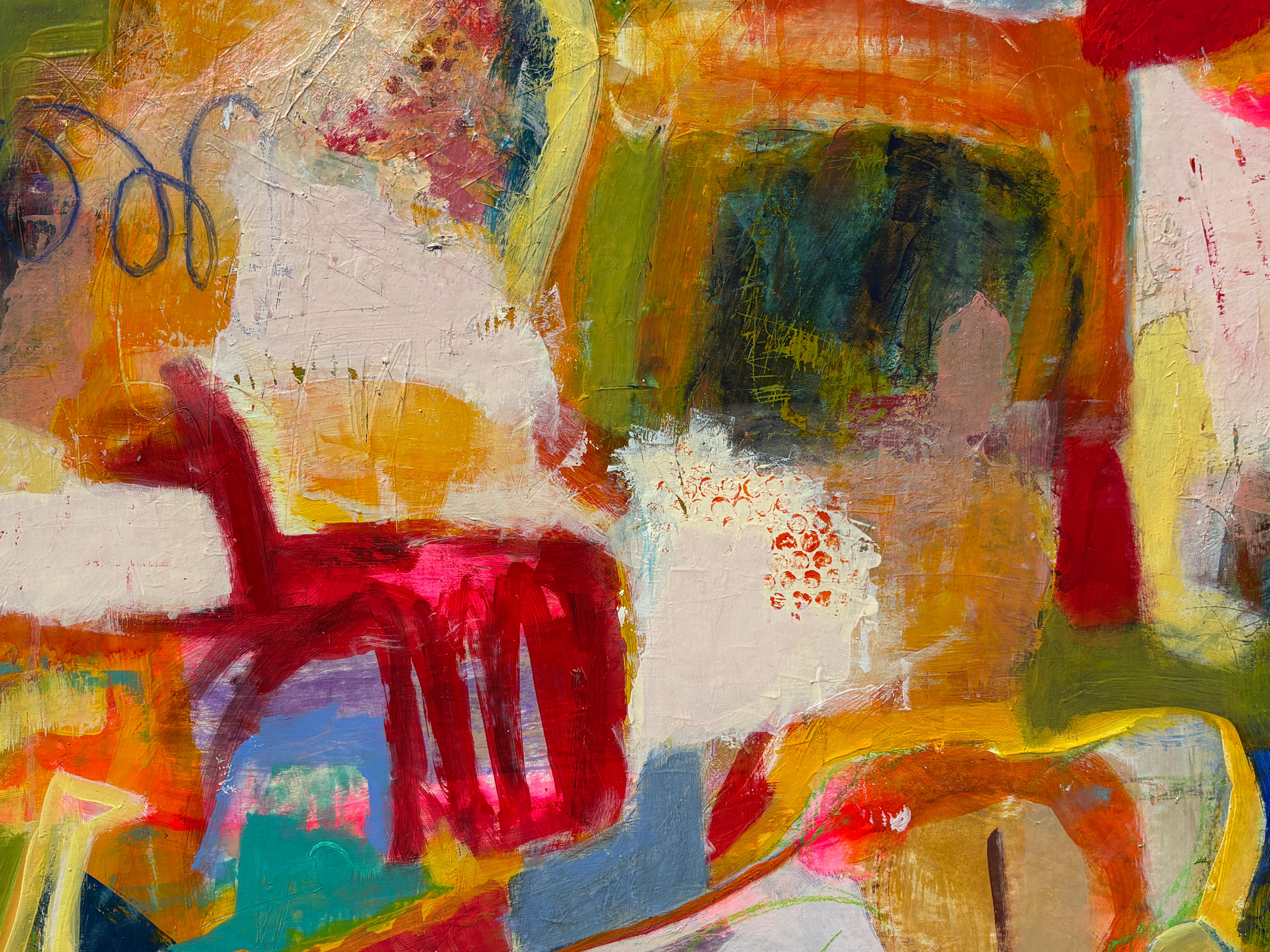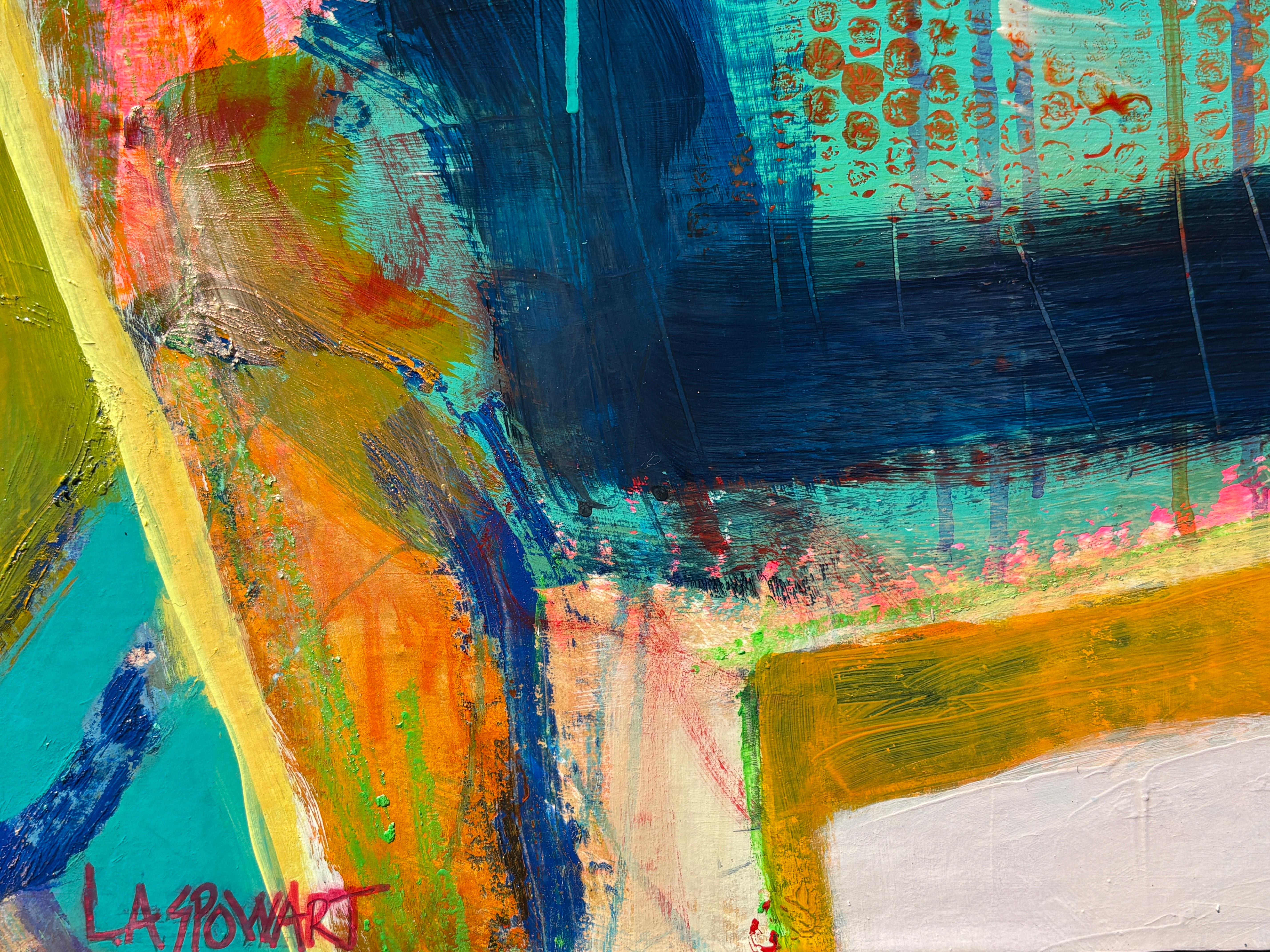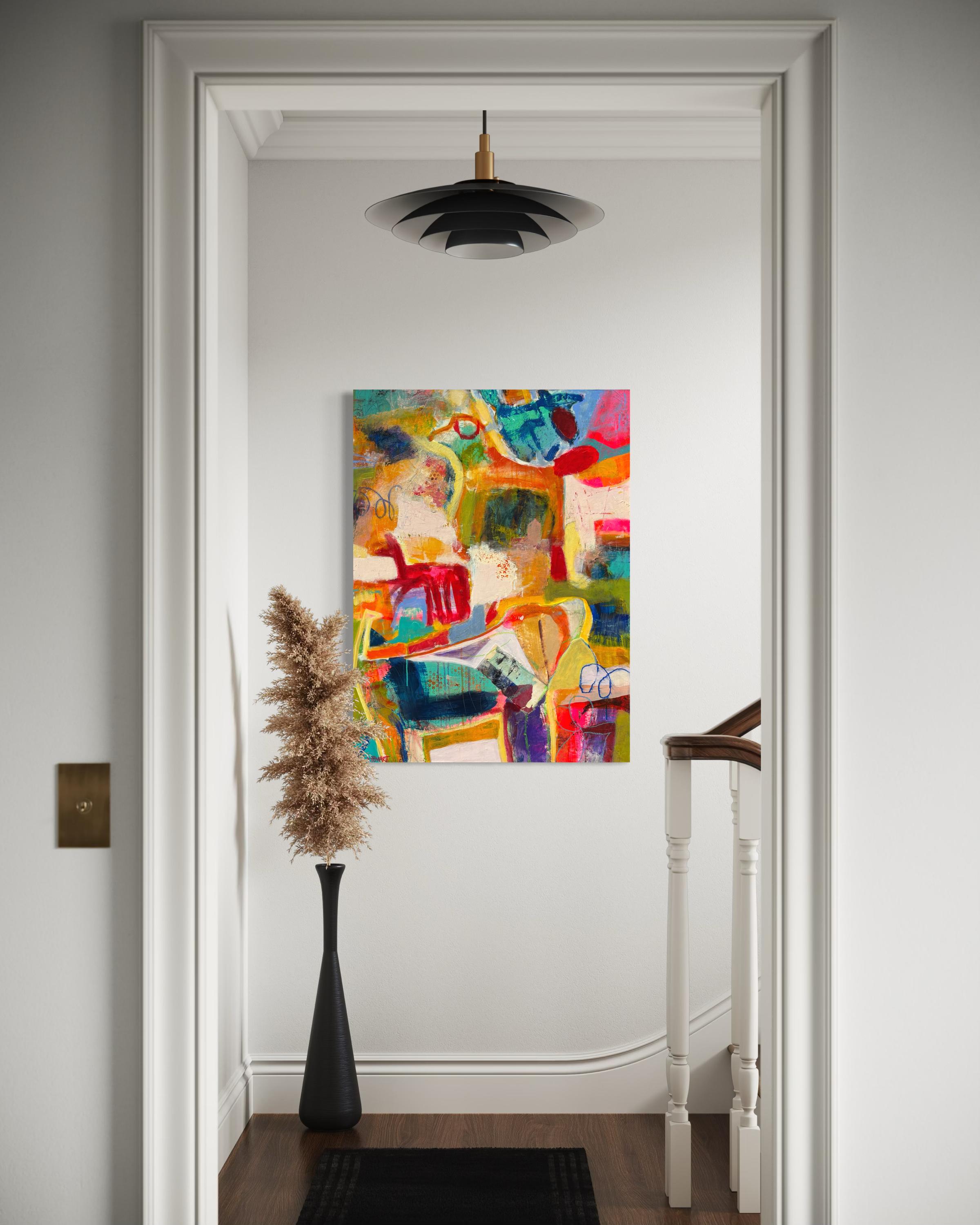 "Canines in Situ," a vibrant contemporary abstract expressionist painting alive with movement, color, and playful energy. Bursts of bold red, blue, orange, and green intertwine with layered textures and gestural marks, creating a lively scene that suggests the spirited presence of dogs in an imaginative abstract setting. Spowart’s use of expressive brushwork and joyful color makes the piece both dynamic and uplifting, a true statement artwork that balances spontaneity with structure. Perfect for collectors of colorful abstract art and modern expressionism, this original painting captures both whimsy and sophistication.