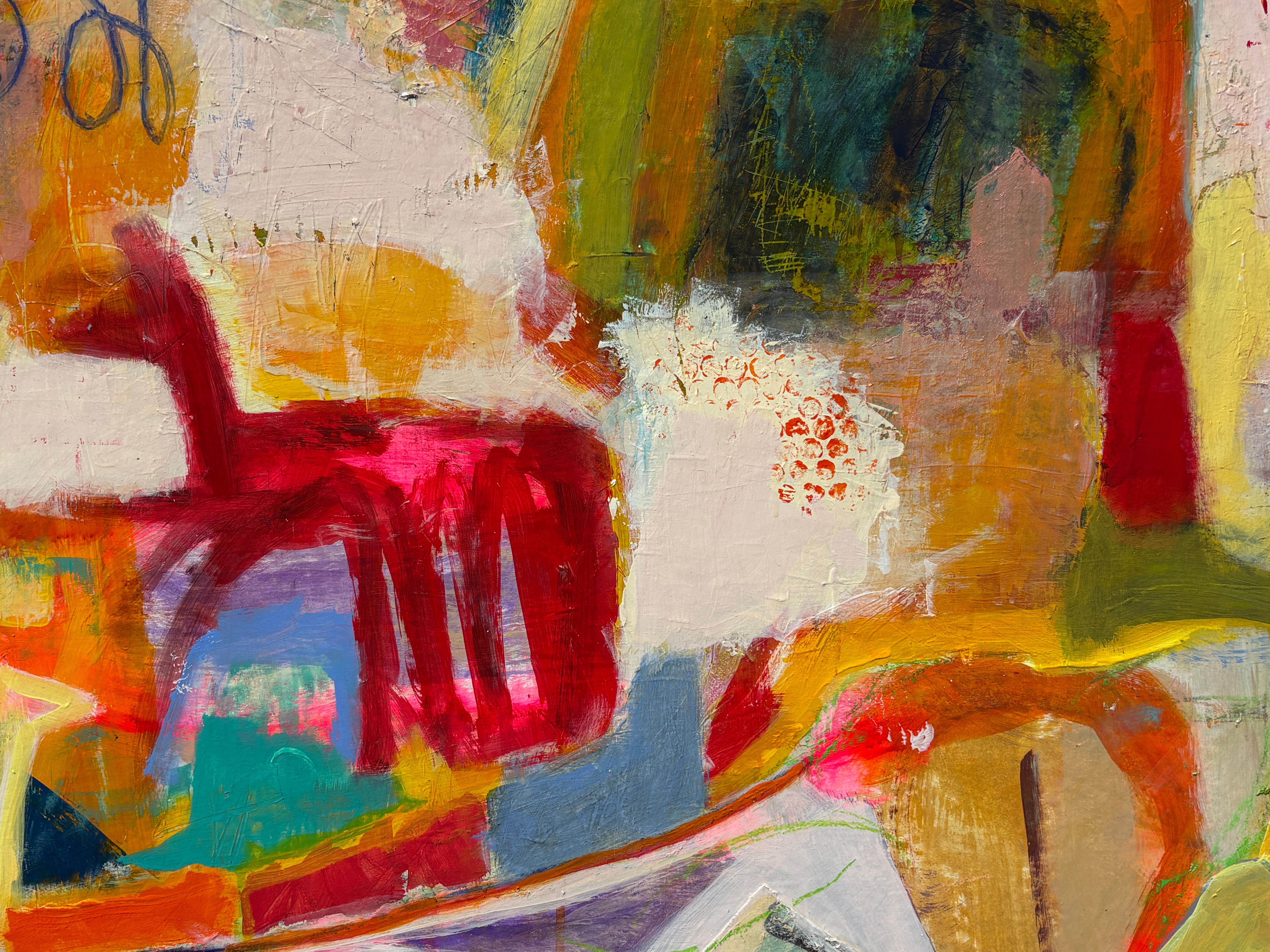 "Bursting with blocks of color, this piece is fun and happy. Sometimes a bright cheer...
