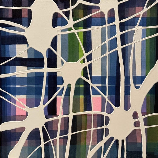 Lindsey Nobel uses science, technology, and the synapses or connections between all things and people via the infosphere in her paintings, drawings, sculpture and mixed media. Nobel’s language is primarily abstract which she uses to describe various subjects as diverse as quantum physics and siphonephores. The neurons that make up brain connections are often cited as imagery in her work.