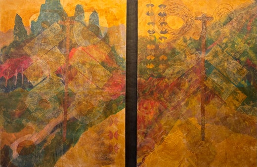 A range of materials, from rusted metal to handmade paper on an already highly textured surface create Cross-Roads, echoing an adage cautioning one not to confuse the actual world with our perception of the world. In other words, the map is not the territory and in this piece the map is the terrain. Not only are they one, but they work each other. This crossroads is not just a physical place but an ephemeral pause that we all know. As it emerges, the Cross-Roads works us, to change us---- just as surely as we modify it long after the event is gone.