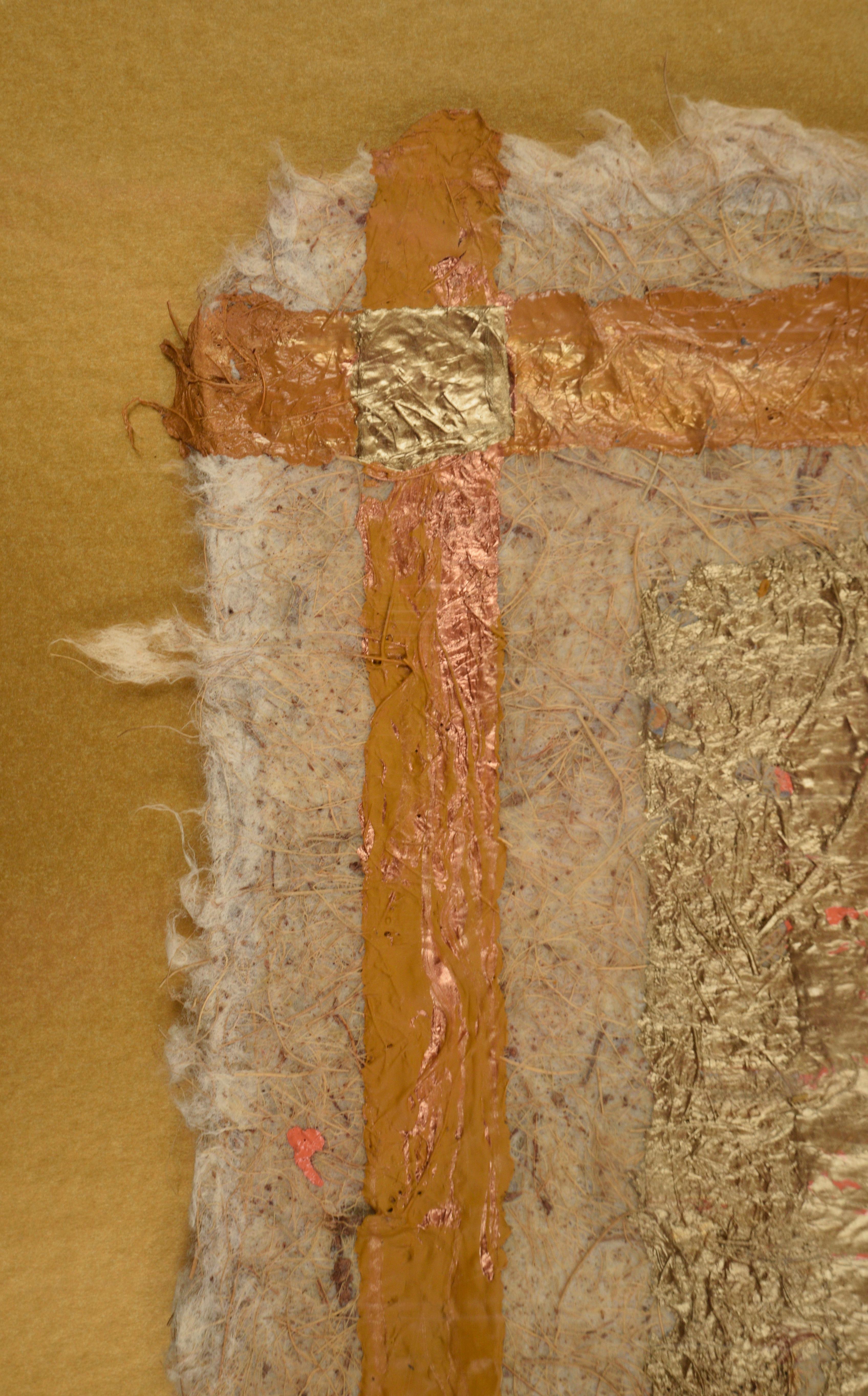 Bright, highly textural abstract painting on handmade hemp paper by Marc Foster Grant (American, b. 1947). Bold, heavy gold, bronze, and orange paint...