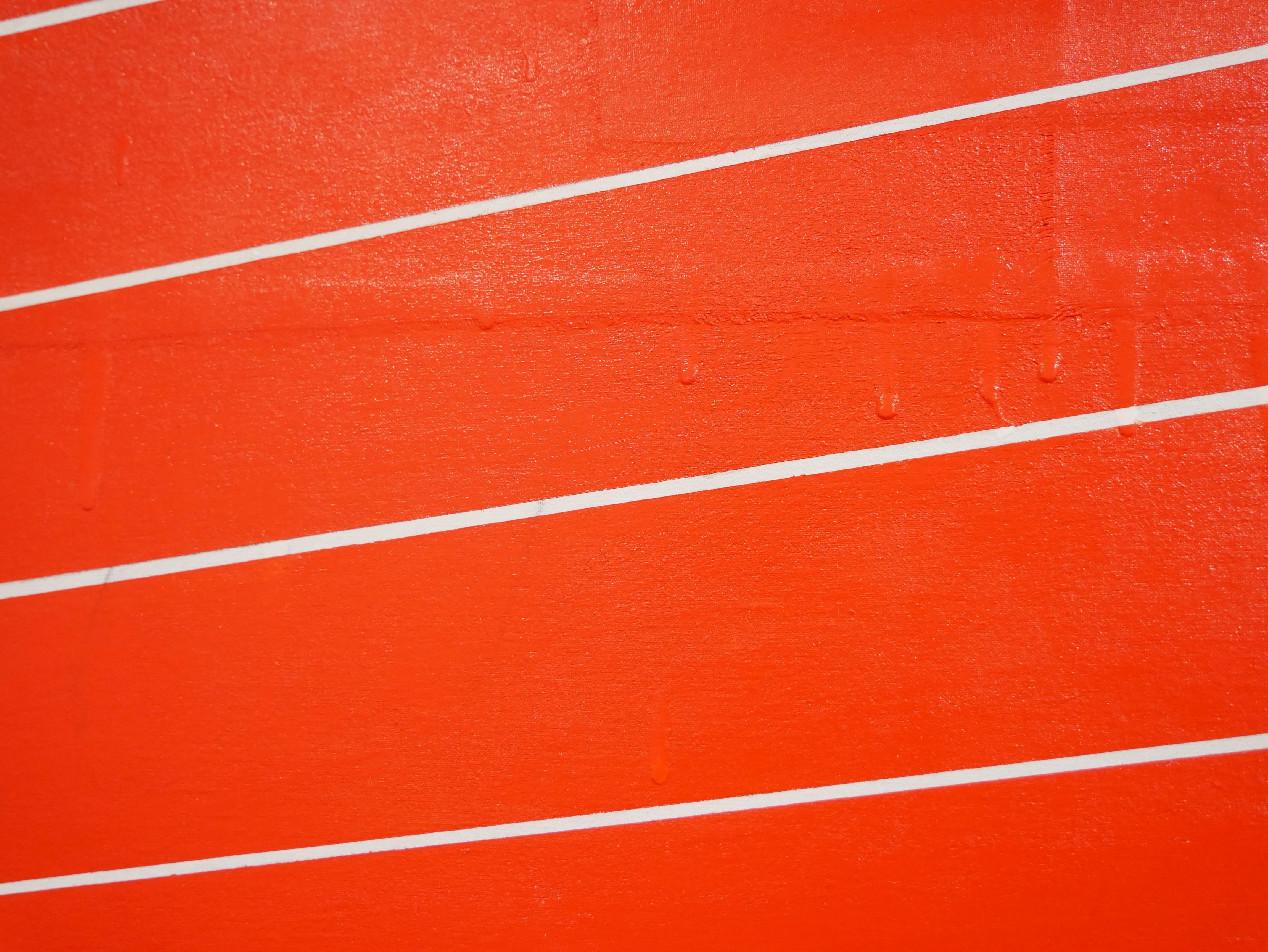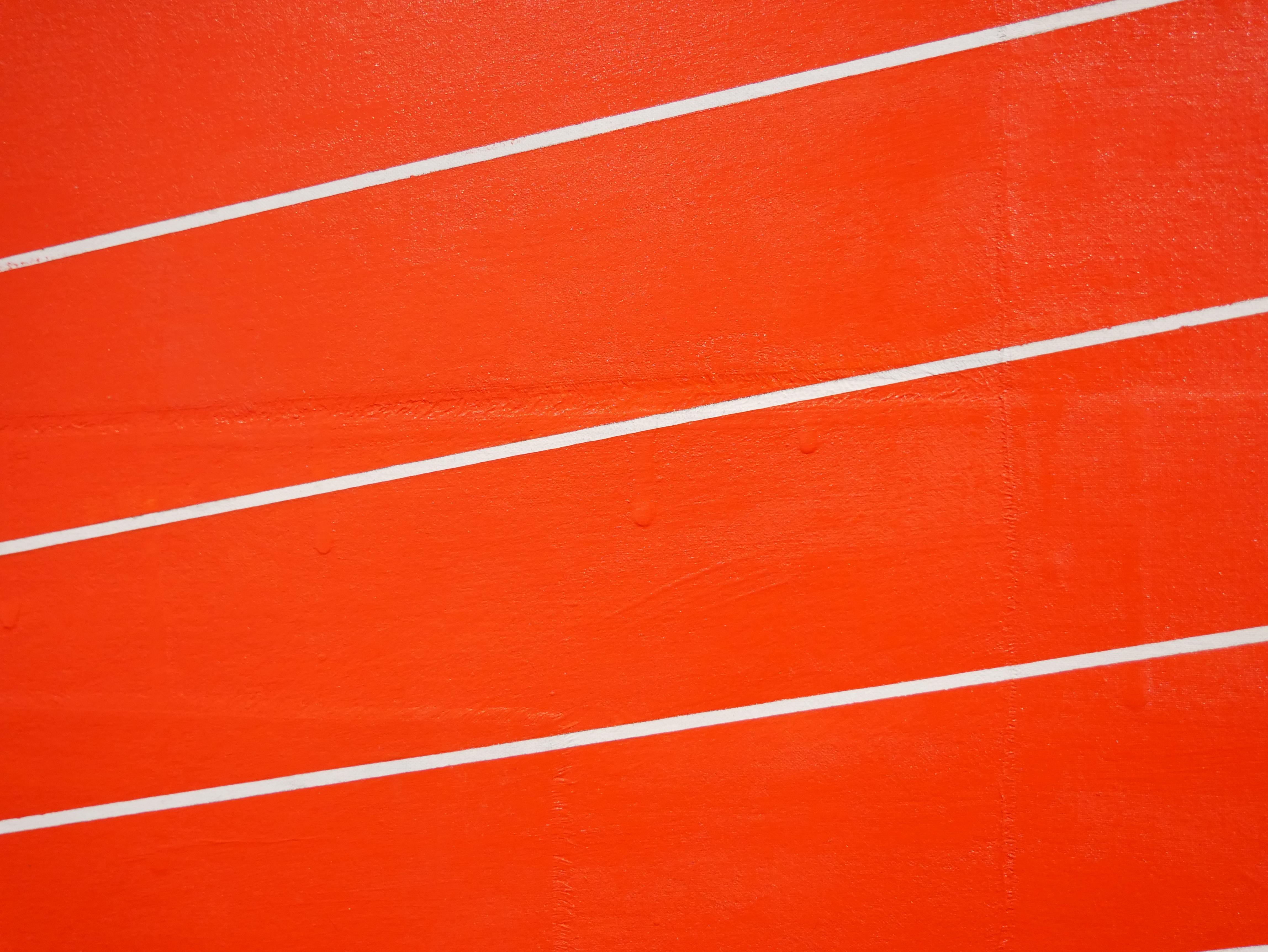Contemporary organic abstract painting by Texas-based artist Tina Ruyi. The work features red, blue, and yellow rounded cylindrical shapes in a wavy pattern reminiscent of a rolling ...