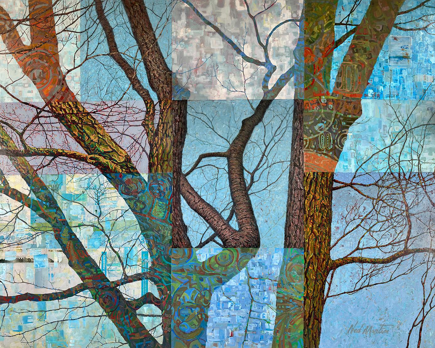 Located in Brooklyn, Ned Martin is inspired by hectic city life. His work touches on the subjects of nature and community, which are drawn from his childhood memories of rural Pennsylvania and Northern Maryland. Martin’s work is a commentary on our global society and the idea that everything is connected as one. After studying fine arts at Towson University in Maryland, Martin continued his formal art training at the Schuler School of Fine Arts in Baltimore. Embracing his training and his meticulous process, Martin continues to grind his paints. He has painted en plein air on the river Seine in Paris, Scotland, and the vineyards of Italy, all of which have shaped his artistic vision. Reclaimed aluminum printing plates have become Martin’s sole painting surface. He often leaves a bit of aluminum plate visible through the painted surface to enhance the depth of the work. “The imagery of the used printing plates is part of my expression—current social commentary that becomes embedded in the art forever,” Martin explains.