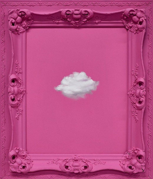 In “Just a Cloud Away,” the vibrant cobalt blue saturates both the background and the frame, creating a seamless expanse of vivid color. Like a window into a cloud.