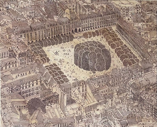 A mid-century, stylized painting of the Place du Commandant Lamy in Mougins leading to a ...