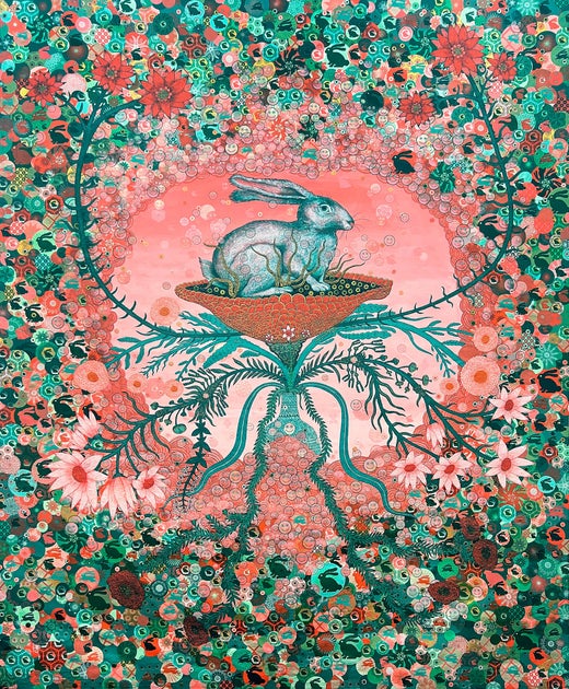 Peter Hamlin blends fantasy and science in compositions that breathe with awareness and futuristic hybridity in vibrant color, synthetic layers and meticulous, delineated systems. In Hamlin’s imagined environments, nano people, robots, cyborg plants and curious otherworldly organisms coexist. The artist’s work explores how we adapt as a species, determine our future and prepare for what’s to come as technologies radically change how humans experience and interact with the world. The precision and exactitude with which Hamlin paints seduces the viewer with beauty and beckons one into his supernatural world. Hamlin was awarded an MFA in Painting at Lehman College, Bronx, New York and a BFA in Illustration from Art Center College of Design in Pasadena, California. Hamlin lives and works in Brooklyn.