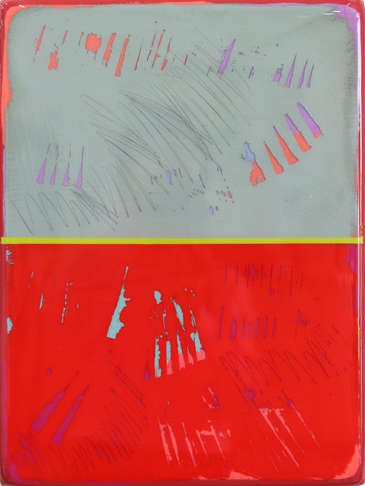 Hunt's works reflect how he brought order into the chaos of his earlier existence. Philosophy, mathematics, scientific theory, poetry, and astronomy are a few of the themes that run through his paintings and he expresses them with unique imagery. Hunt describes his contemporary imagery as, “Chaotic order pouring from the watery depths of my unconscious”. He divides his artworks into segments enveloped in a singular, intense hue. Drawing inspiration from the symbolic dualism found in the works of Kandinsky, this painting harmonizes opposing colors with a tactile finesse. The artist employs a process akin to a subtractive technique, scratching away layers to expose the latent chromatic narrative beneath.