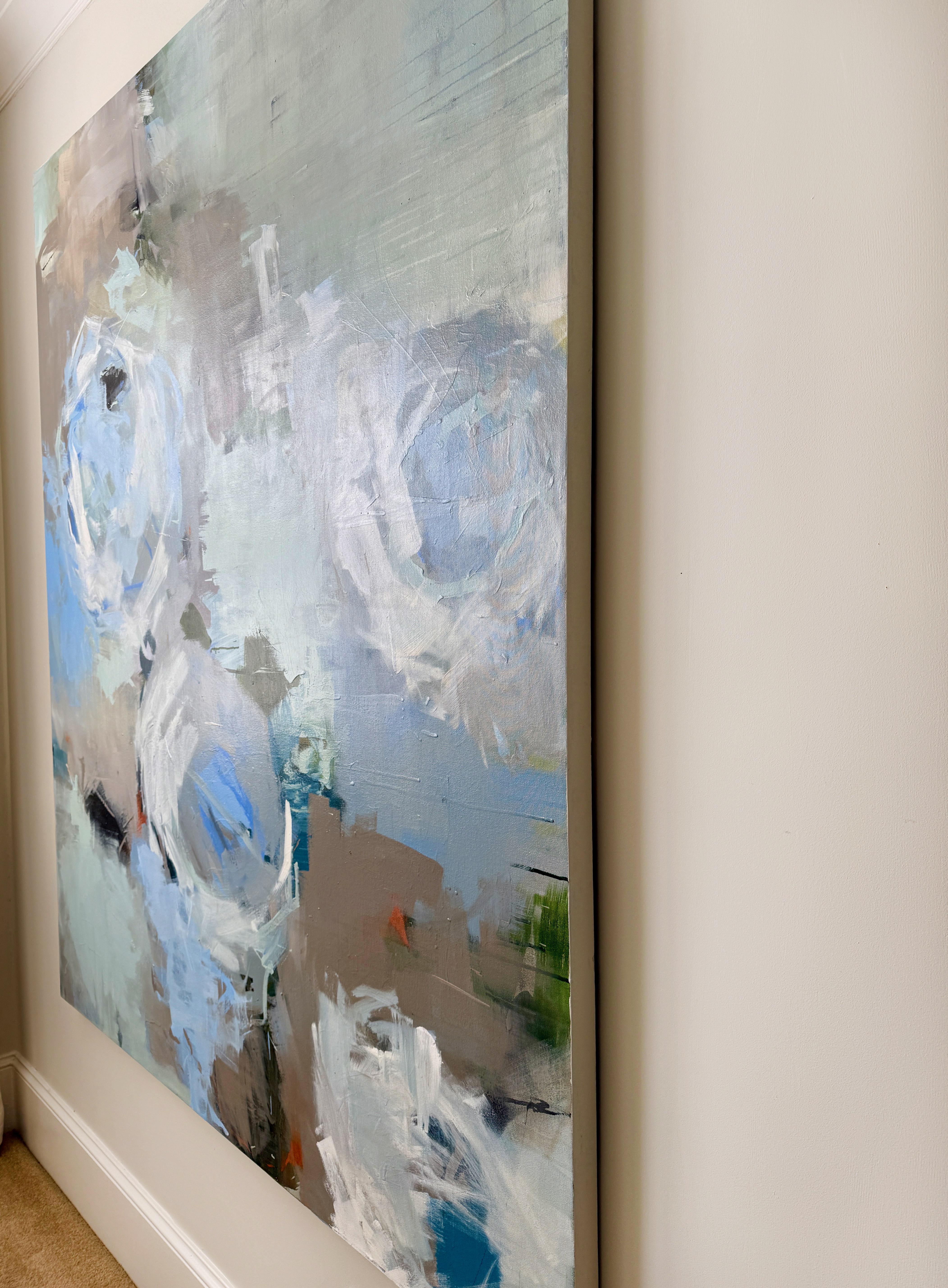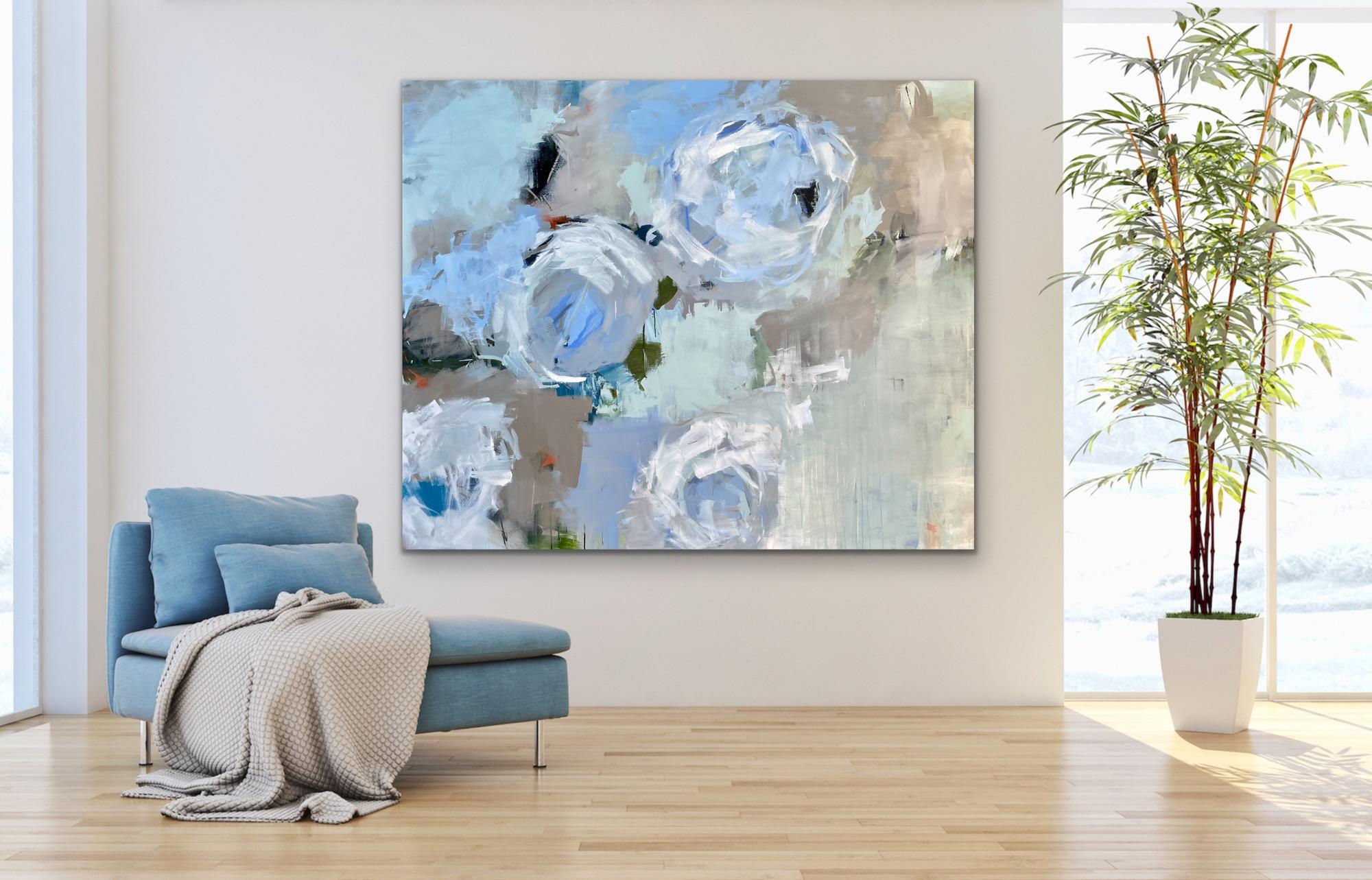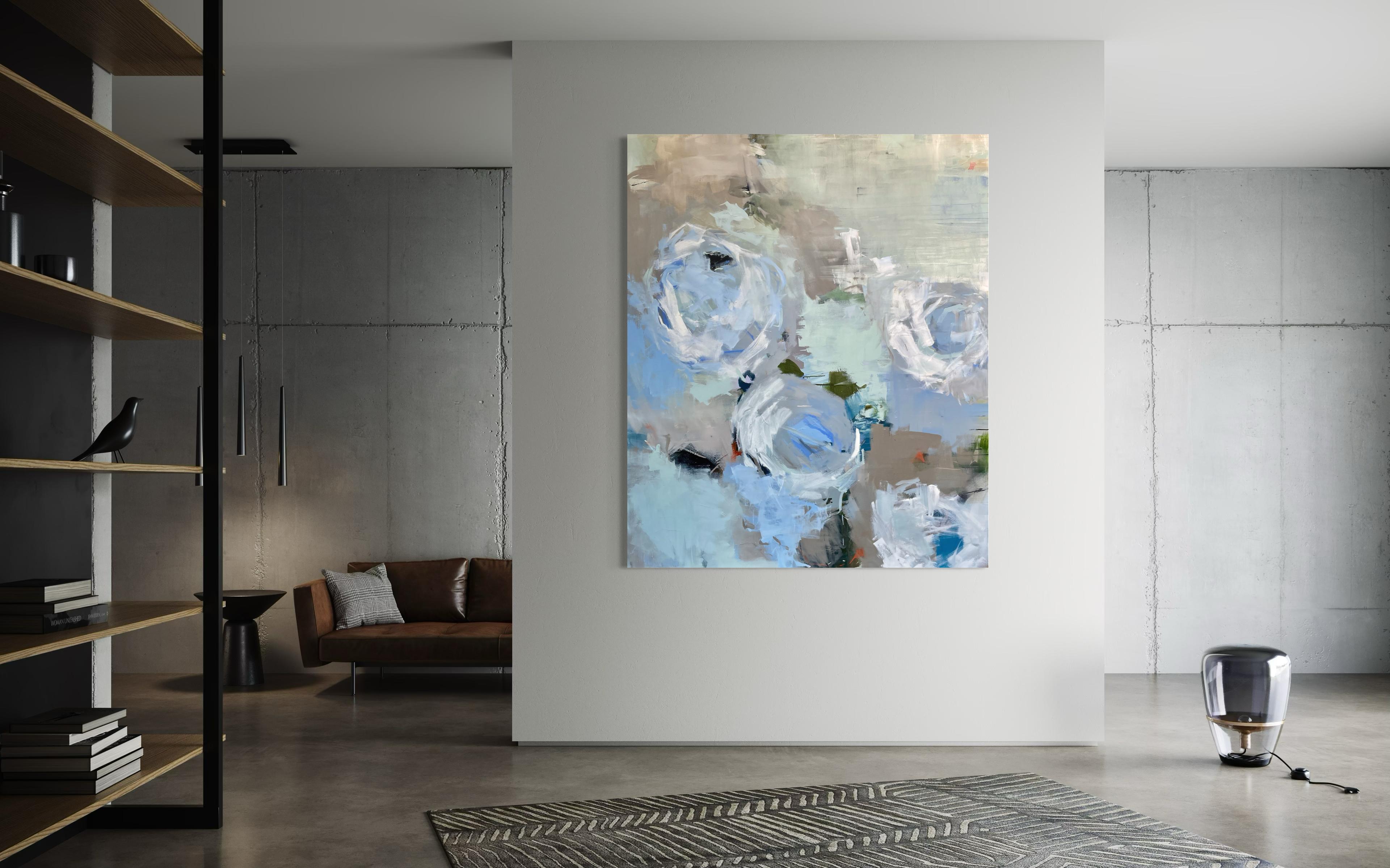 In Summer of Love, Sandy Palasti brings her signature expressive style to a vibrant yet ethereal palette of sky blues, softened whites, and grounding neutrals. This large-scale oil painting invites viewers into an abstracted floral dreamscape—an atmosphere that feels both spontaneous and serene. Palasti’s layered brushwork captures the ephemeral nature of blooms in motion, evoking a summer memory felt more than seen.