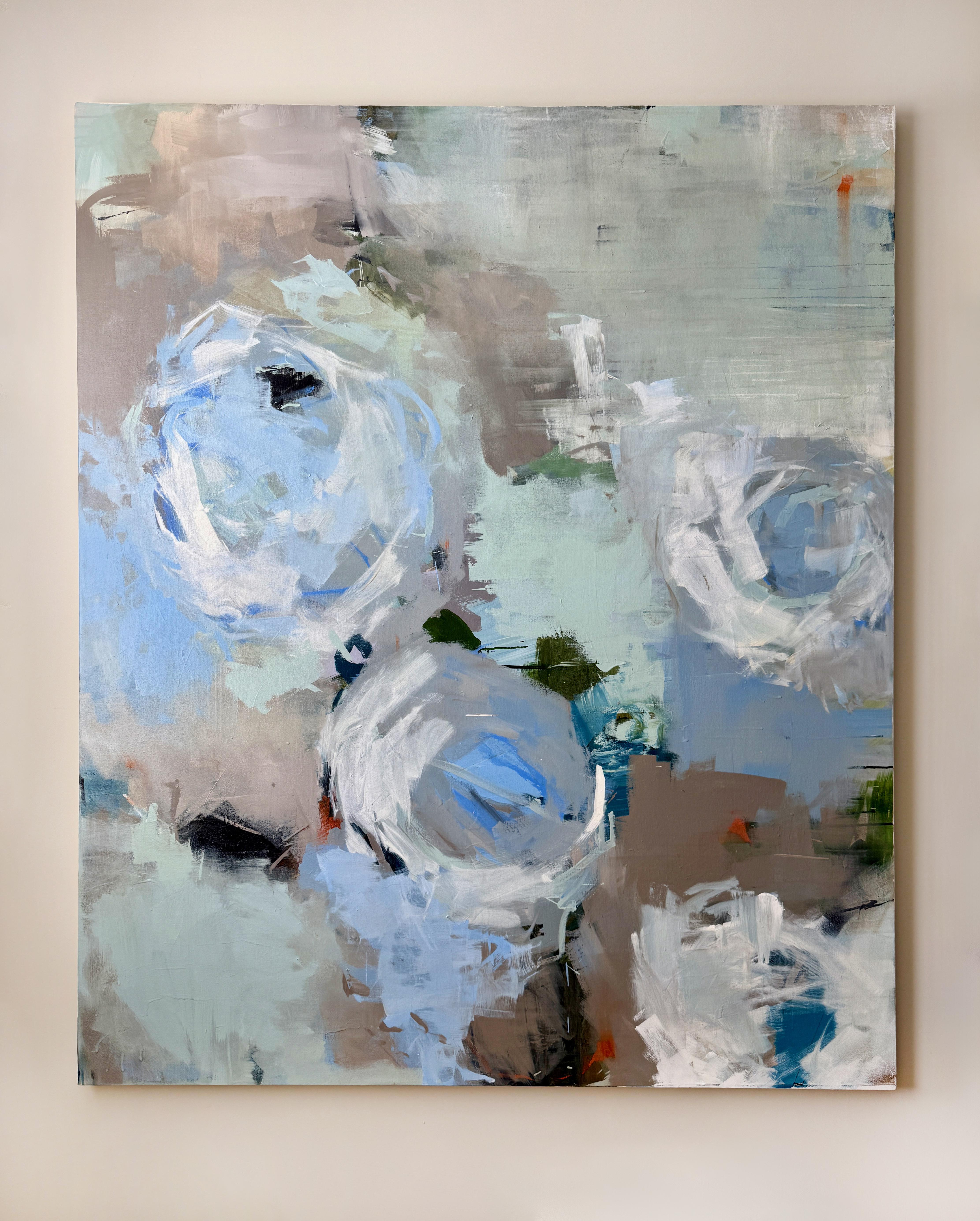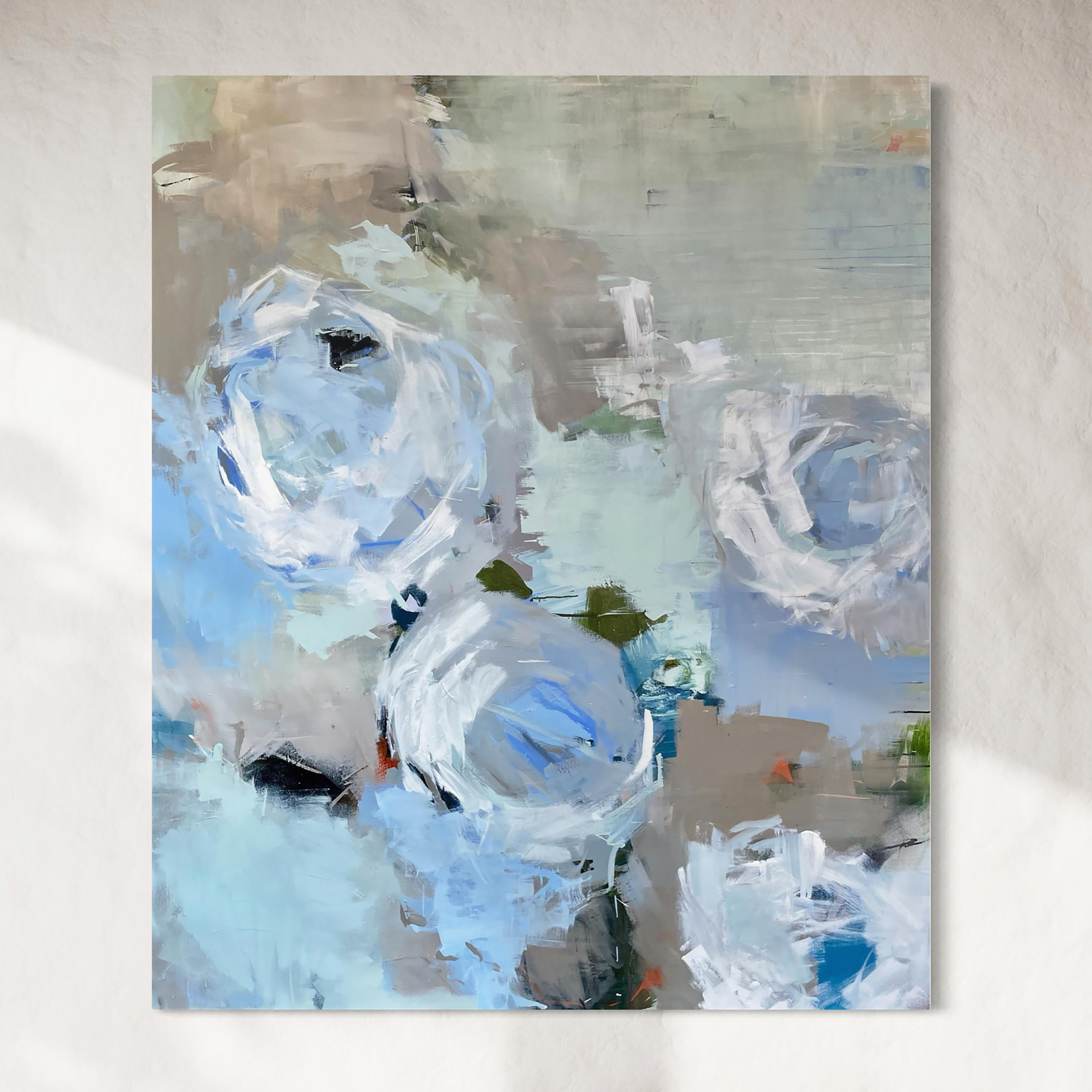 Hints of pale cobalt and soft jade peek through fields of cloud-like whites and creamy taupes, while areas of moss green and flecks of red-orange anchor the composition. The flowers, loosely suggested through sweeping gestural strokes, float in and out of focus against the muted background—balancing bold form with delicacy and light.