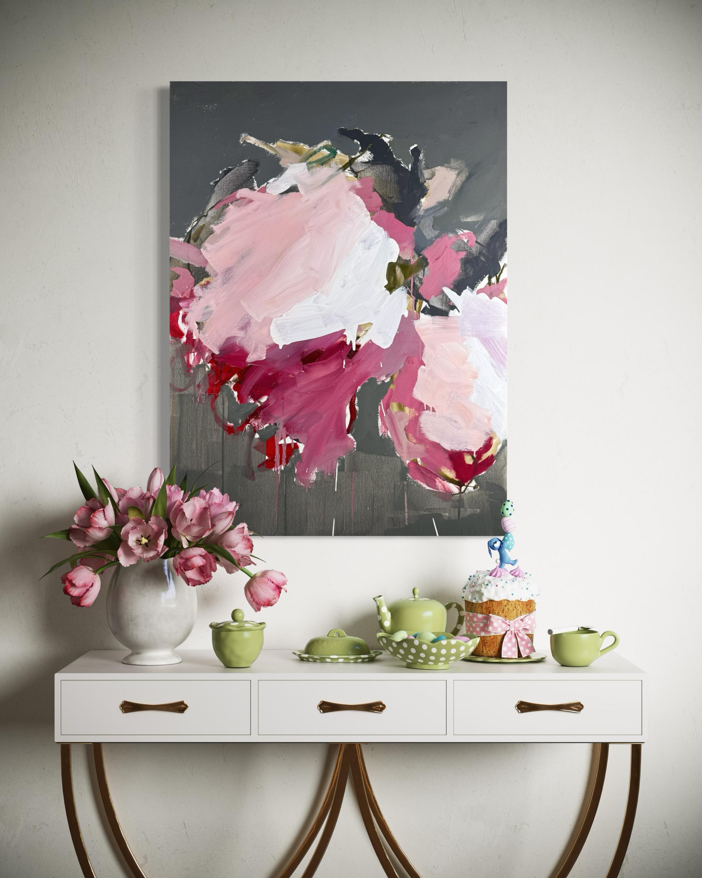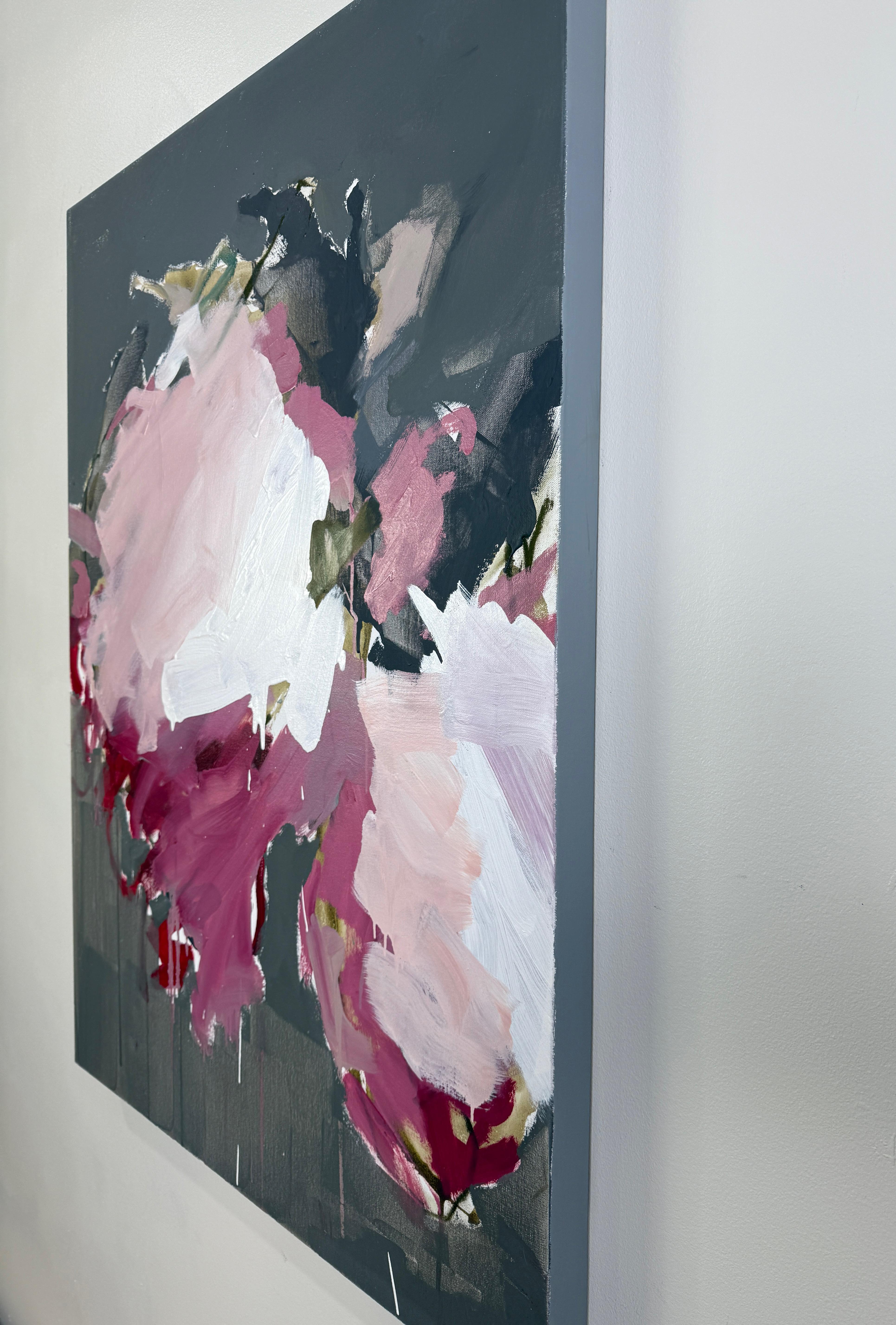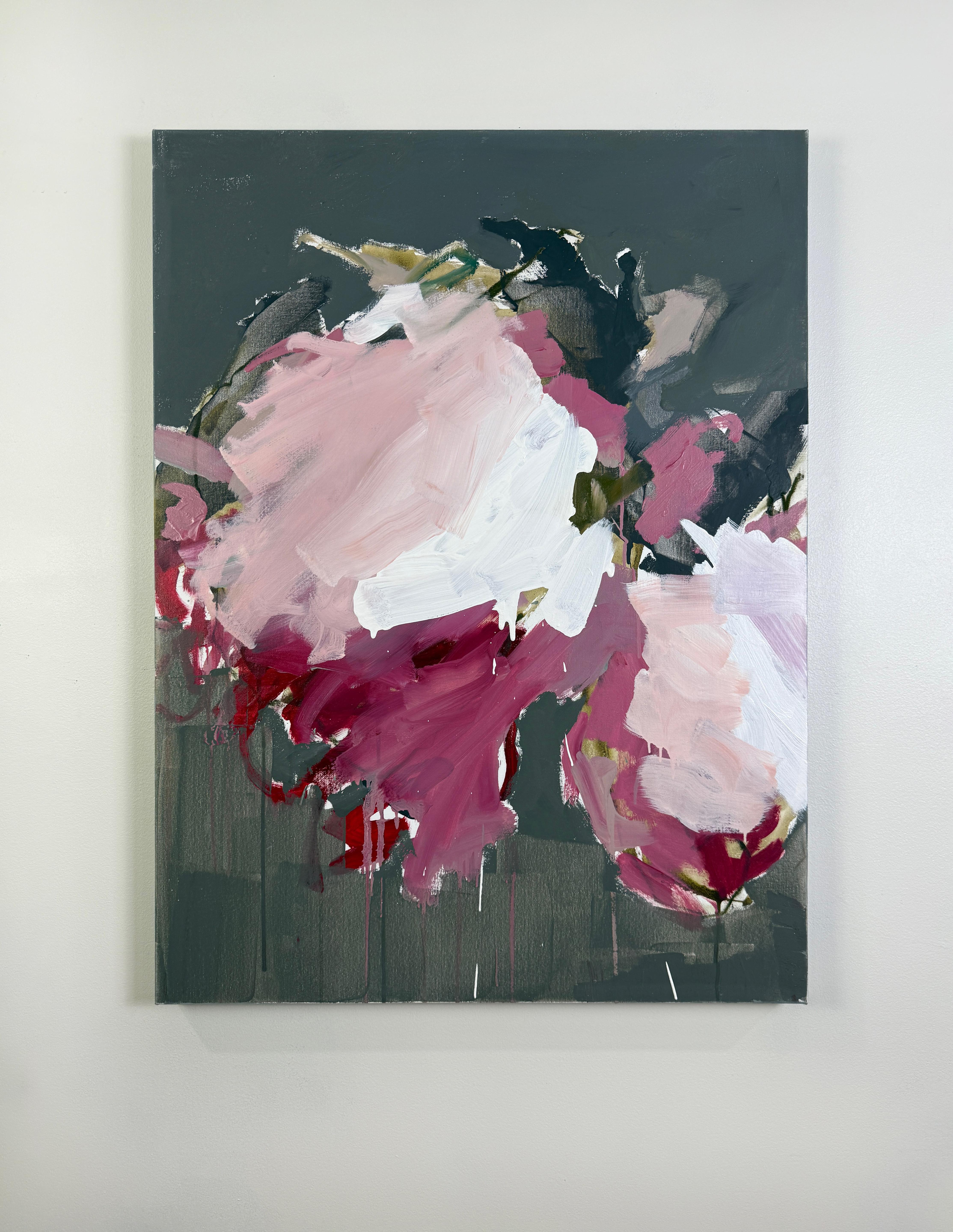 This striking abstract floral painting by Sandy Palasti, titled Wild at Heart, channels raw emotion through bold gesture and color. A dynamic composition of layered brushstrokes in deep magenta, blush pink, and soft white burst from a dark charcoal-gray background, suggesting an uncontainable bloom in full expression. Hints of crimson drip from the base, adding a visceral energy, while pale touches of lavender and olive ground the chaos in balance. Palasti’s intuitive use of palette knife and brush infuses the painting with movement and intensity, capturing a moment of vulnerability and power. This piece is painted in acrylic on canvas and is wired and ready to hang.