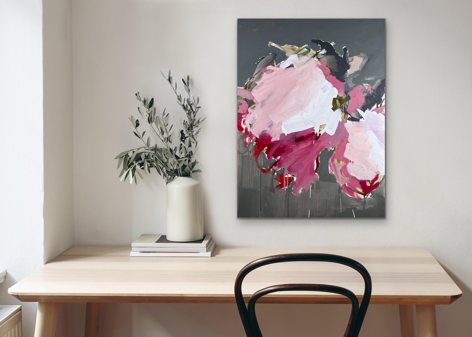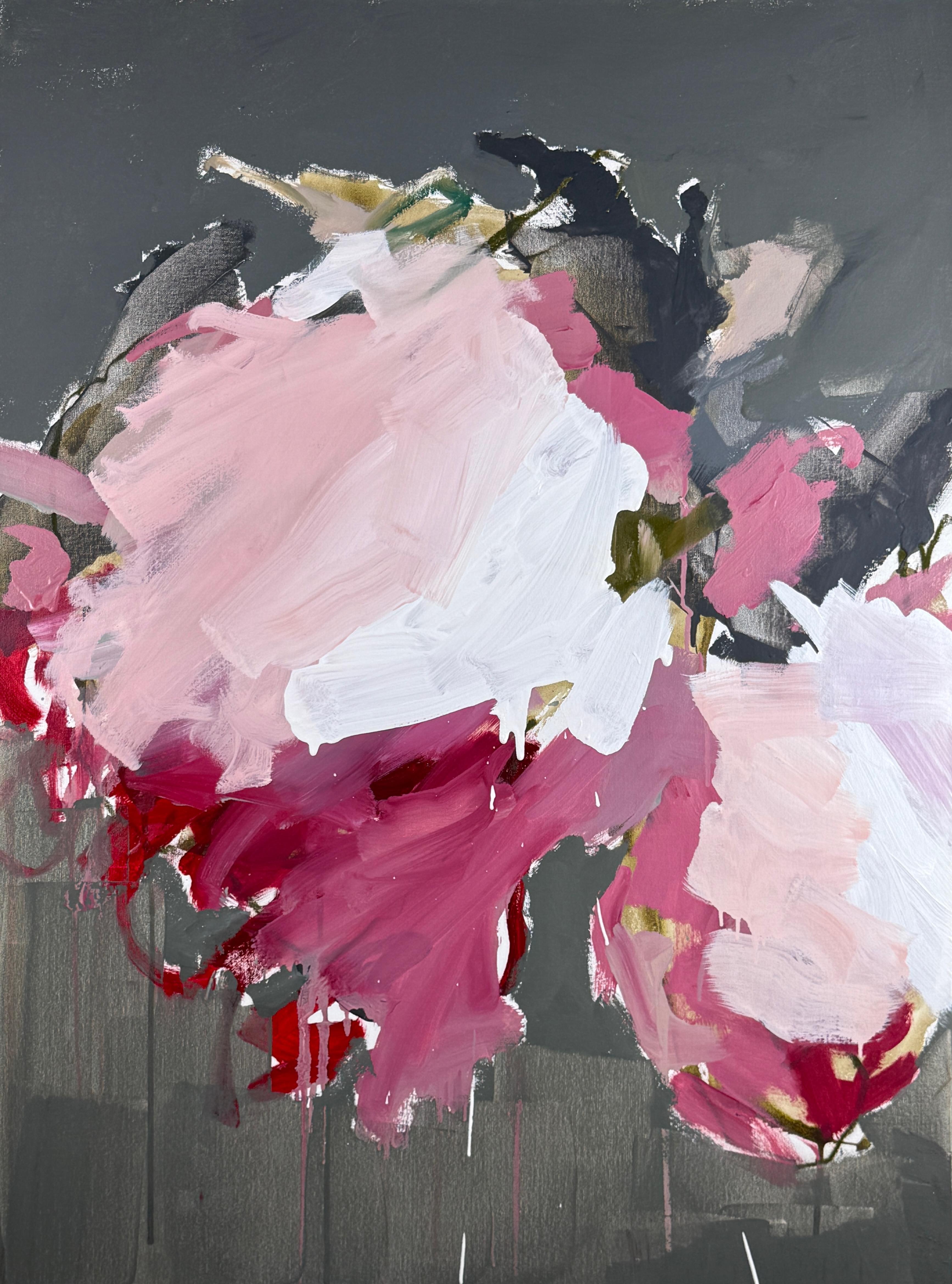 This expressive abstract floral painting by Sandy Palasti, titled Slow Burn, is a bold study in contrast, movement, and emotion. Lush strokes of crimson, blush, and magenta burst acr...