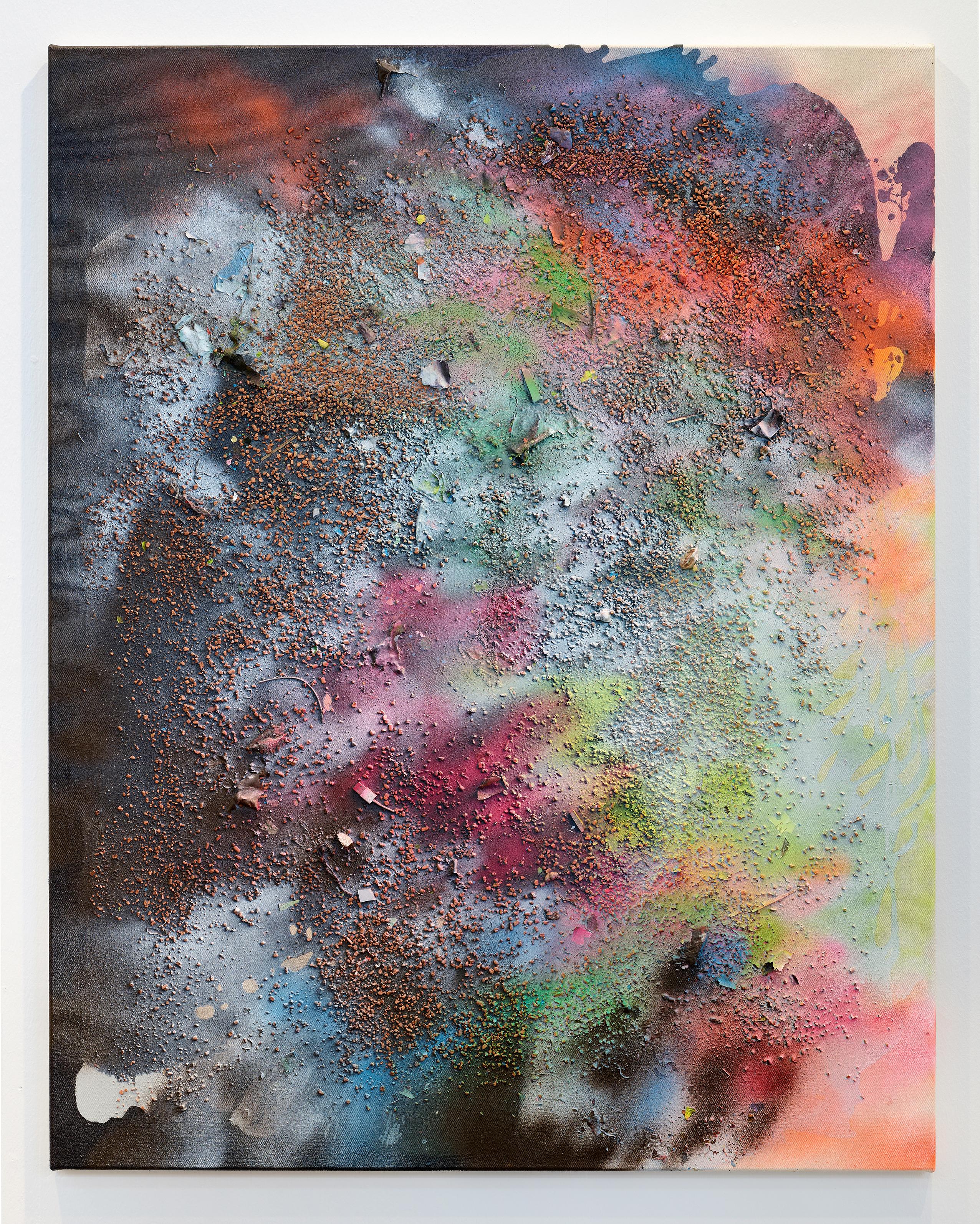 Acrylic, spray paint, collage, raw pigment on canvas.