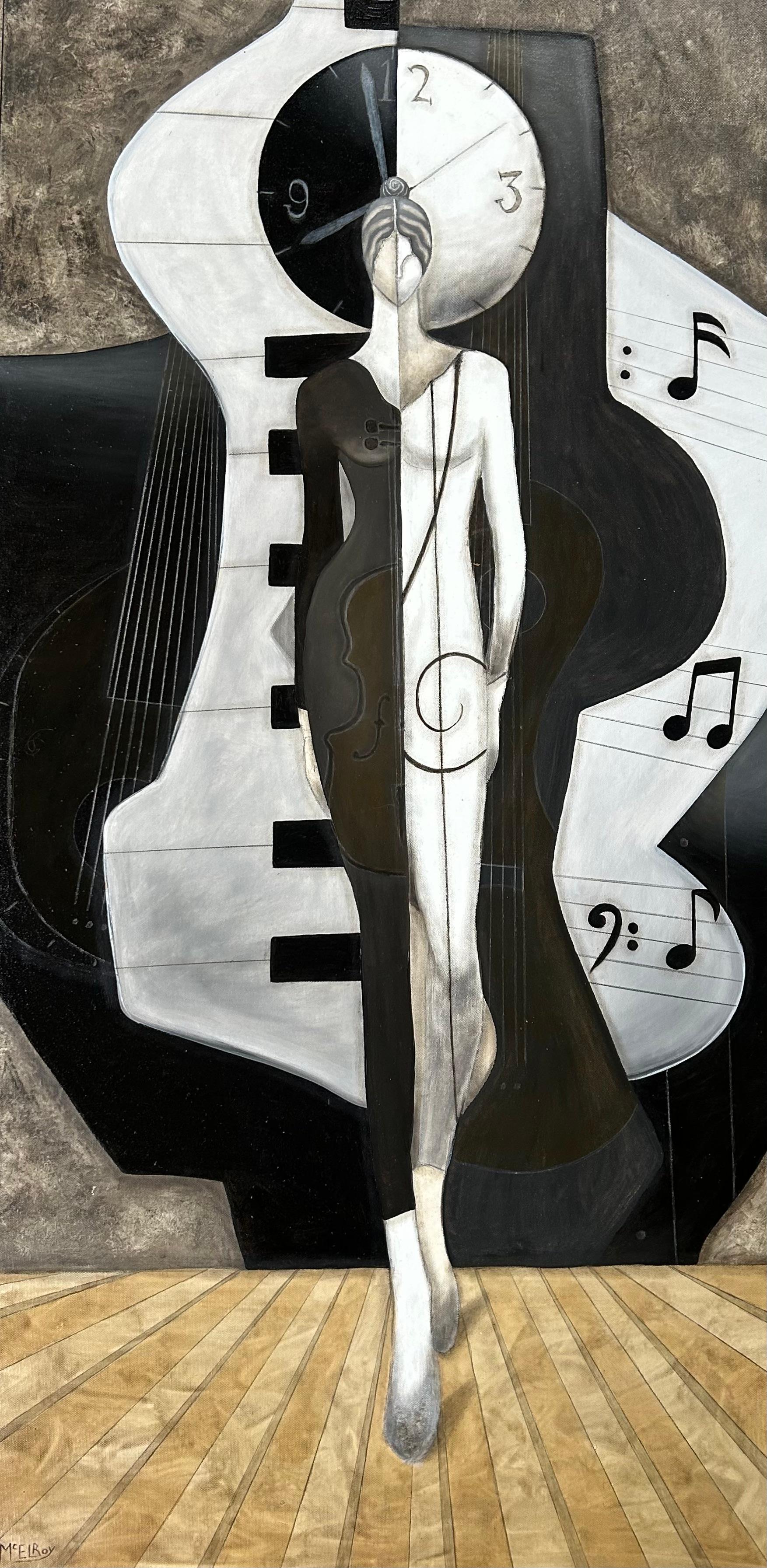 "Concerto" original abstract oil painting by Steve McElroy. The clock strikes, the curtain opens, she steps forward to perform and forever remind you of the beauty and healing powers of music! This 24 x 48 inch large oil painting is the perfect size for the music room, over the fireplace, in the entry, or wherever you'd like something striking, beautiful and unusual in your interior design. This oil painting is sure to capture the eye in a room in which you expect something different and elegant. A celebration of music! All handmade by the artist and signed front and back.