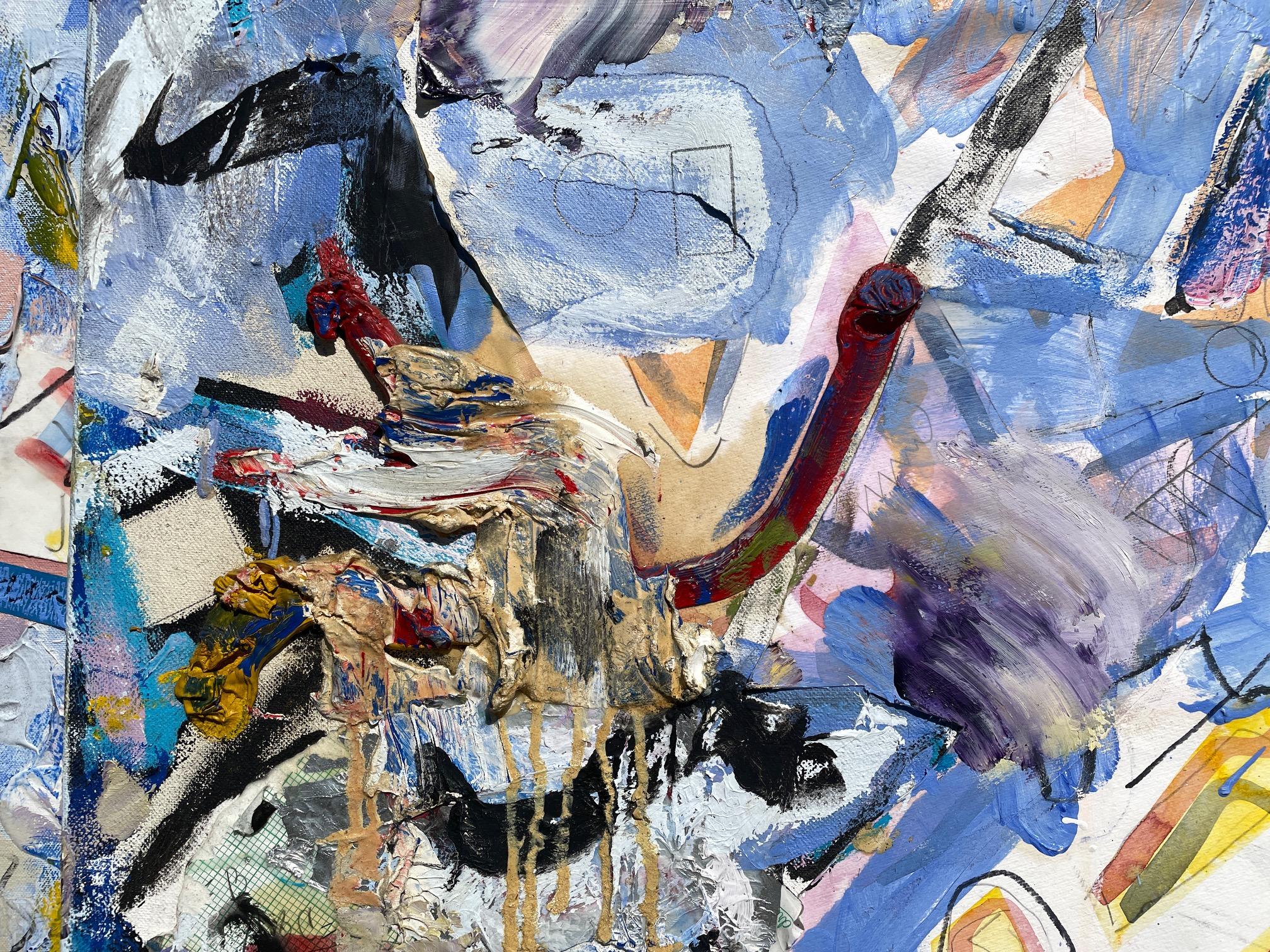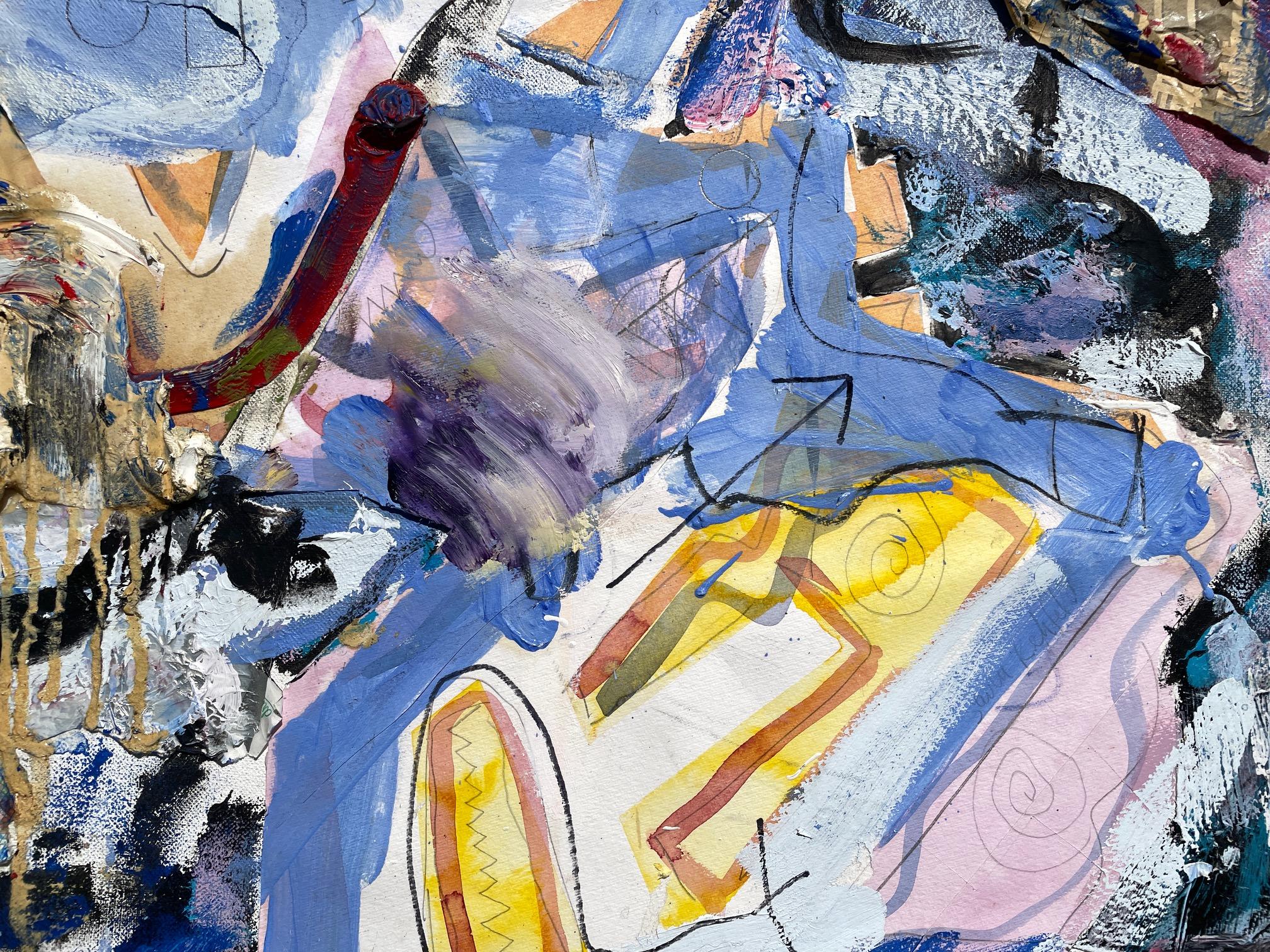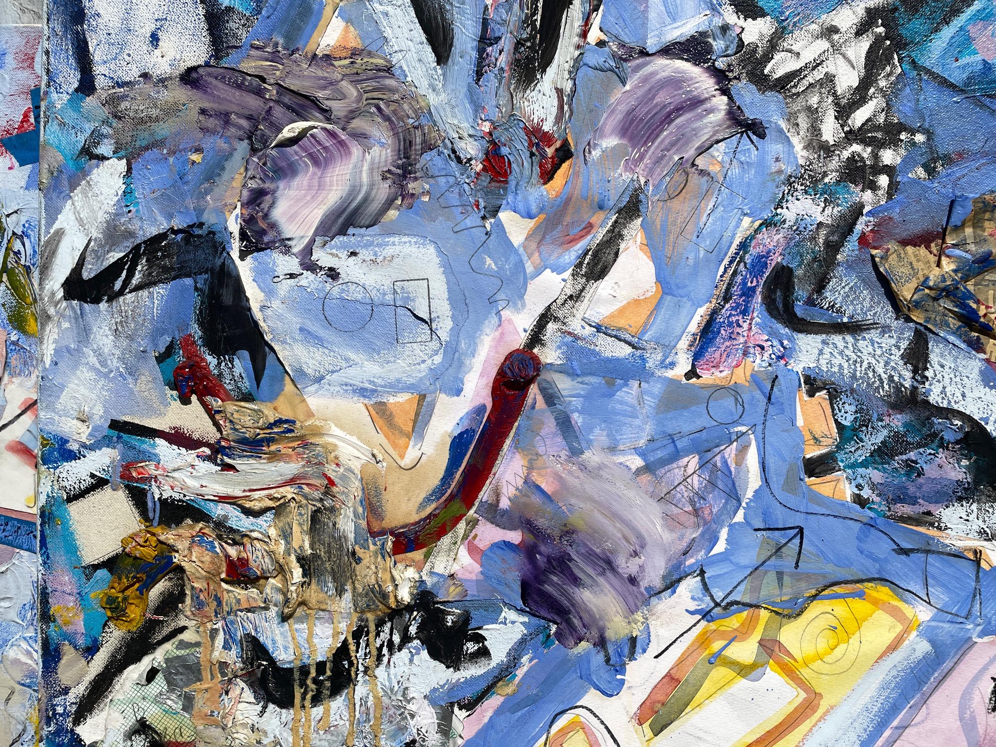 “The Ocean” is an early mixed-media work by Steven H. Rehfeld, created in 1998 and full of the raw, expressive energy that defines his practice. Layers of blue, lavender, white, and deep indigo collide with gestural marks, textured surfaces, and unexpected flashes of yellow and red. The result is a composition that feels both turbulent and luminous, echoing the movement and unpredictability of the sea. Rehfeld blends oil, collage, and vigorous line work to build a surface that rewards slow looking. Thick strokes meet delicate graphite marks, while areas of scraped paint and dripping textures add depth and atmosphere.